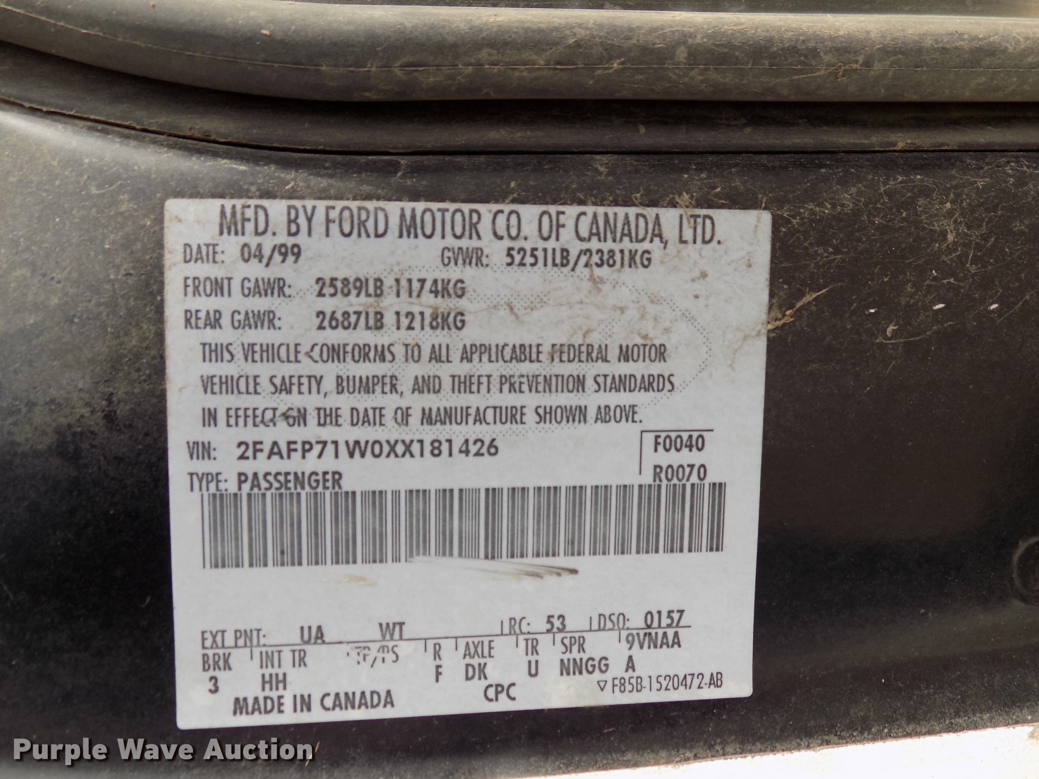 Purple Wave is selling a used Passenger Vehicle in Kansas. This item is a 1999 Ford Crown Victoria Police Interceptor with the following: 92,244 miles on odometer, 4.6L V8 SOHC 16V gas engine, Automatic transmission, AC and heat, Tilt, Cruise, AM/FM, Power locks and windows, Cloth interior, 225/60R16 tires