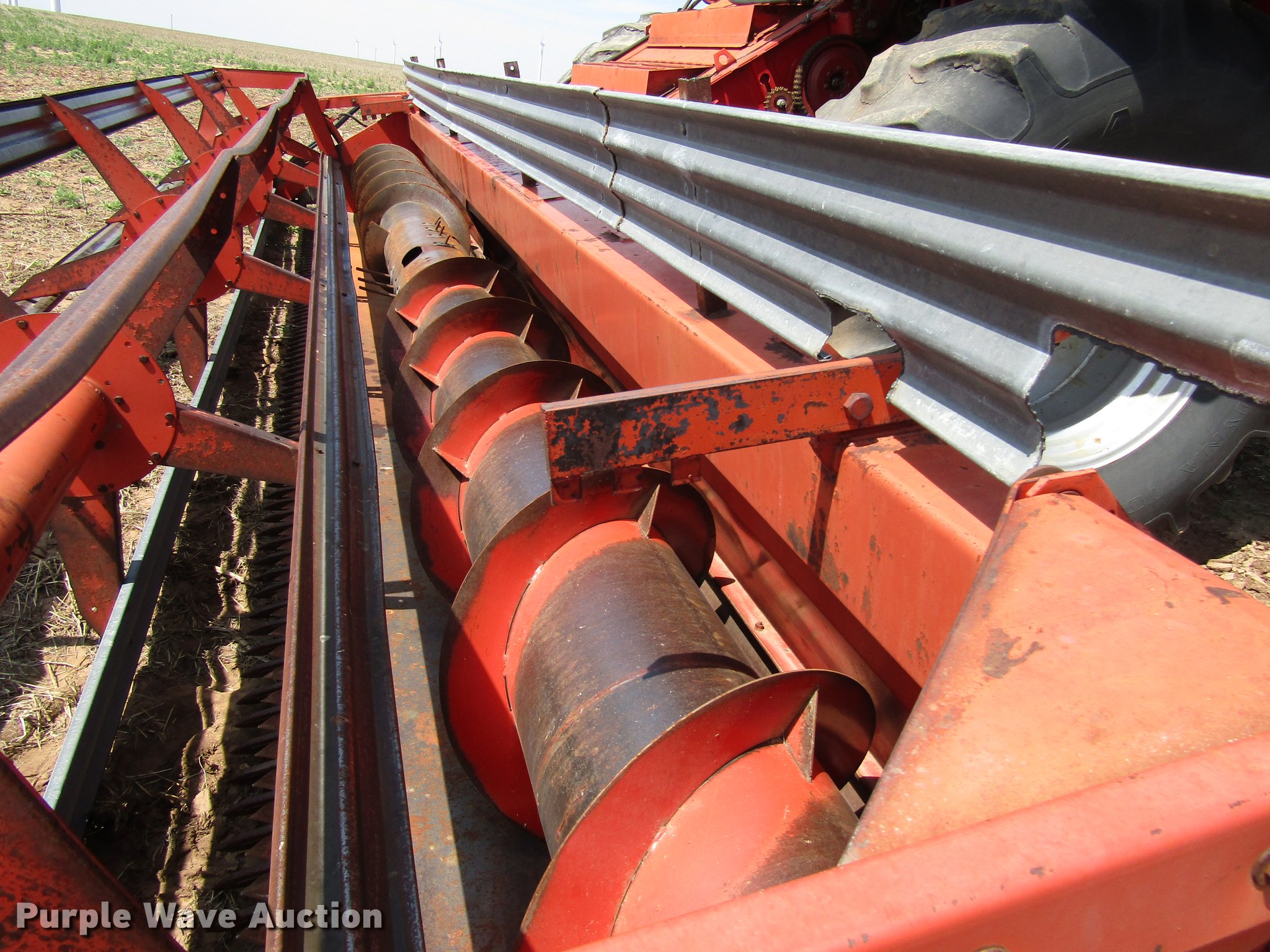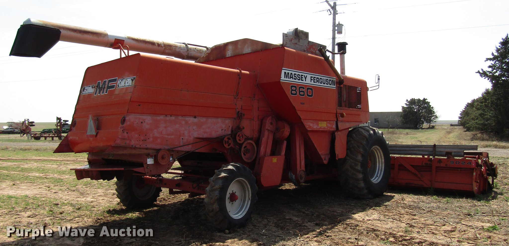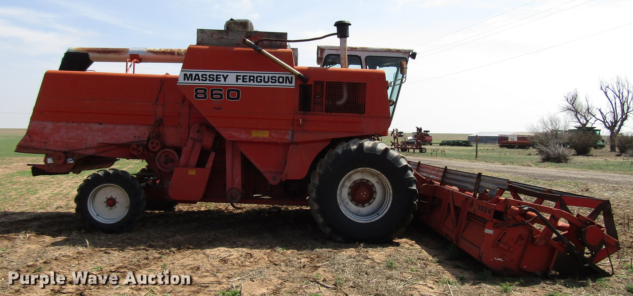 Purple Wave is selling a used Combine in Texas. This item is a 1983 Massey-Ferguson 860 combine with the following: 2,938 engine hours on meter, Six cylinder diesel engine, Serial TUU687245J, Hydrostatic transmission, 4F-2R gears, AC and heat, Tilt steering wheel, AM/FM, Suspension seat, Straw chopper, Work lights, Massey-Ferguson 9024 rigid head, 24'W, Bat reel, Hydraulic reel height control, Single driveline, Serial 000171D, 24.5-32 front tires, 12.4-24 rear tires, Dead battery, Serial 174616900