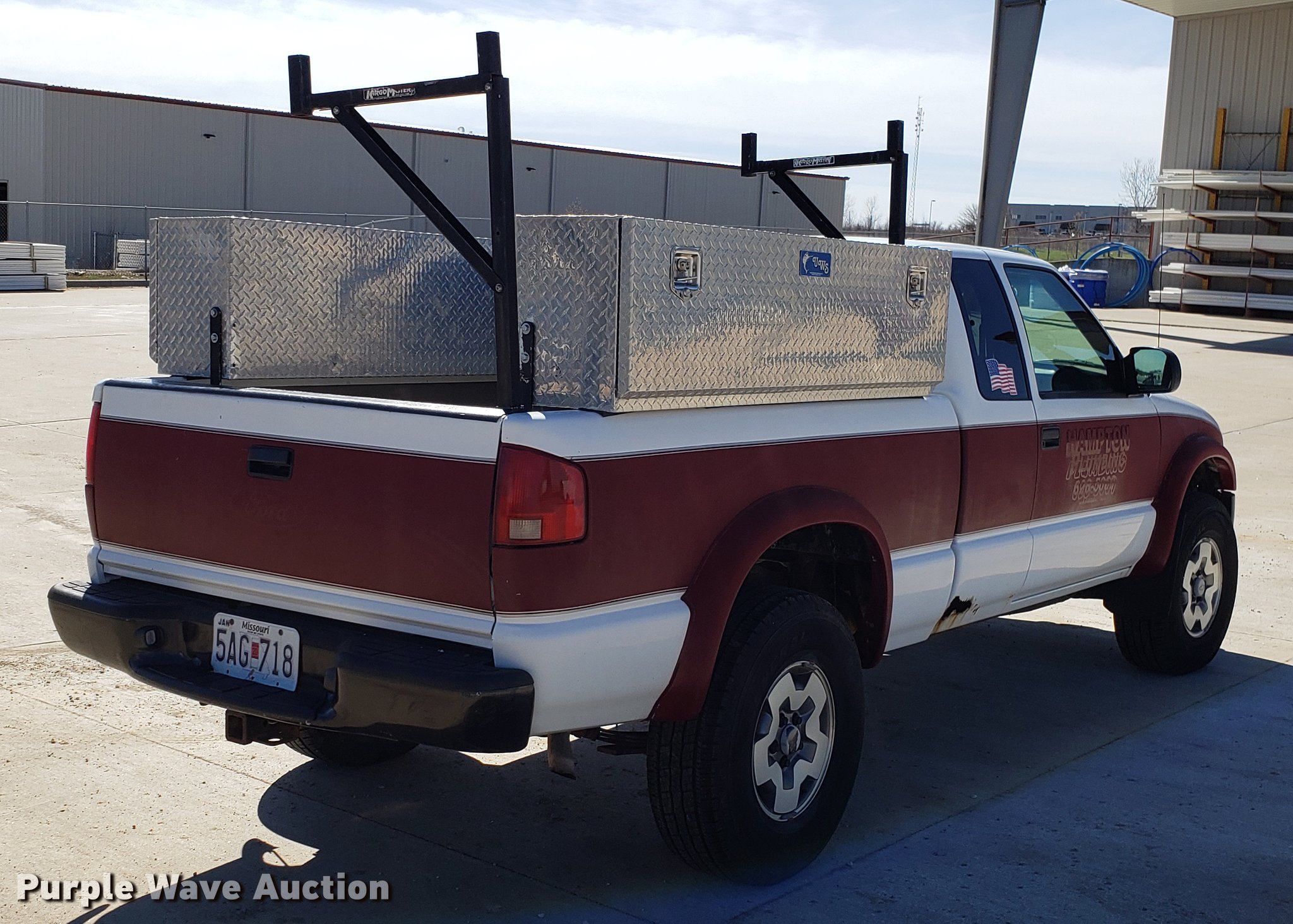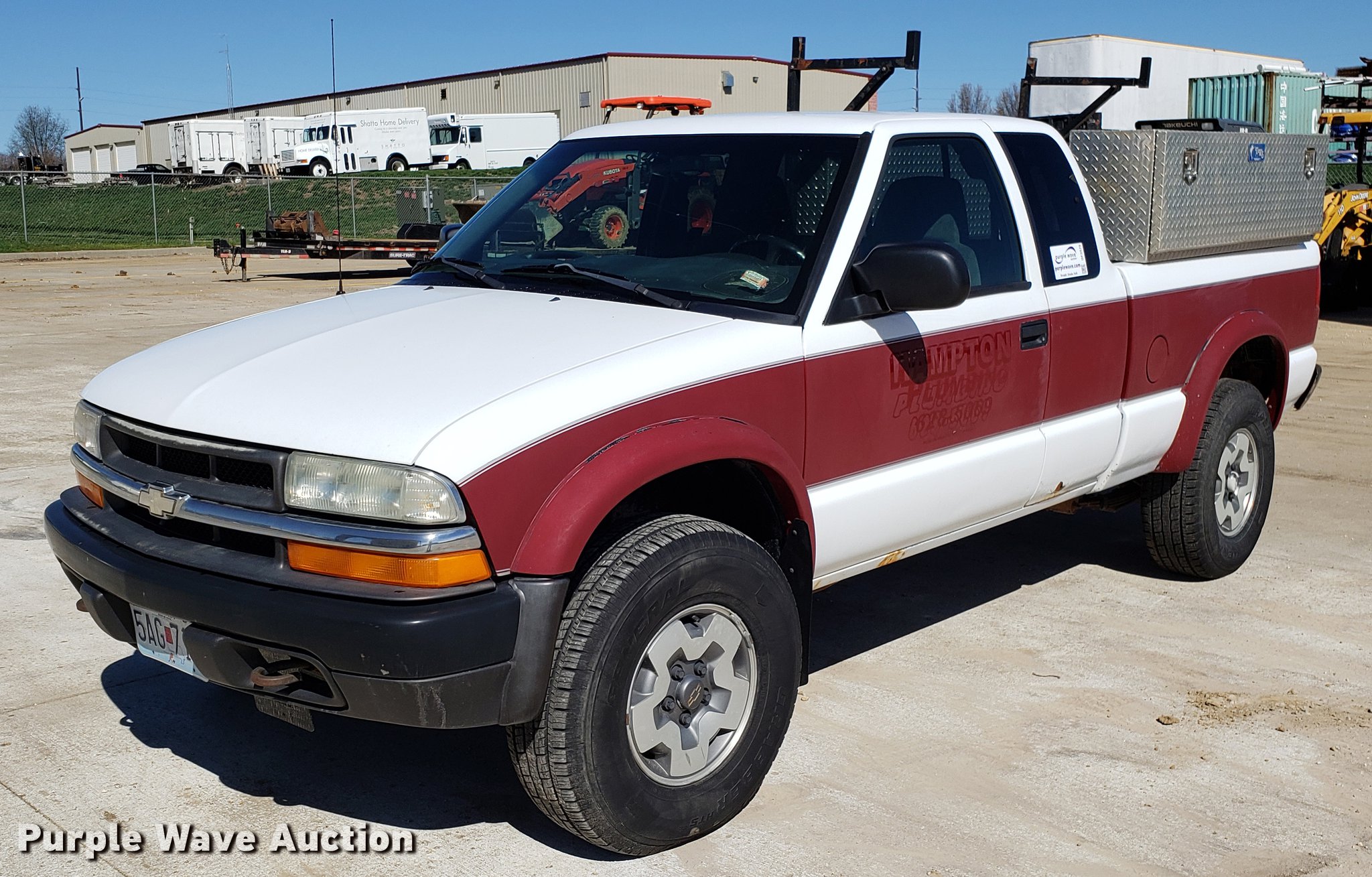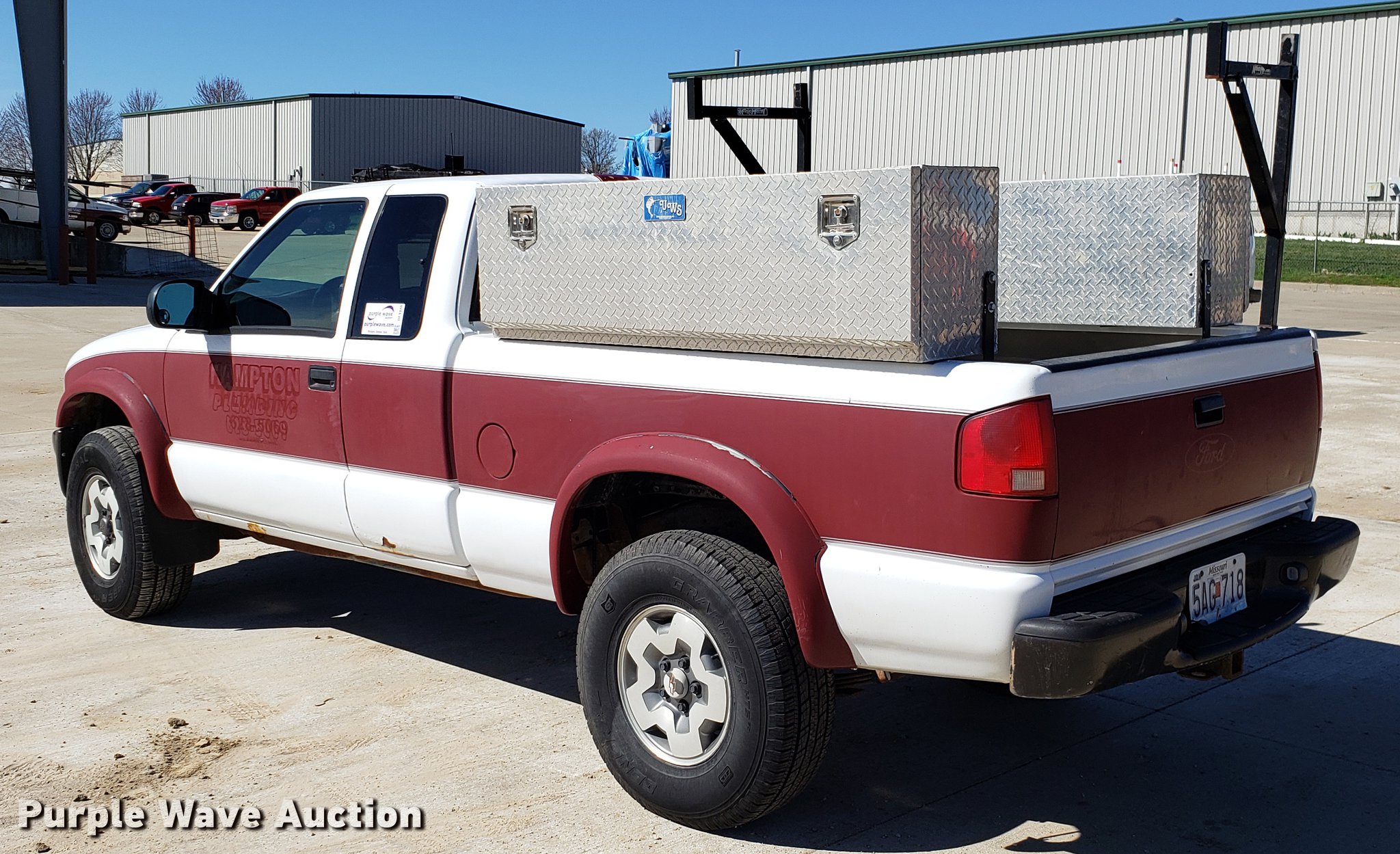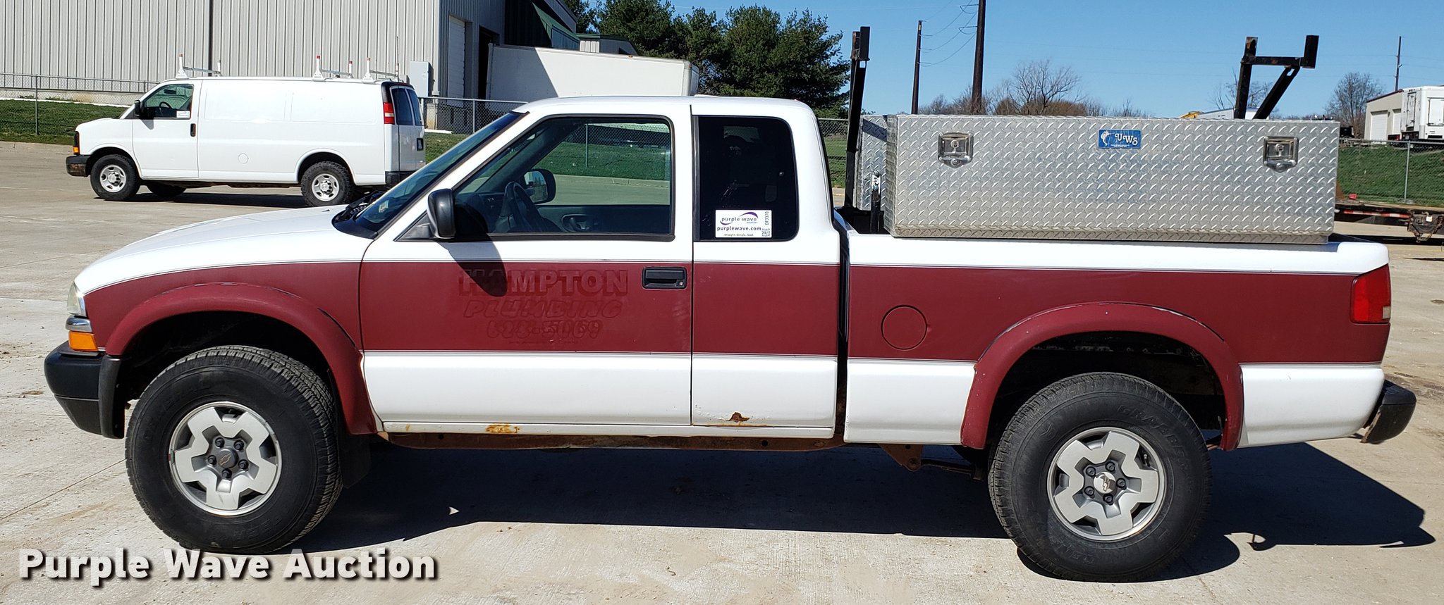 2002 Chevrolet S10 Ext. Cab pickup truck. 121,261 miles on odometer, 4.3L V6 OHV 12V gas engine, Automatic transmission, Four wheel drive, AC and heat, Tilt, Cruise, AM/FM/CD, Power windows, locks, and mirrors, Cloth interior, Toolbox, Receiver hitch, Trailer wiring, 265/75R15 tires, Check engine light on. Missouri title. 1GCCT19W628260747. Hampton Plumbing, Inc.. 1026 W Innovation Dr. Kearney, MO 64060