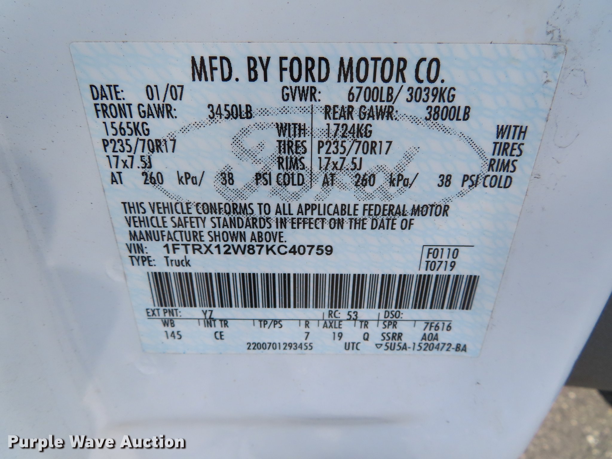 Purple Wave is selling a used 1/2 Ton Pickup or Van in Kansas. This item is a 2007 Ford F150 SuperCab pickup truck with the following: 232,053 miles on odometer, 4.6L V8 SOHC 16V gas engine, Automatic transmission, AC and heat, Cruise, Power windows and locks, 235/70R17 tires, Cracked windshield, Check engine light on, Engine misfire, Unit# T41