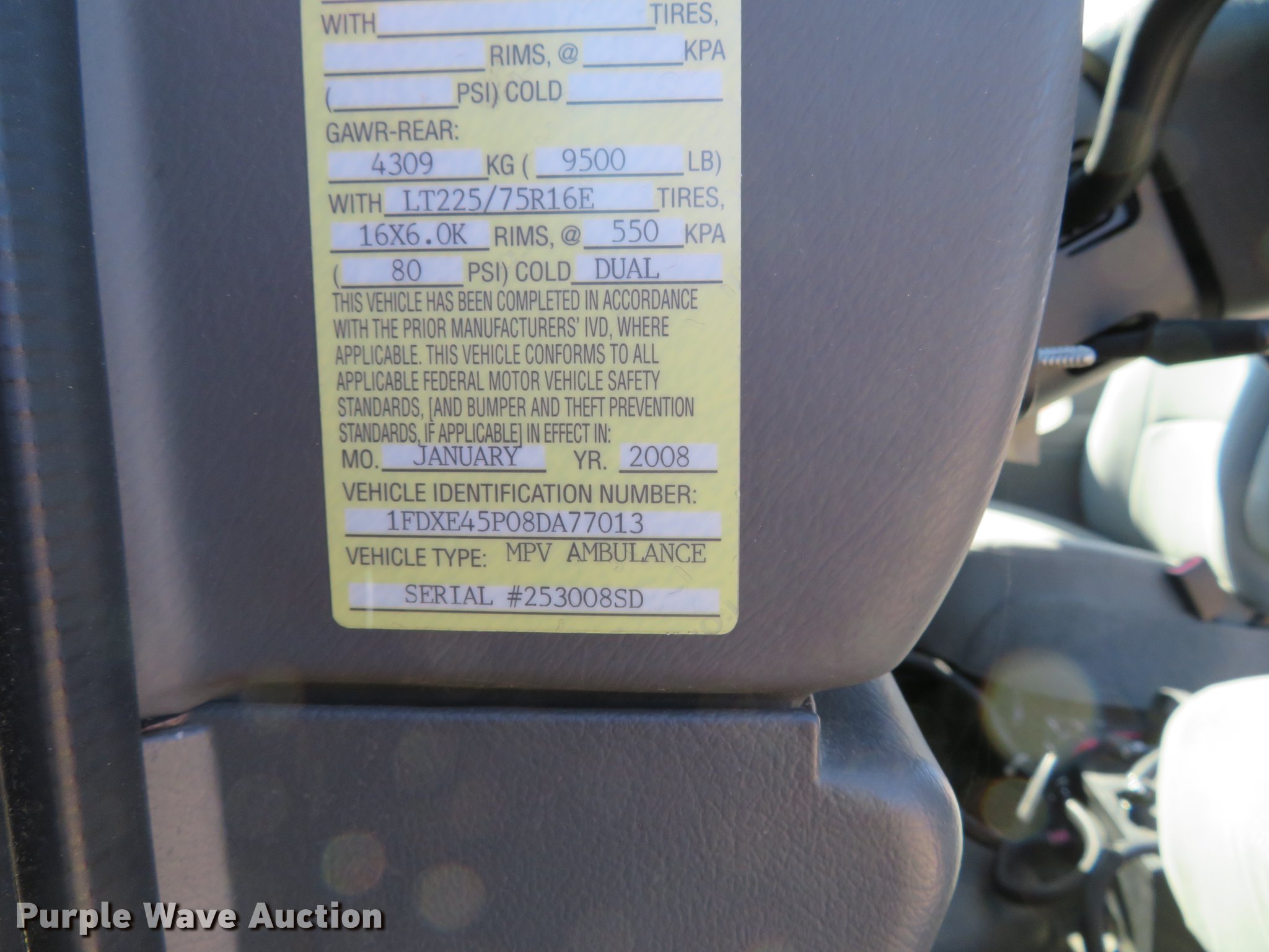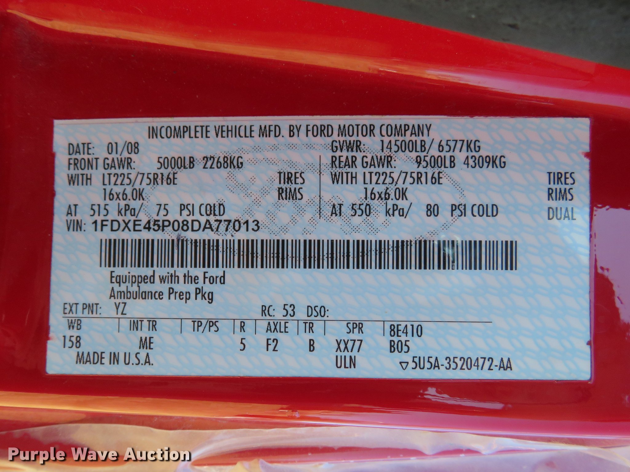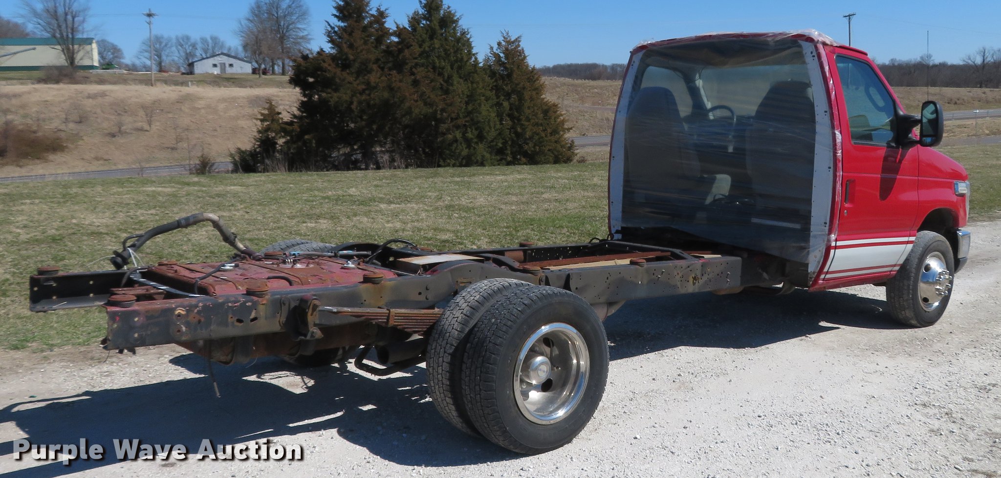 Purple Wave is selling a used Truck Chassis in Missouri. This item is a 2008 Ford E450 cab and chassis with the following: 56,974 miles on odometer, 6.0L V8 OHV 32V turbo diesel engine, Automatic transmission, Single axle, AC and heat, Cruise, AM/FM/CD, Power windows and locks, 165" from rear of cab to end of frame, LT225/75R16 tires, GVWR 14,500 lbs, Non-operational AC, may need recharged, Check airbag light on, Passenger door will not open from exterior, Decals have been removed