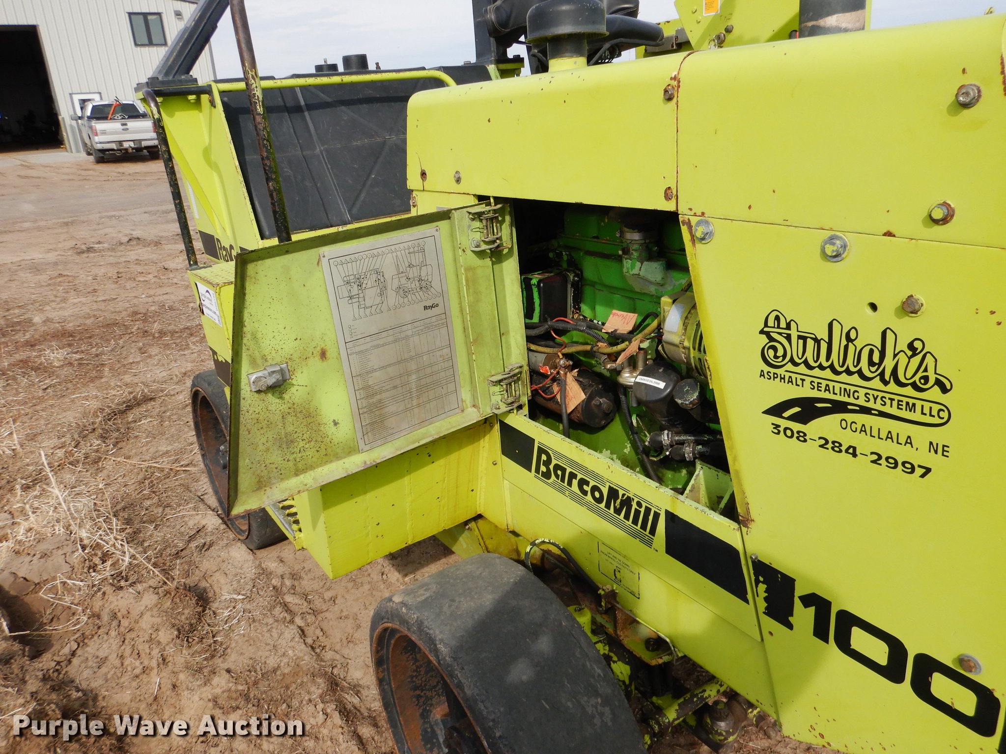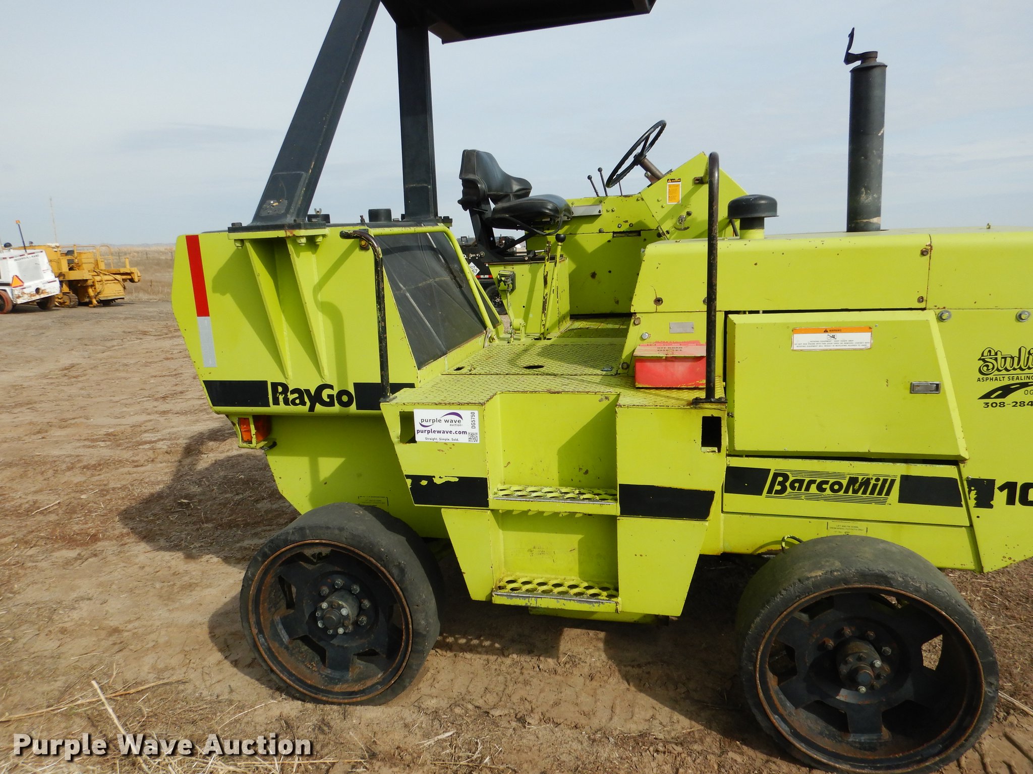 1991 Raygo Barco Mill 100 milling machine. 3,766 hours on meter, Four cylinder diesel engine, Hydrostatic transmission, Four wheel steer, Suspension seat, 12"W head, Angle adjust cutting drum, Water holding capable Unknown operating condition, Steel wheels, 24"L x 9"W tires, Serial U010930781. Stulich Asphalt/Shelco Construction. 594 E Rd T. Paxton, NE 69155