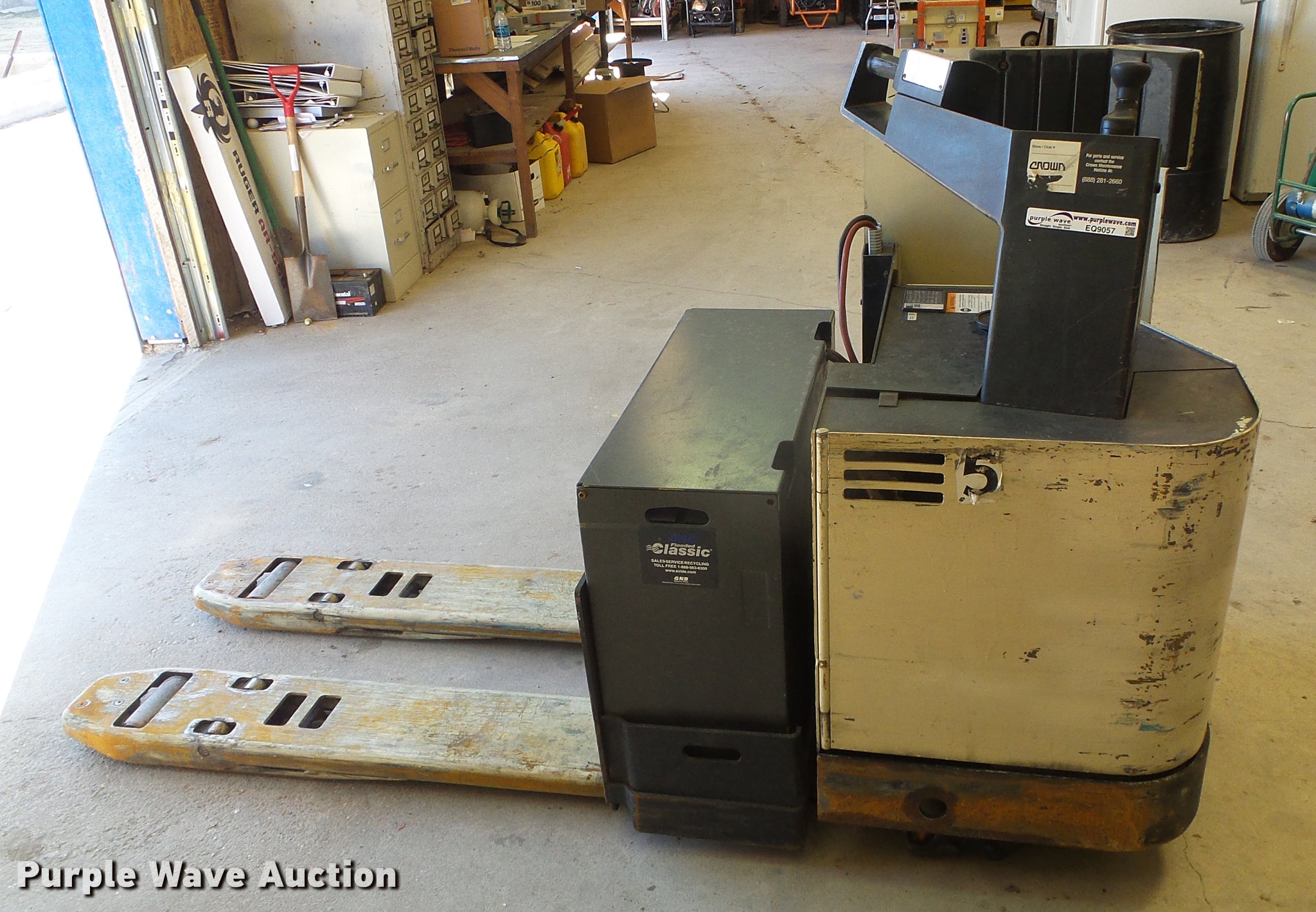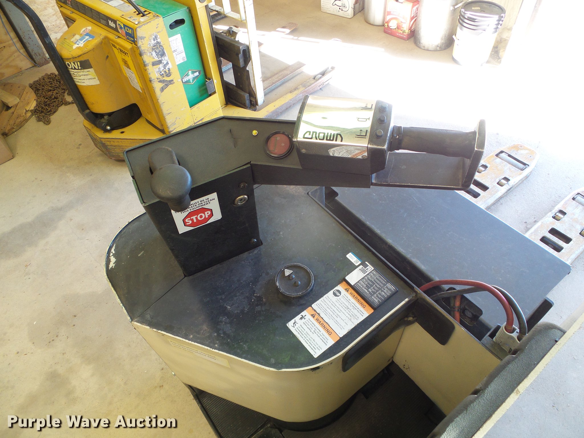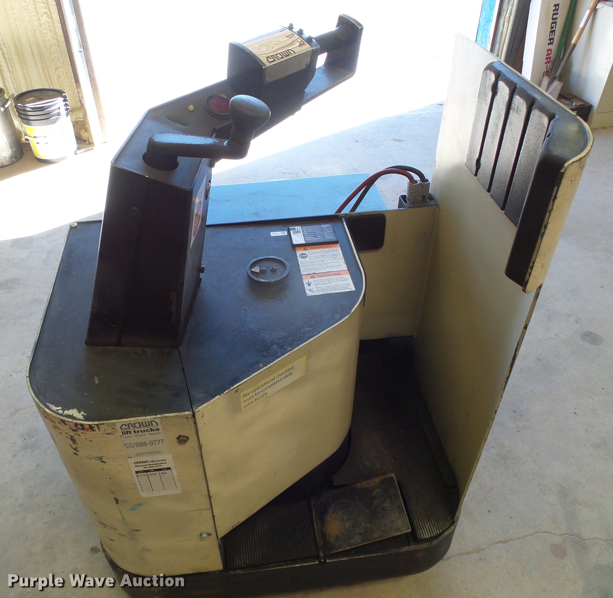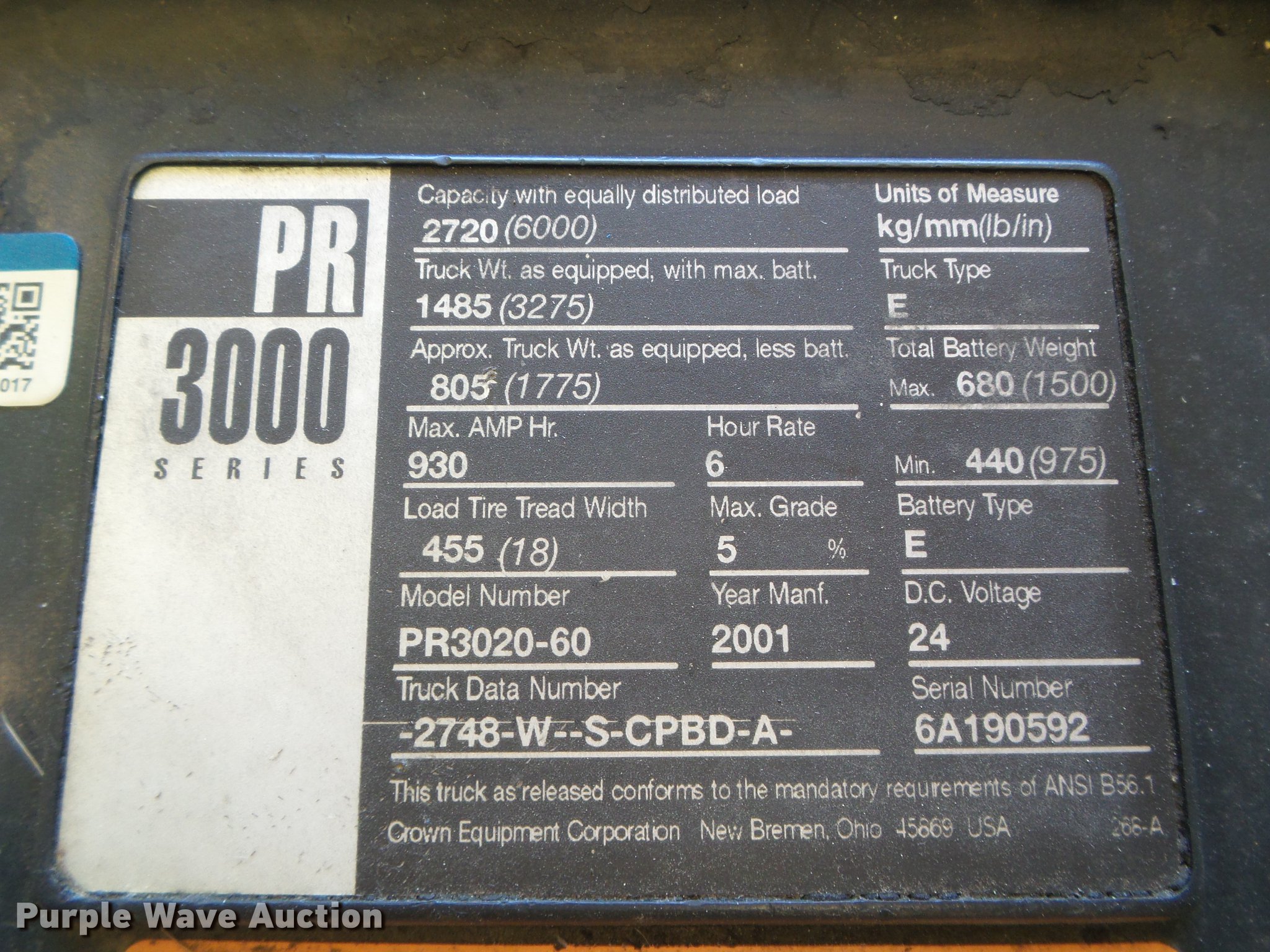 Purple Wave is selling a used Warehouse Forklift in Kansas. This item is a 2001 Crown PR3020-60 pallet jack with the following: 24V electric motor, Hydrostatic transmission, 1F-1R gears, 6,000 lbs max lift capacity, 48" fork length, Solid tires, Serial 6A190592