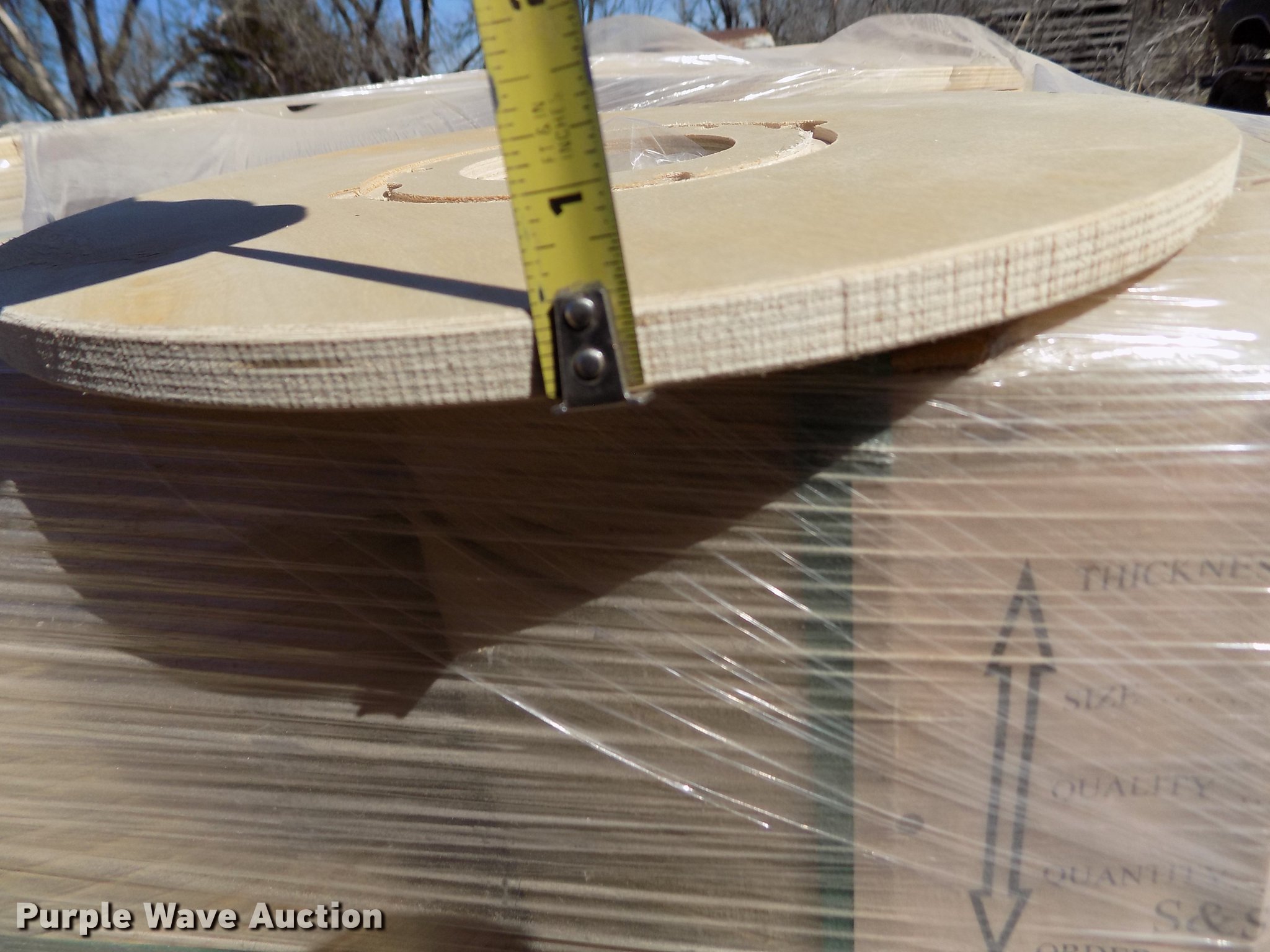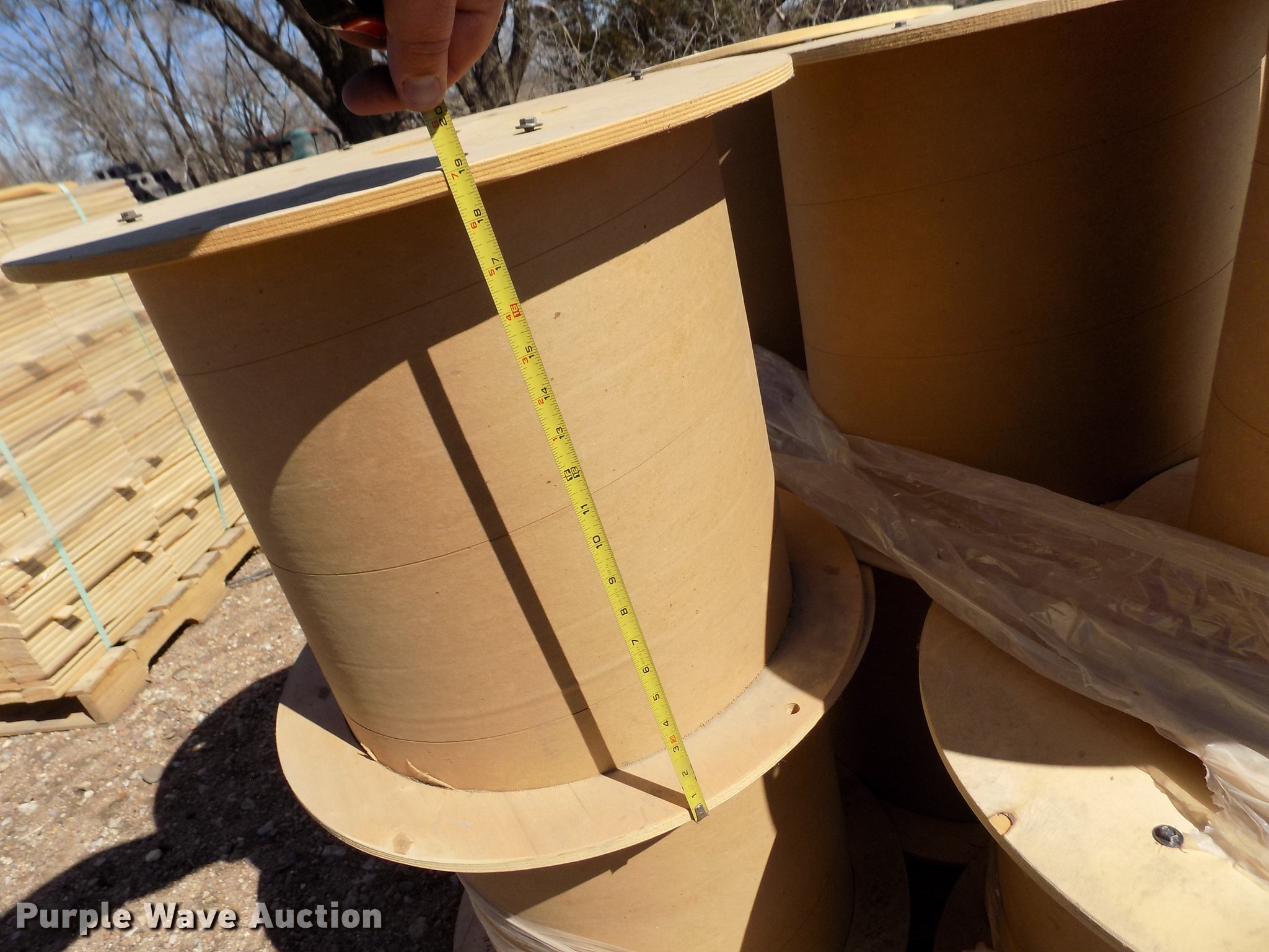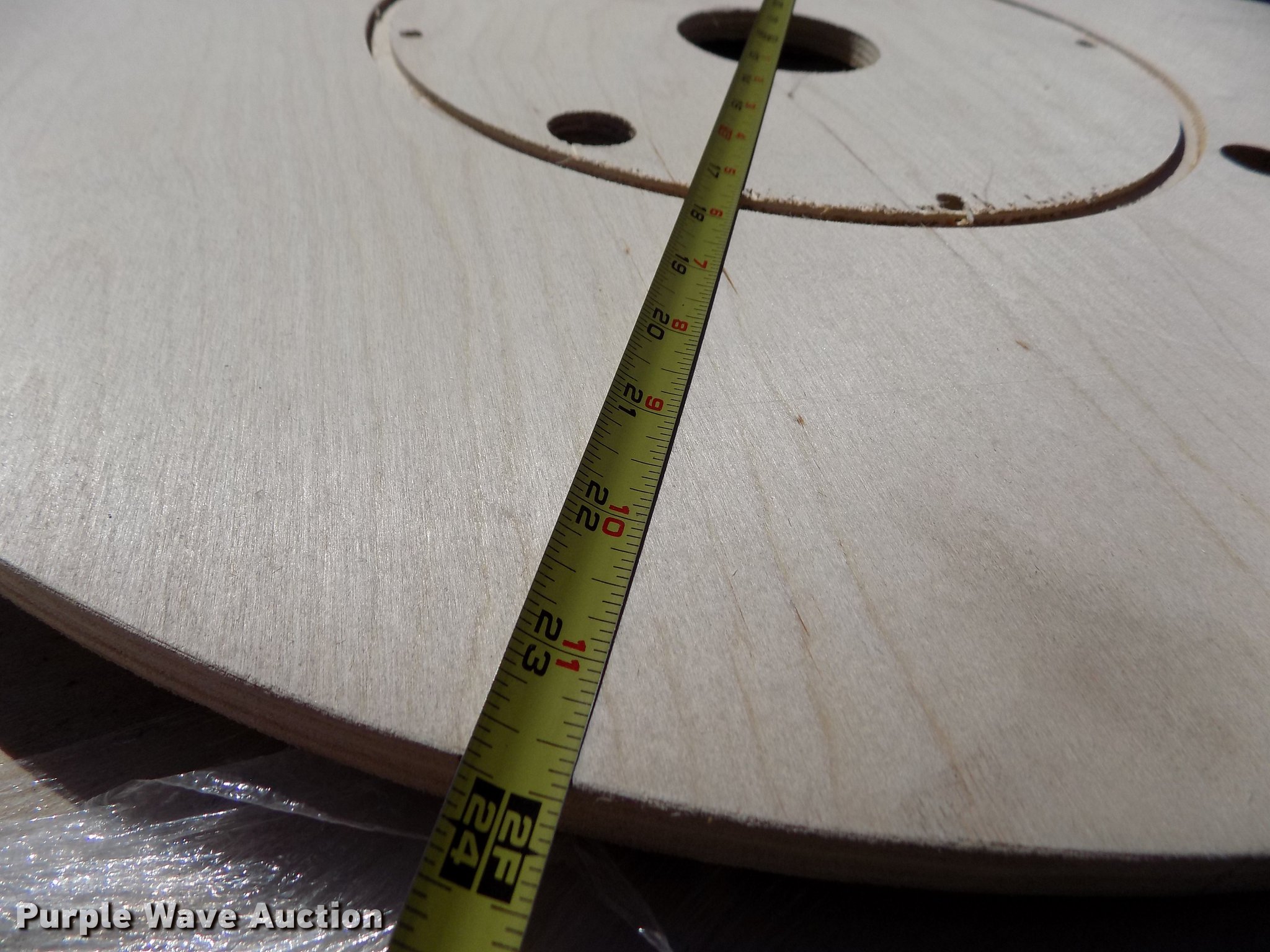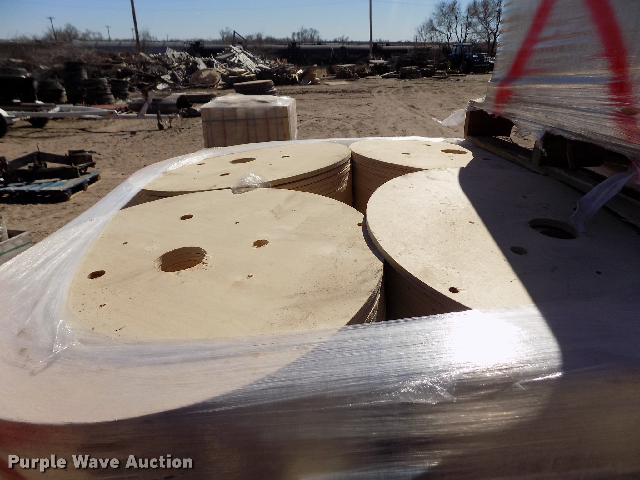 Purple Wave is selling a used Building Materials in Kansas. This item is a Wood reel parts with the following: Approximately 1,008 plywood flanges, 24" diameter, 3" center hole, 12mm thick, (10) spools, 24" diameter, 3" center hole, Cardboard centers, Approximately 1,000 plywood flanges, 12" diameter, 3" center hole, 12mm thick
