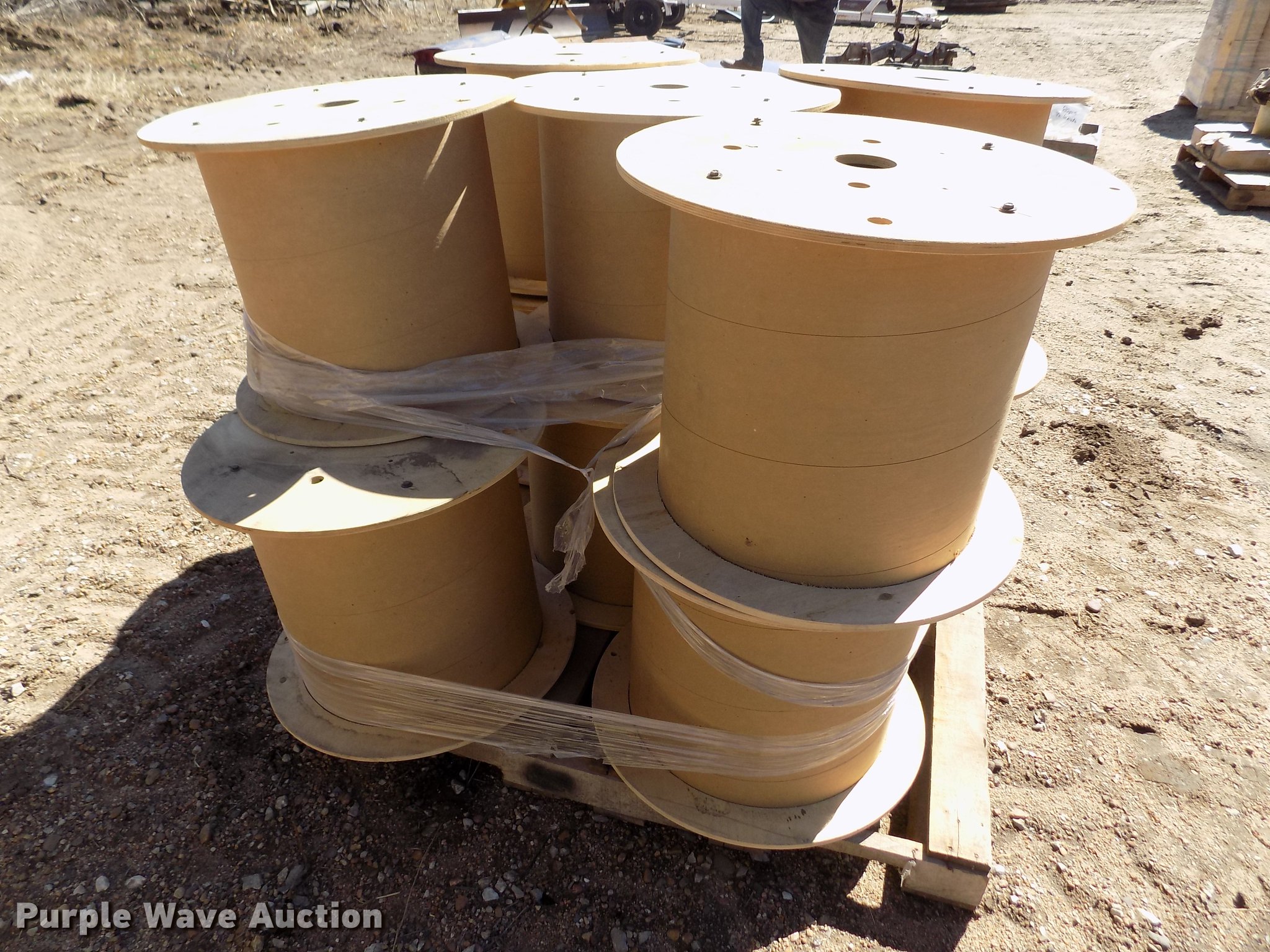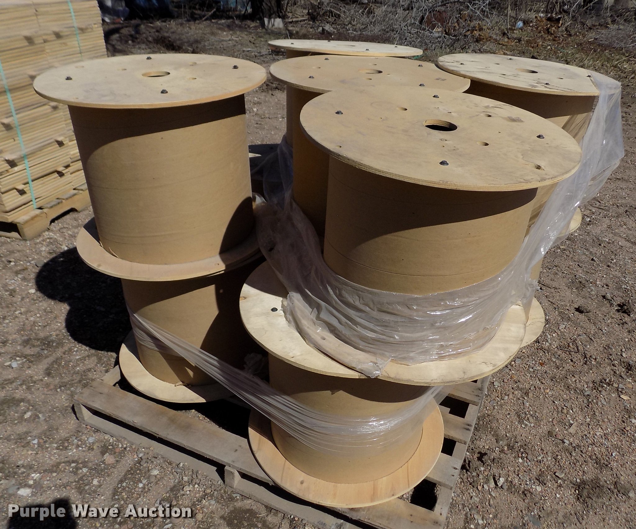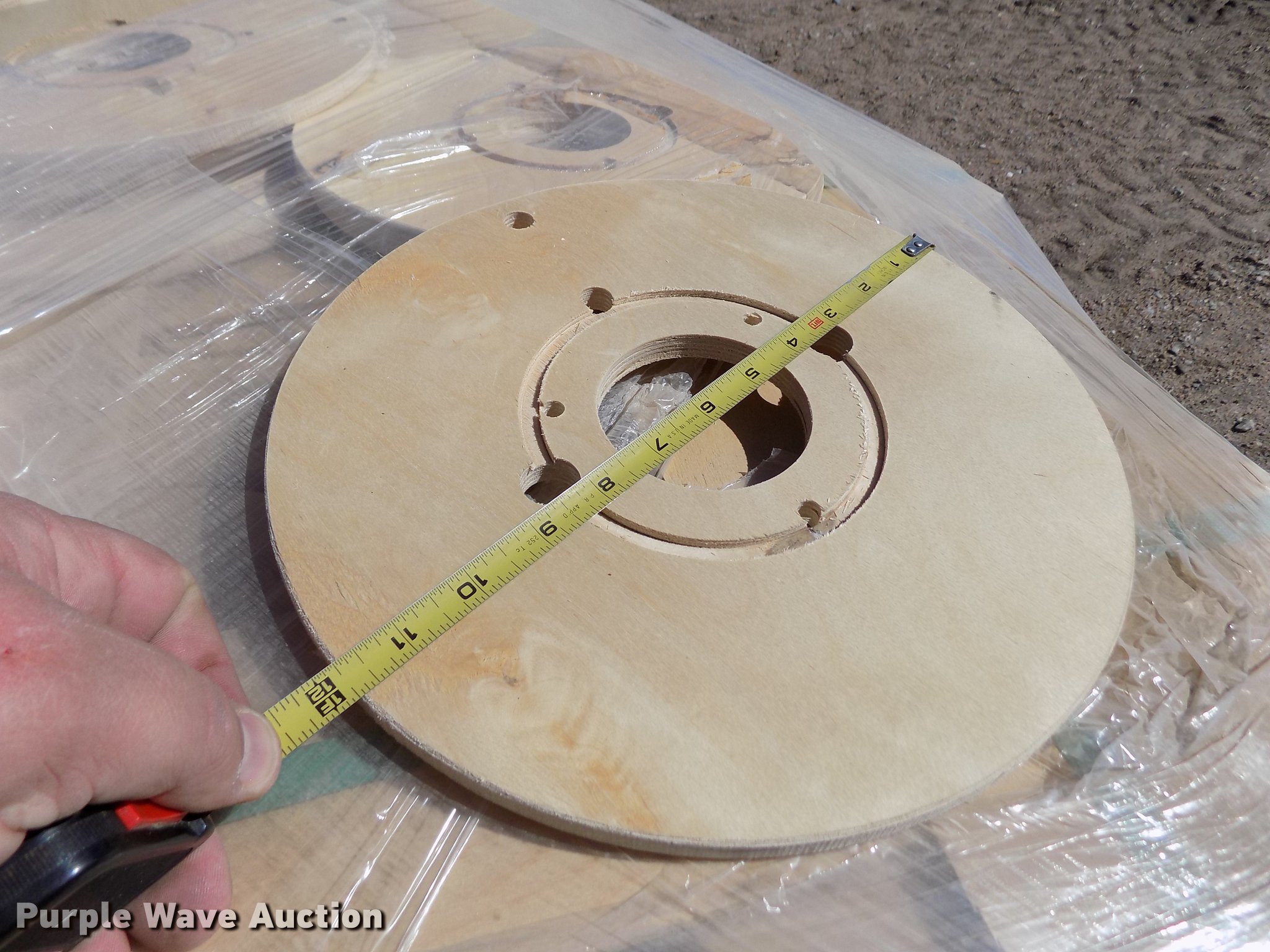 Purple Wave is selling a used Building Materials in Kansas. This item is a Wood reel parts with the following: Approximately 1,008 plywood flanges, 24" diameter, 3" center hole, 12mm thick, (10) spools, 24" diameter, 3" center hole, Cardboard centers, Approximately 1,000 plywood flanges, 12" diameter, 3" center hole, 12mm thick