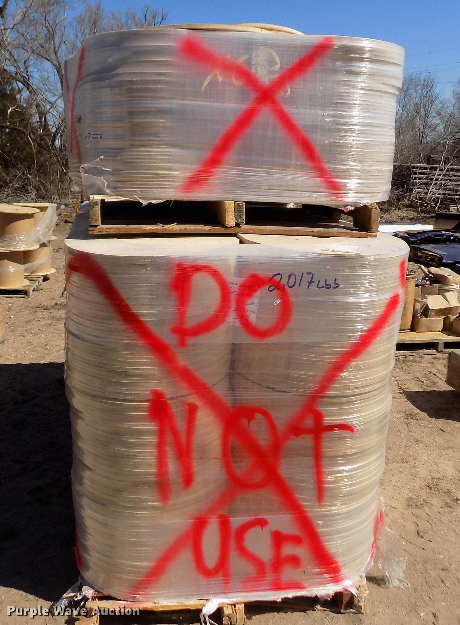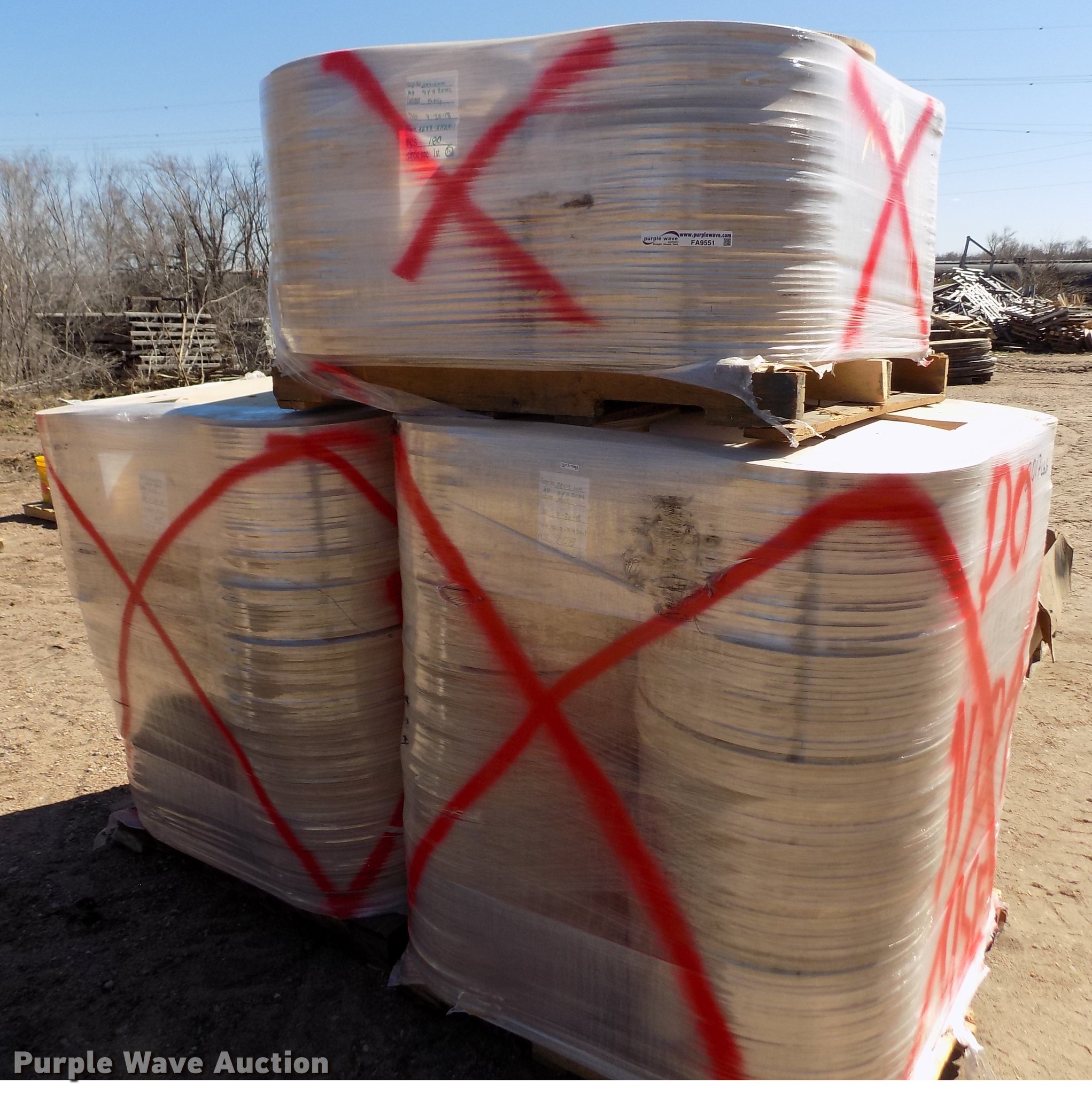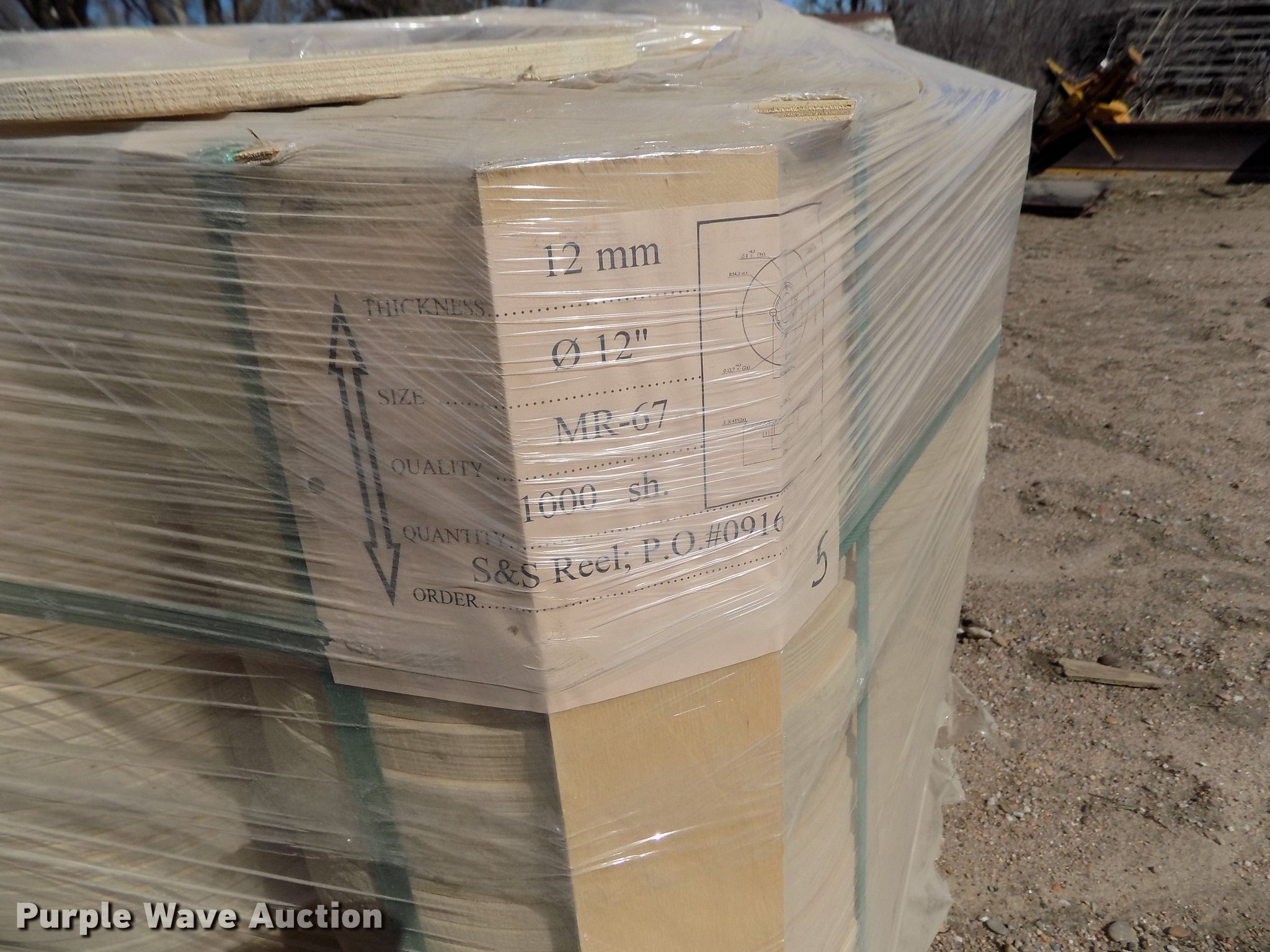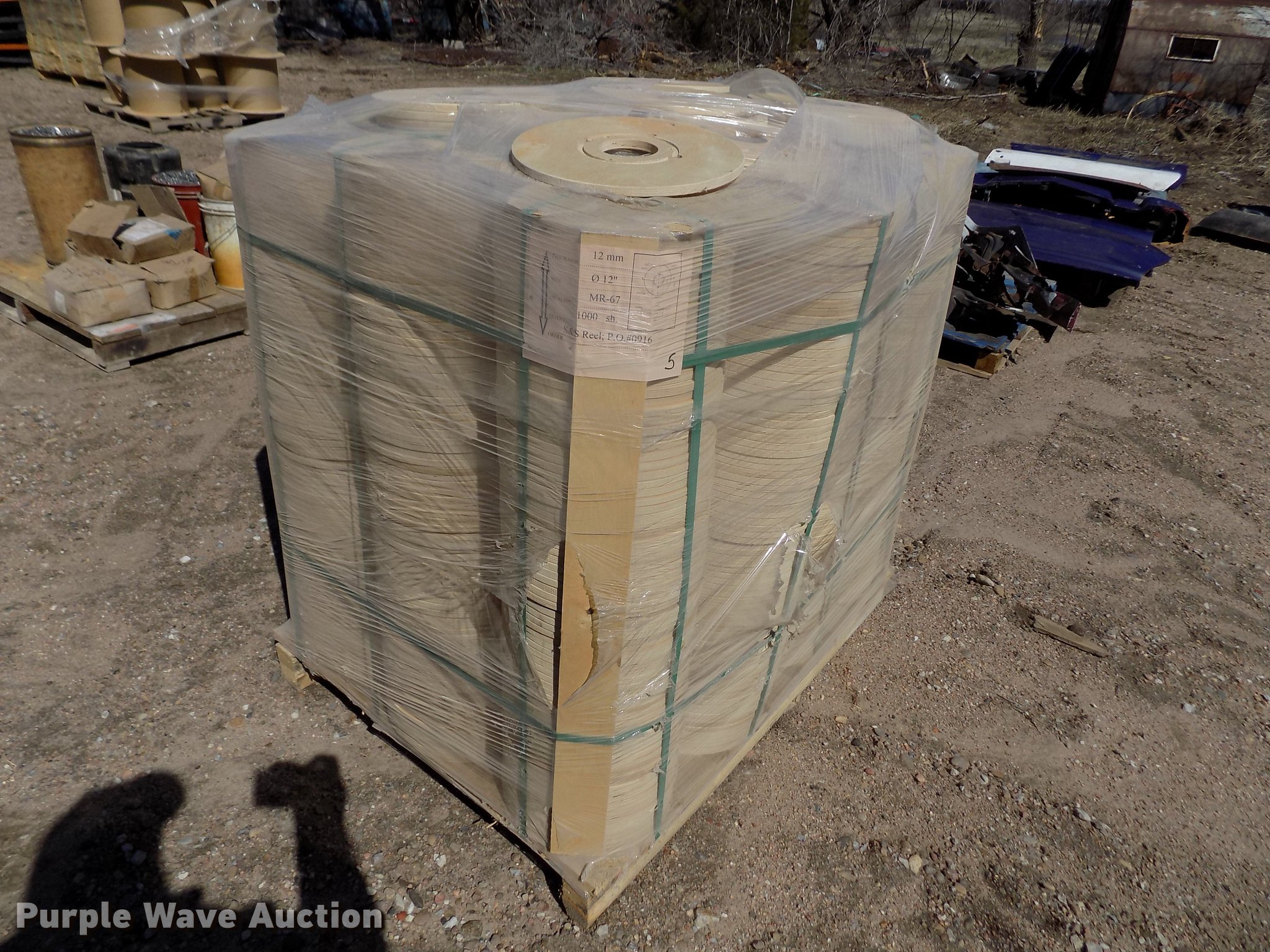Purple Wave is selling a used Building Materials in Kansas. This item is a Wood reel parts with the following: Approximately 1,008 plywood flanges, 24" diameter, 3" center hole, 12mm thick, (10) spools, 24" diameter, 3" center hole, Cardboard centers, Approximately 1,000 plywood flanges, 12" diameter, 3" center hole, 12mm thick