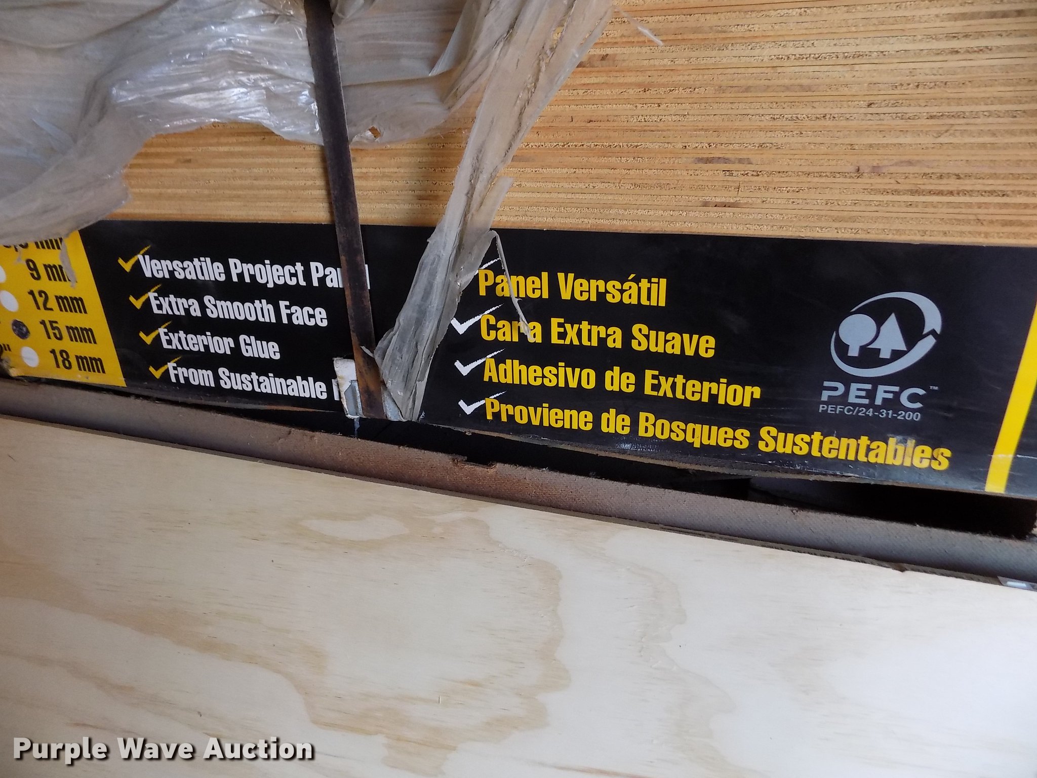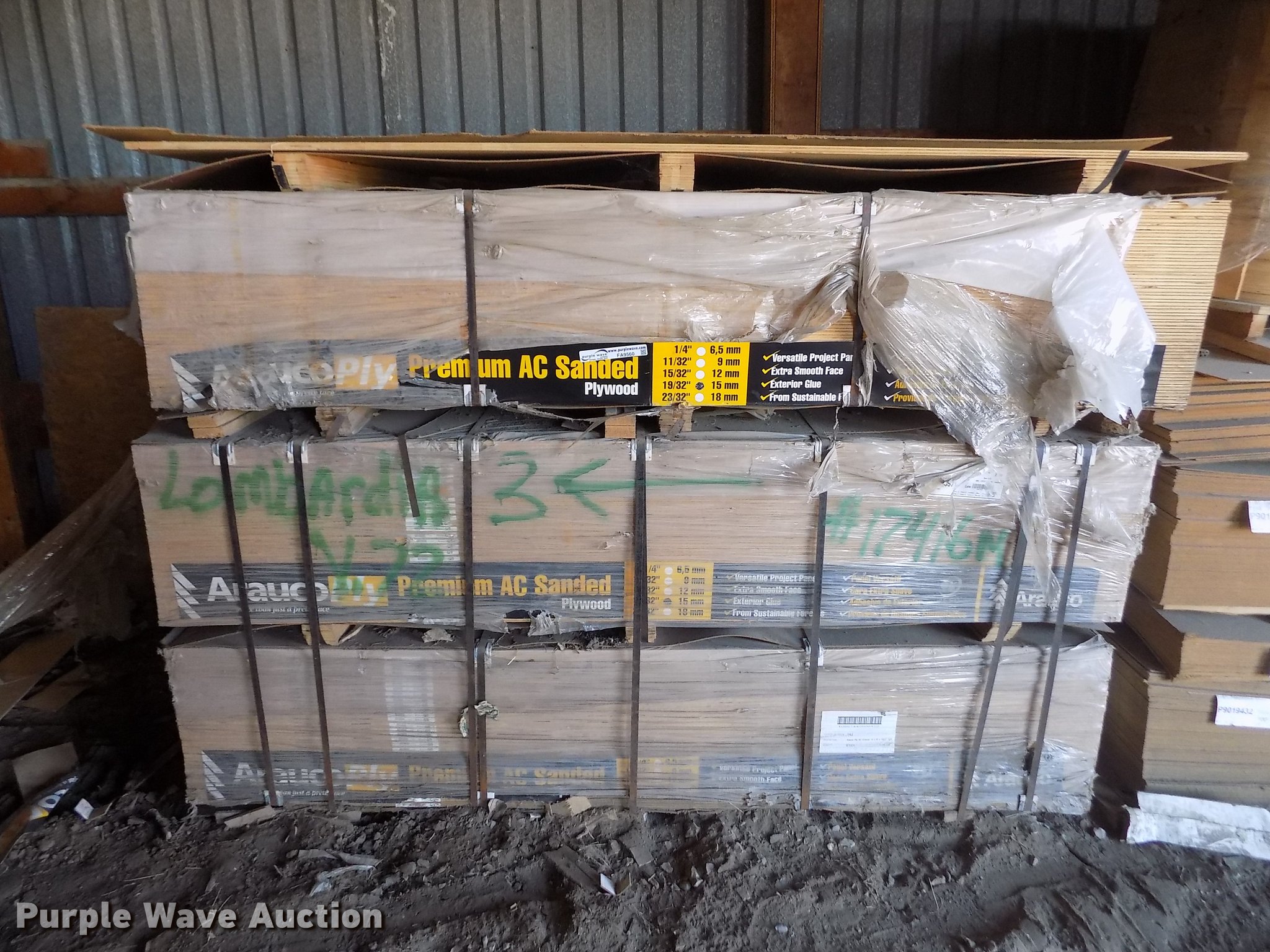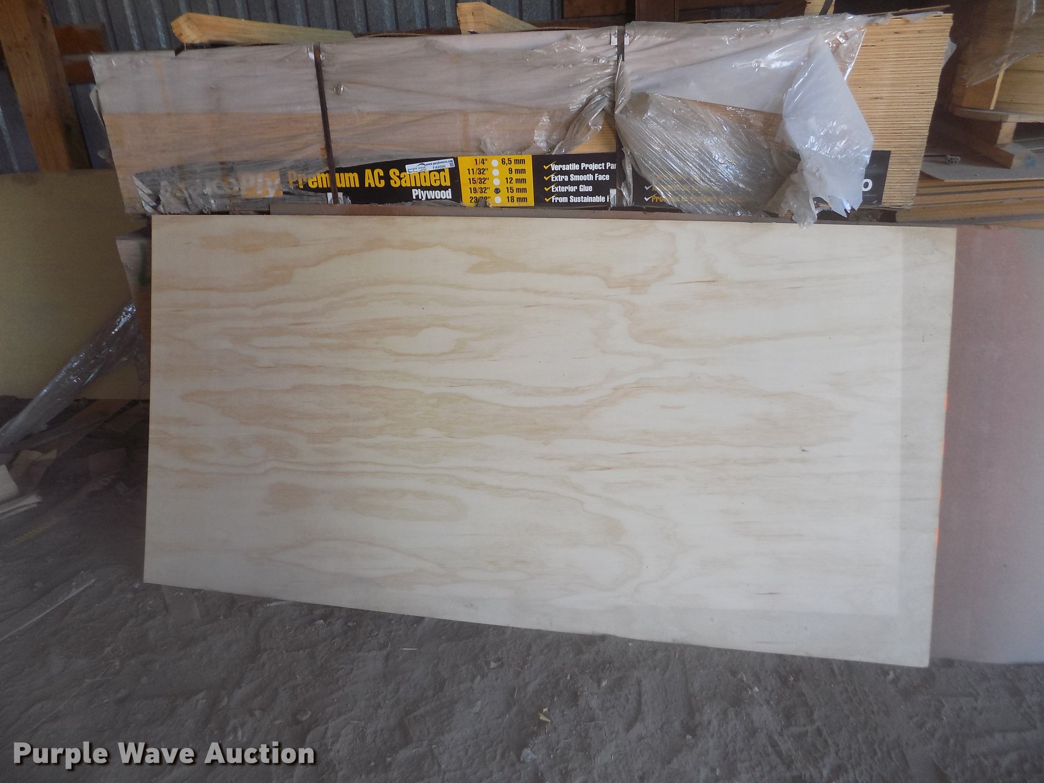 Purple Wave is selling a used Building Materials in Kansas. This item is a Approximately 94 sheets Aruco plywood with the following: 4' x 8' x 19/32"
