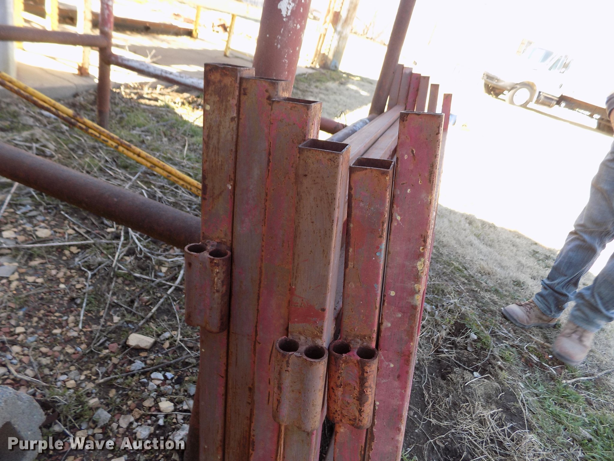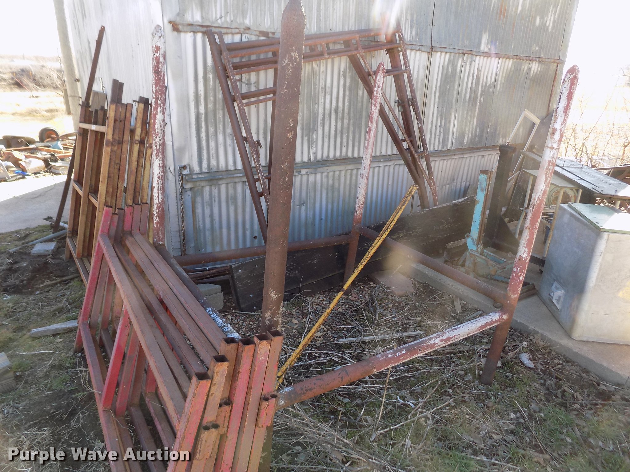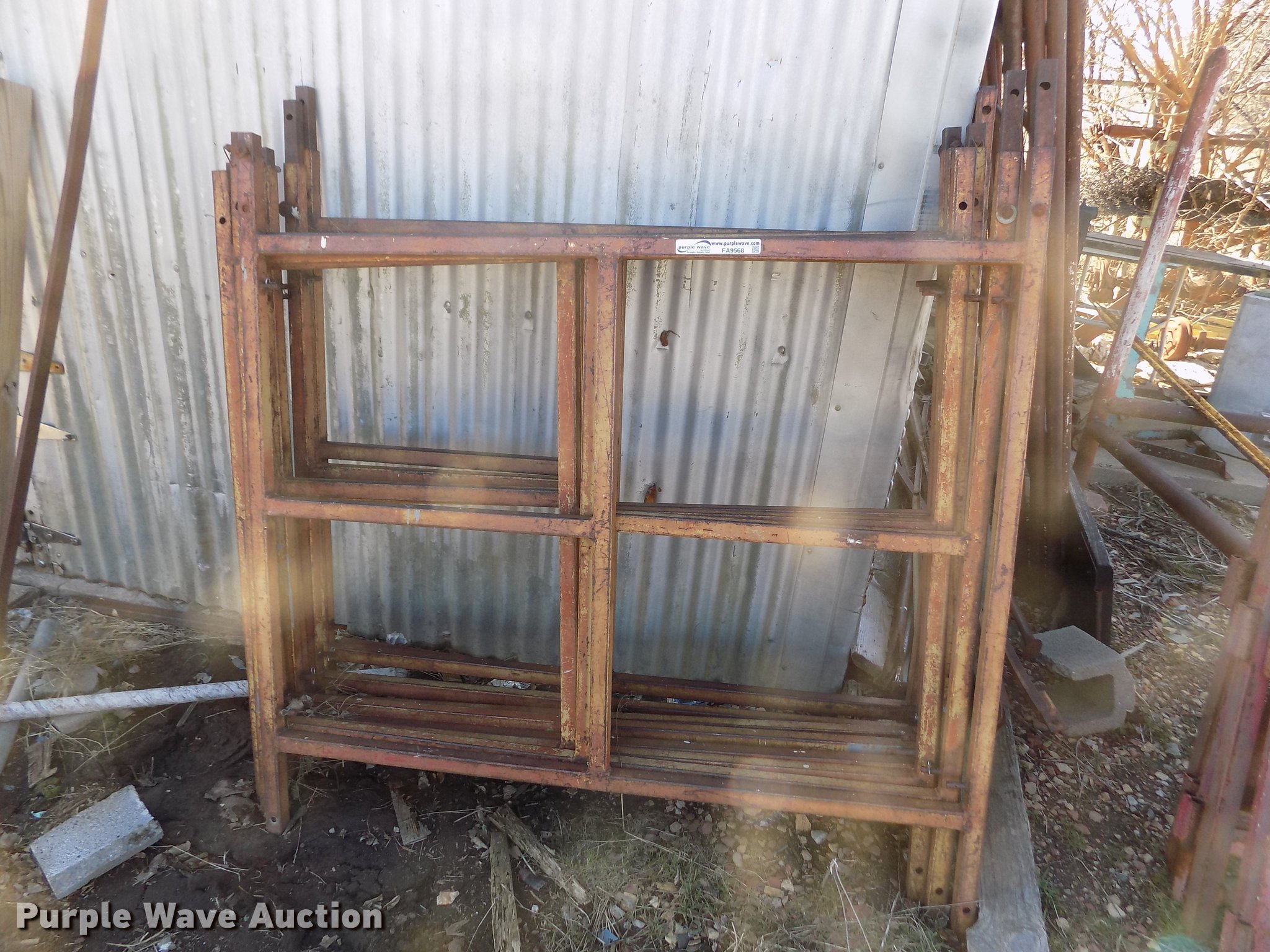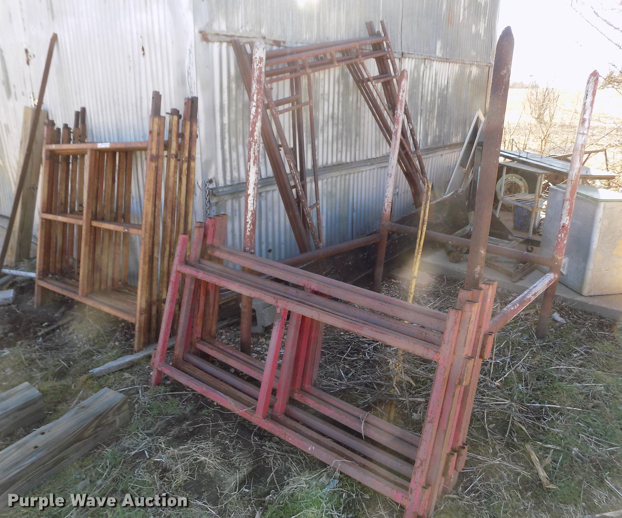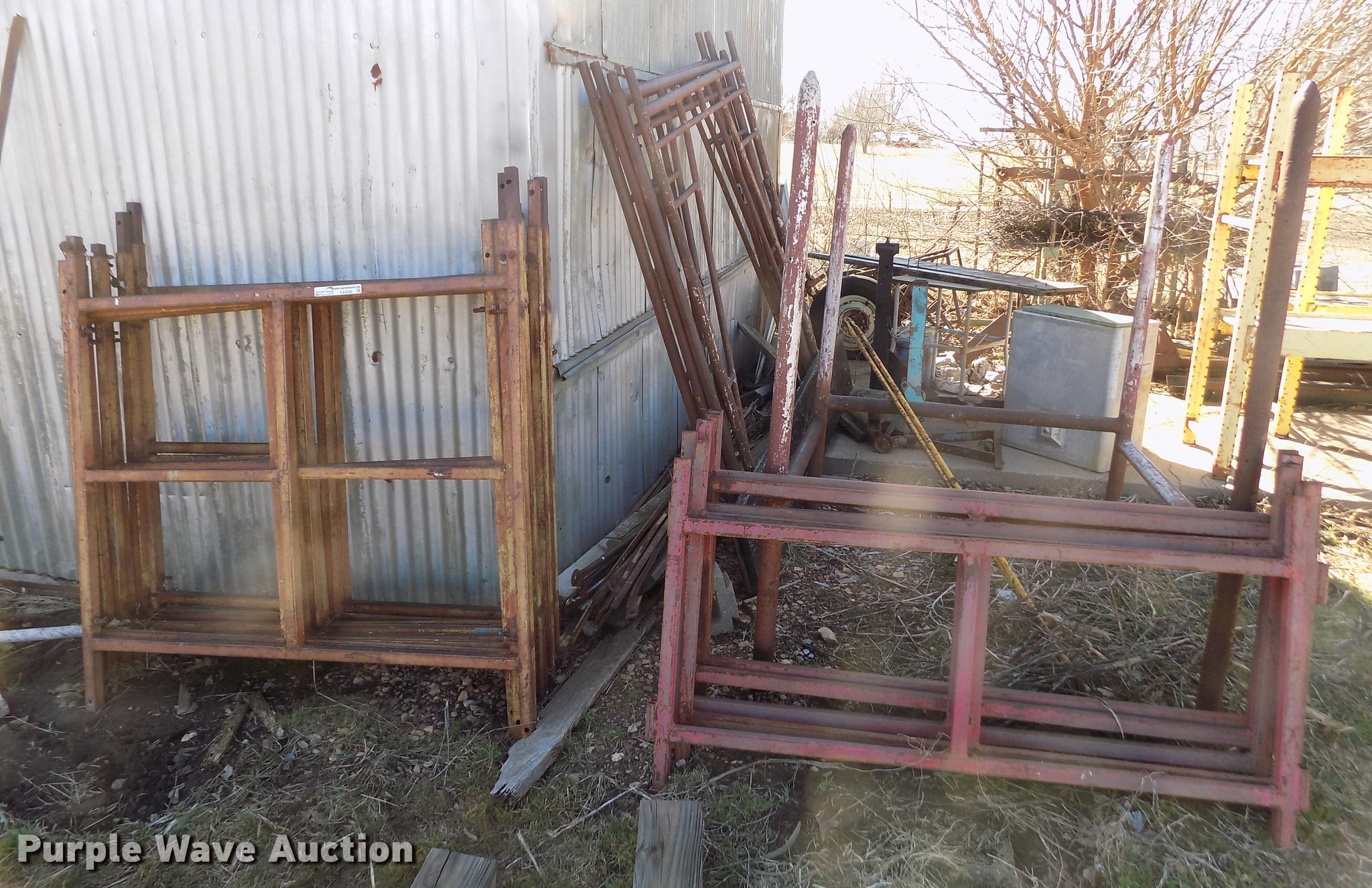 Purple Wave is selling a used Tools in Kansas. This item is a Scaffolding with the following: (8) 5' x 5' sections, (6) 5' x 3' sections, (4) 62" x 78" sections, Cross bracing
