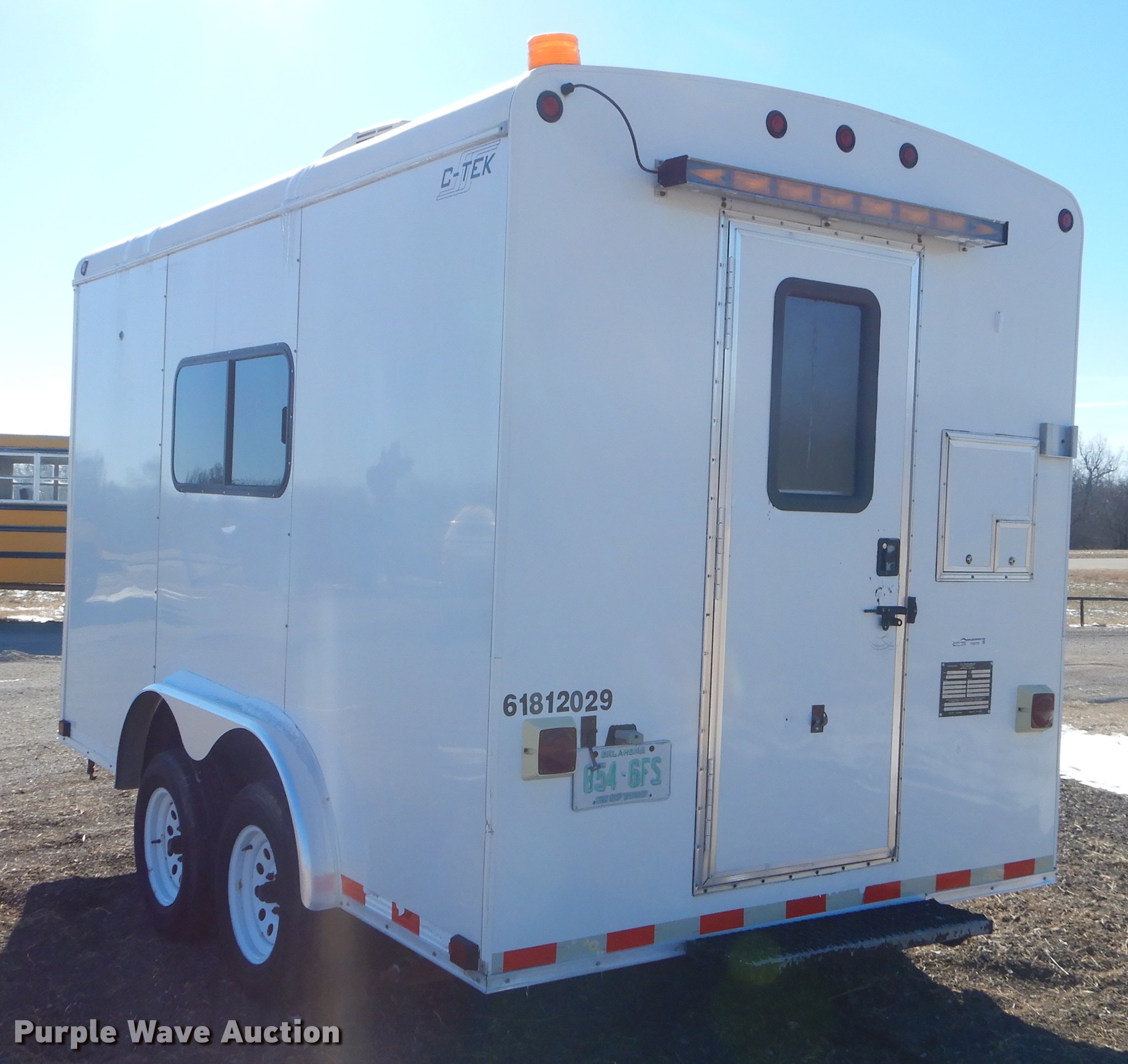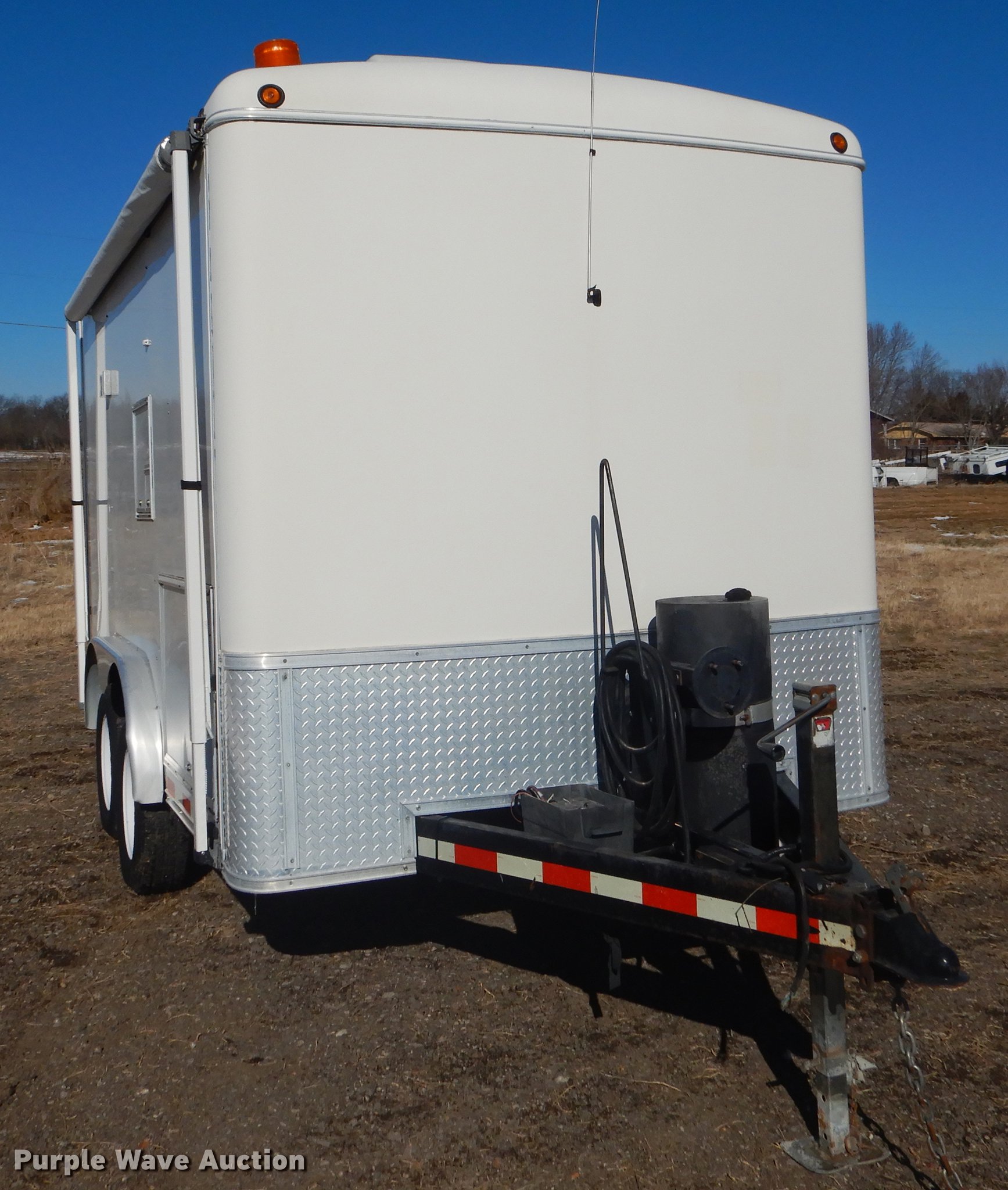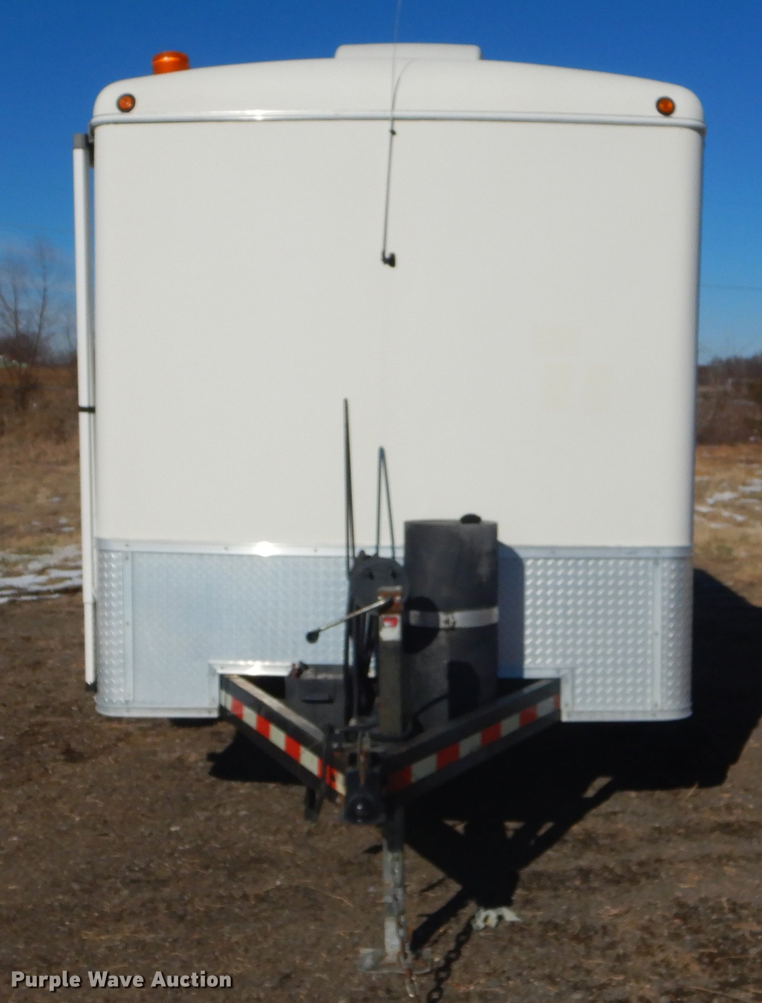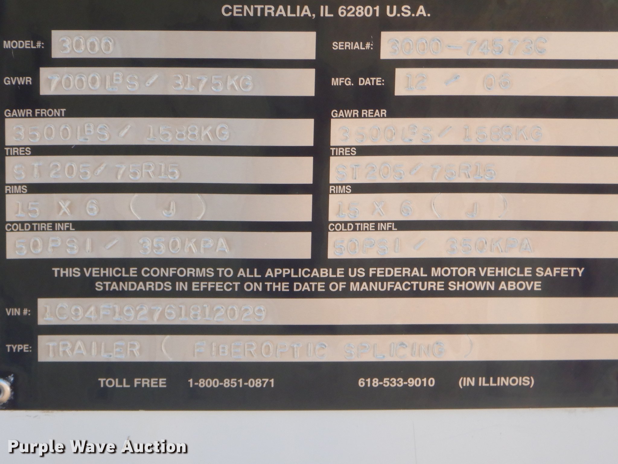 Purple Wave is selling a used Trailer Other in Oklahoma. This item is a 2006 CCE Technologies 3000 fiber optic splicing trailer with the following: 20'L x 96"W, Interior lights, Shelving, Work bench, AM/FM/CD, Roof mounted AC, True Charfe battery charger, Exterior warning lights, Rear door, Awning, 2" ball hitch, Jack stand, Spring suspension, Electric brakes, Plug damaged, Tandem axle, 235/75R15 tires, GVWR 7,000 lbs, No key to exterior storage