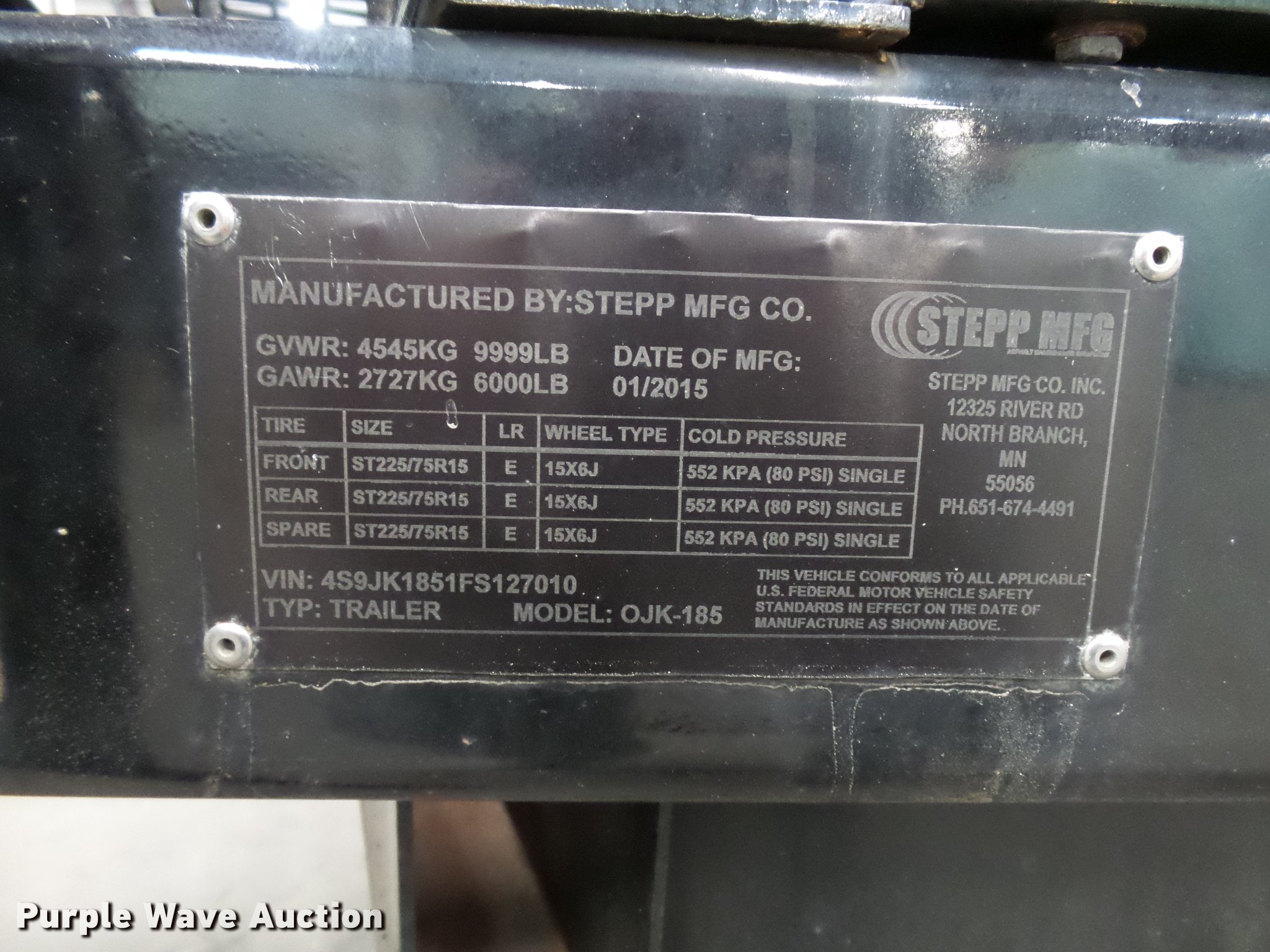 2015 Stepp 0JK185 crack sealer. Kubota 1.1L three cylinder diesel engine, 185 gallon tank, 400,000 BTU heater, (2) material adding doors, Recirculation pump, Over night heaters, Heated wand, Pintle hitch, Jack stand, Spring suspension, Electric brakes, Tandem axle, ST225/75R15 tires, GVWR 9,999 lbs. This is worksite support equipment and will not come with a title. Transfer of ownership documentation will be a bill of sale. 4S9JK1851FS127010. Brockwhite. 640 54th Ave N. St. Cloud, MN 56303