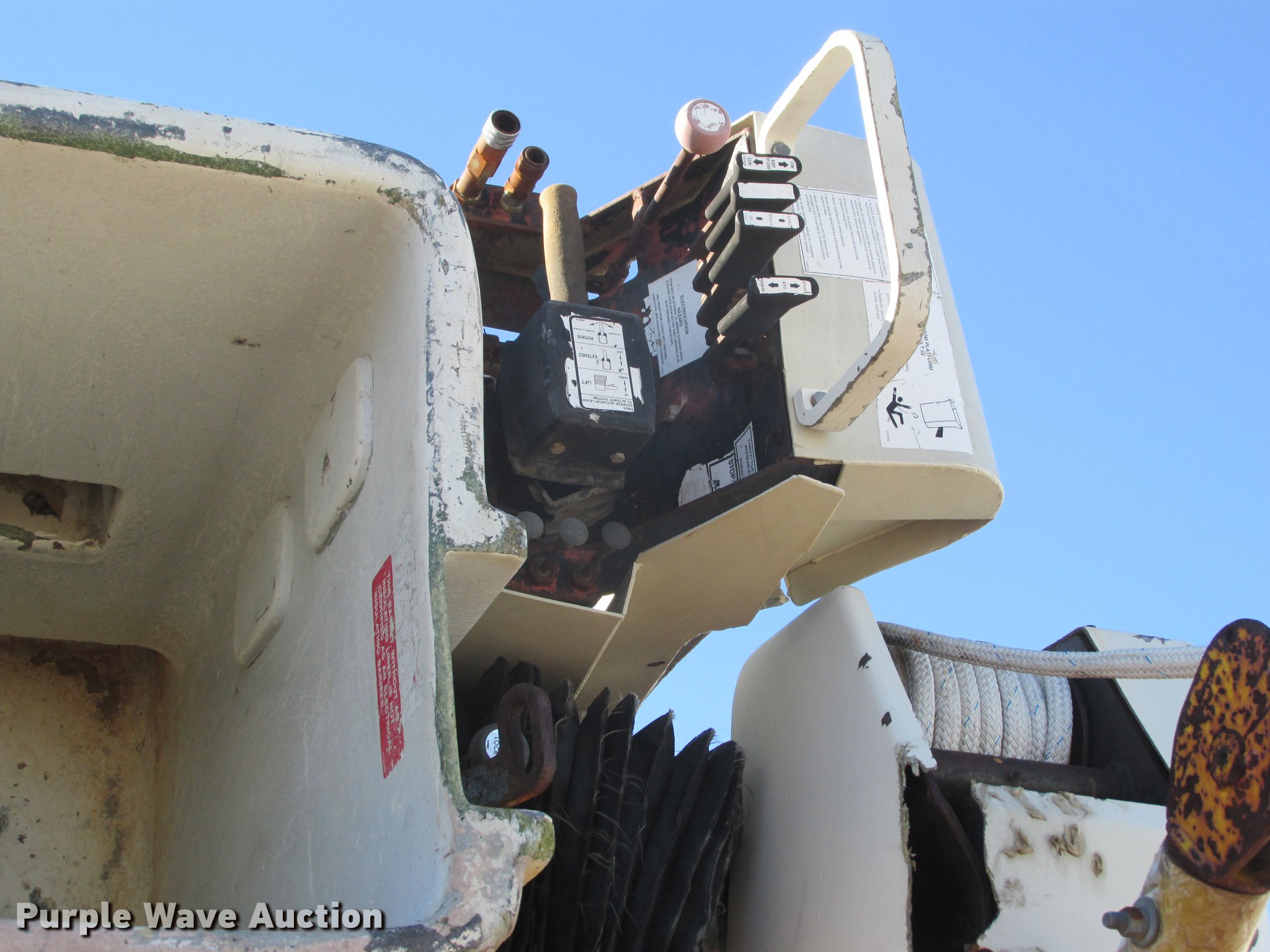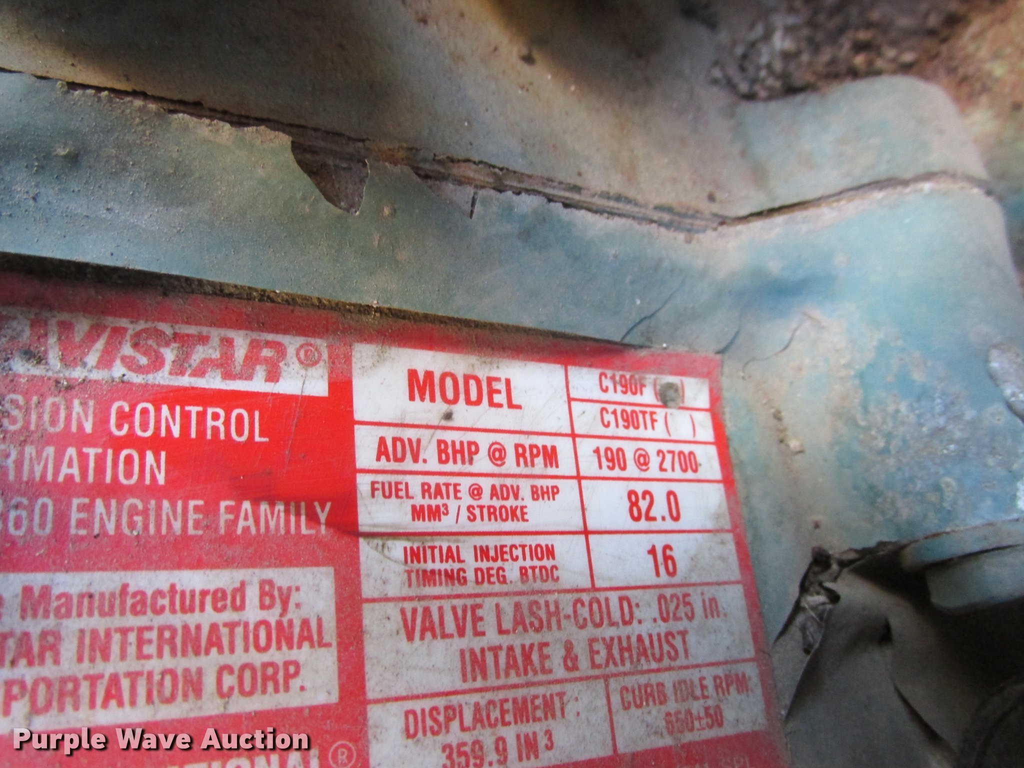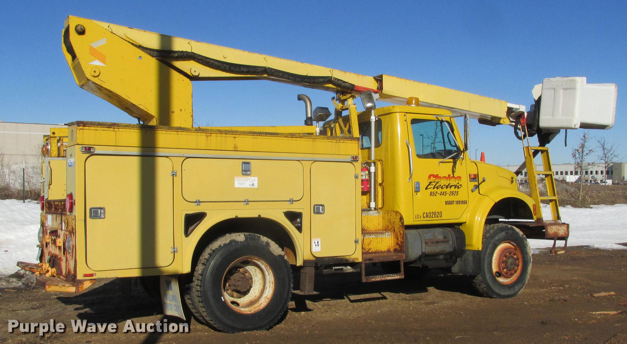 Purple Wave is selling a used Bucket Truck in Minnesota. This item is a 1993 International 4800 bucket truck with the following: 64,513 miles on odometer, 5,840 hours on meter, International C190f six cylinder turbo diesel engine, 190 HP, Six speed manual transmission, Four wheel drive, Single axle, Heat, AM/FM, Suspension seat, Backup alarm, Front tow hooks, Beacon light, PTO, 12.5'L service bed, Shelving, Utility rack, Work lights, 1992 Simon-Telelect TS402 boom, 40' boom length, 300 lbs max lift capacity, Man basket, Ground and platform controls, (2) outriggers, Material handler, Telescopic boom, Serial TS402-245JZ, Single exhaust stack, Single fuel tank, Trailer wiring, Pintle hitch, 152" wheelbase, Air suspension, Air brakes, 11R22.5 tires