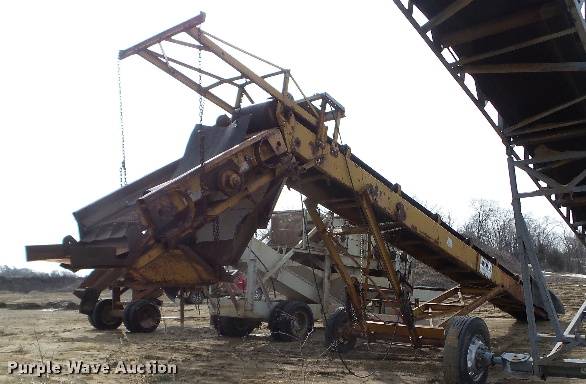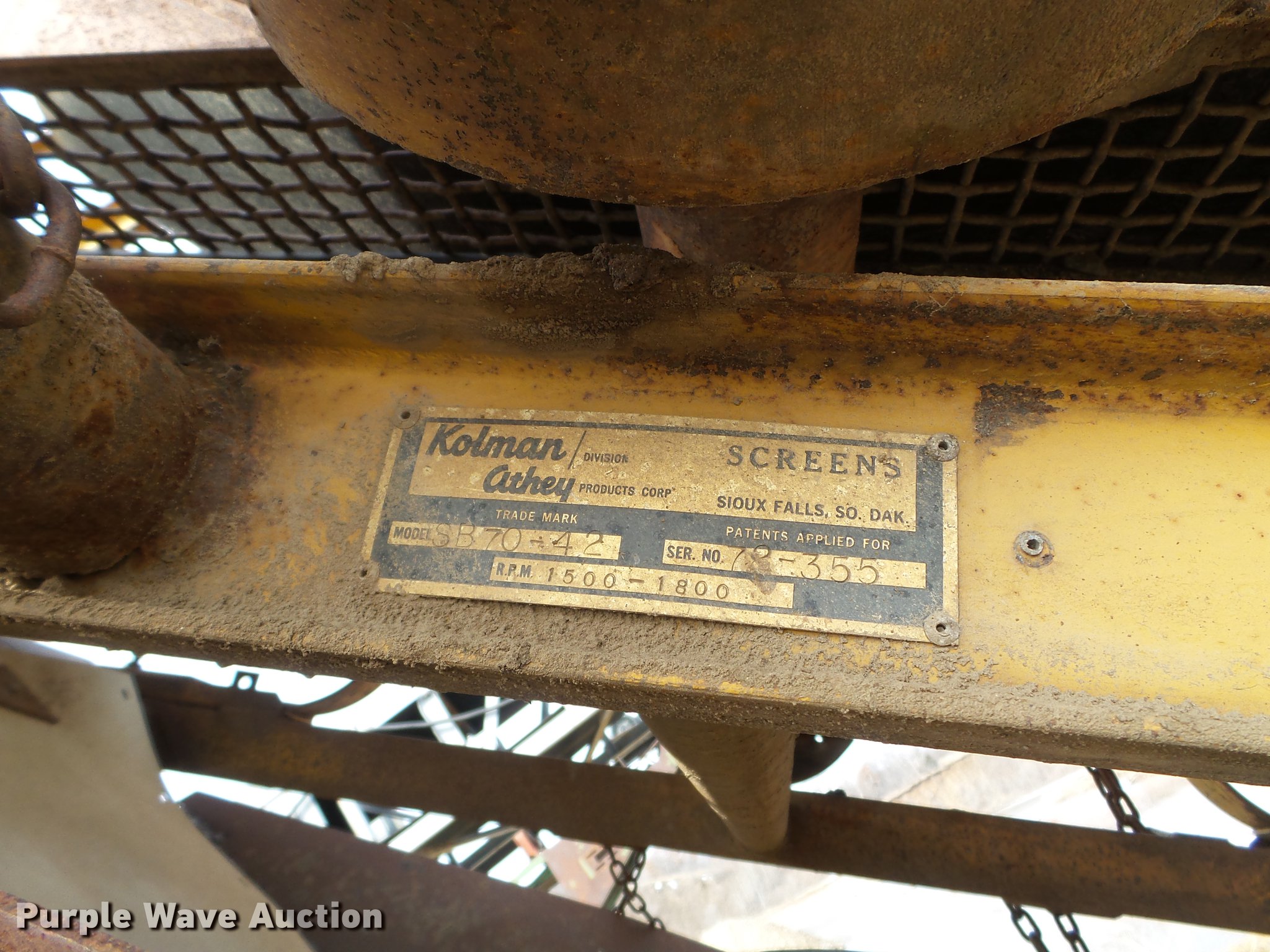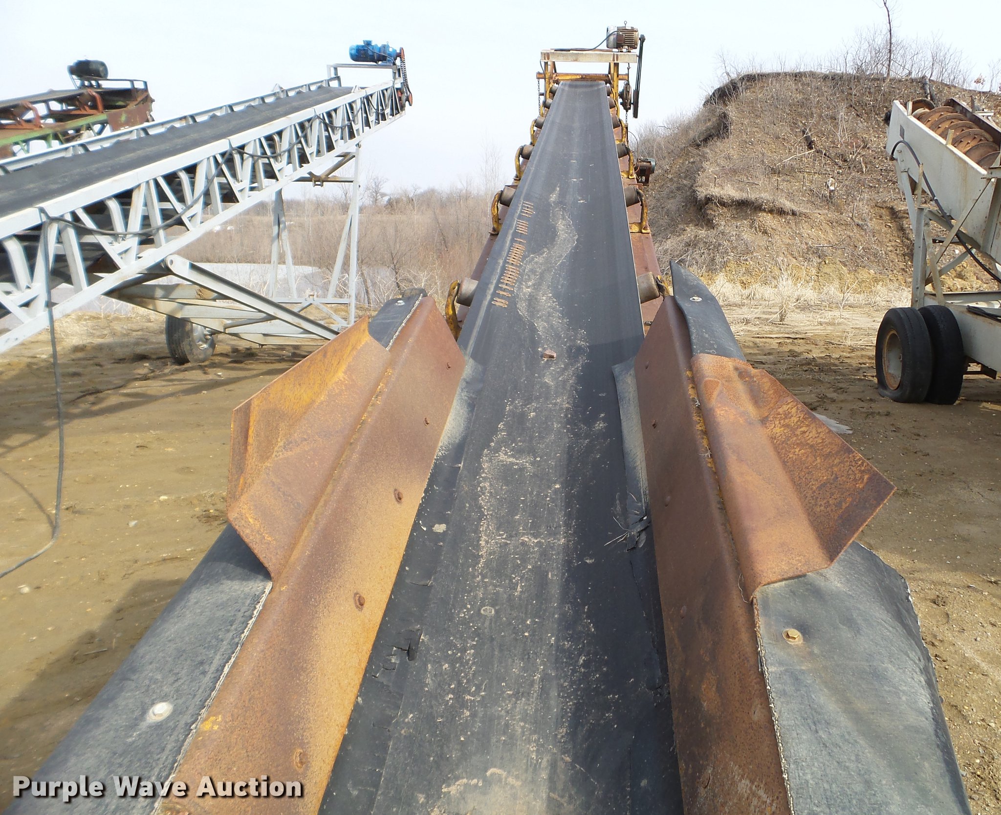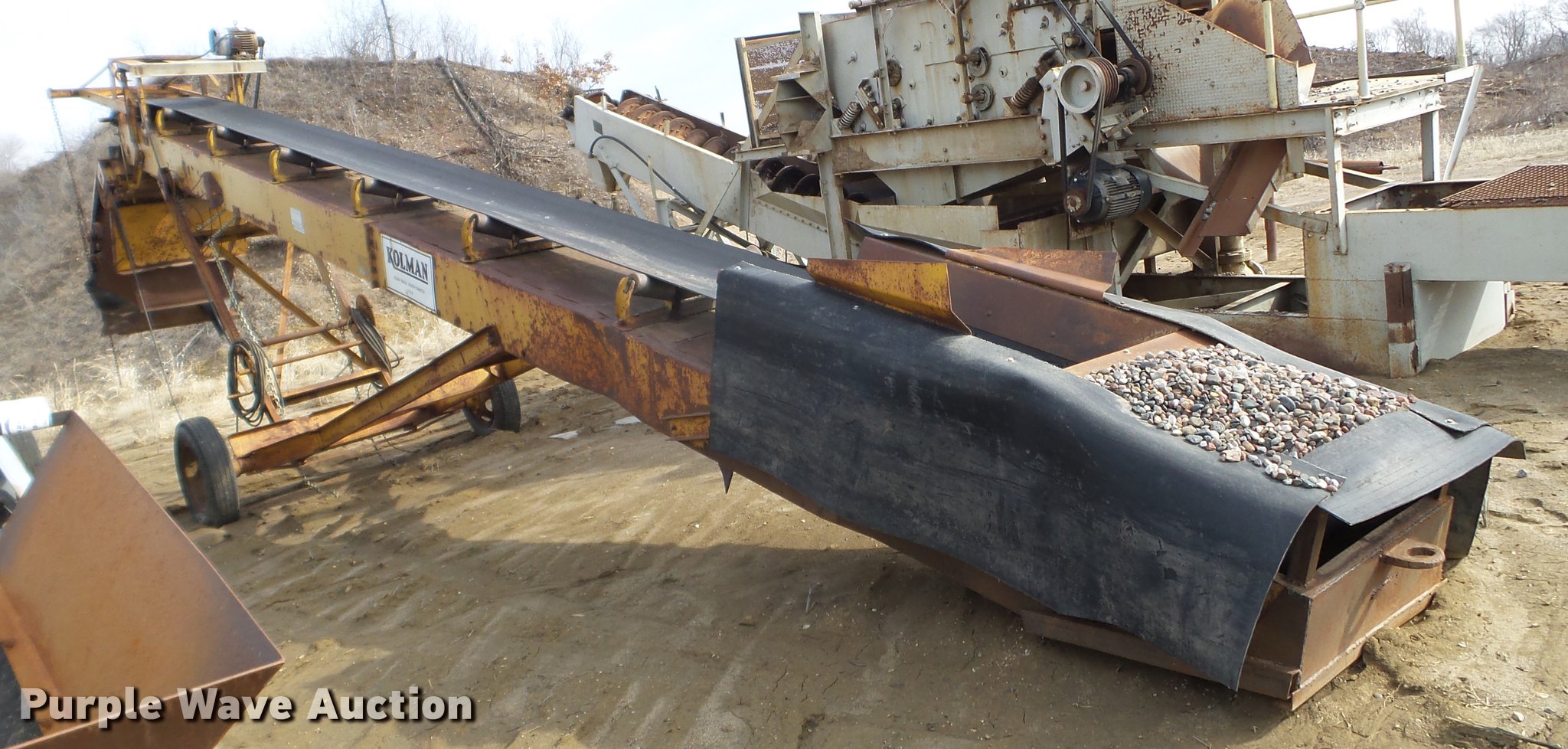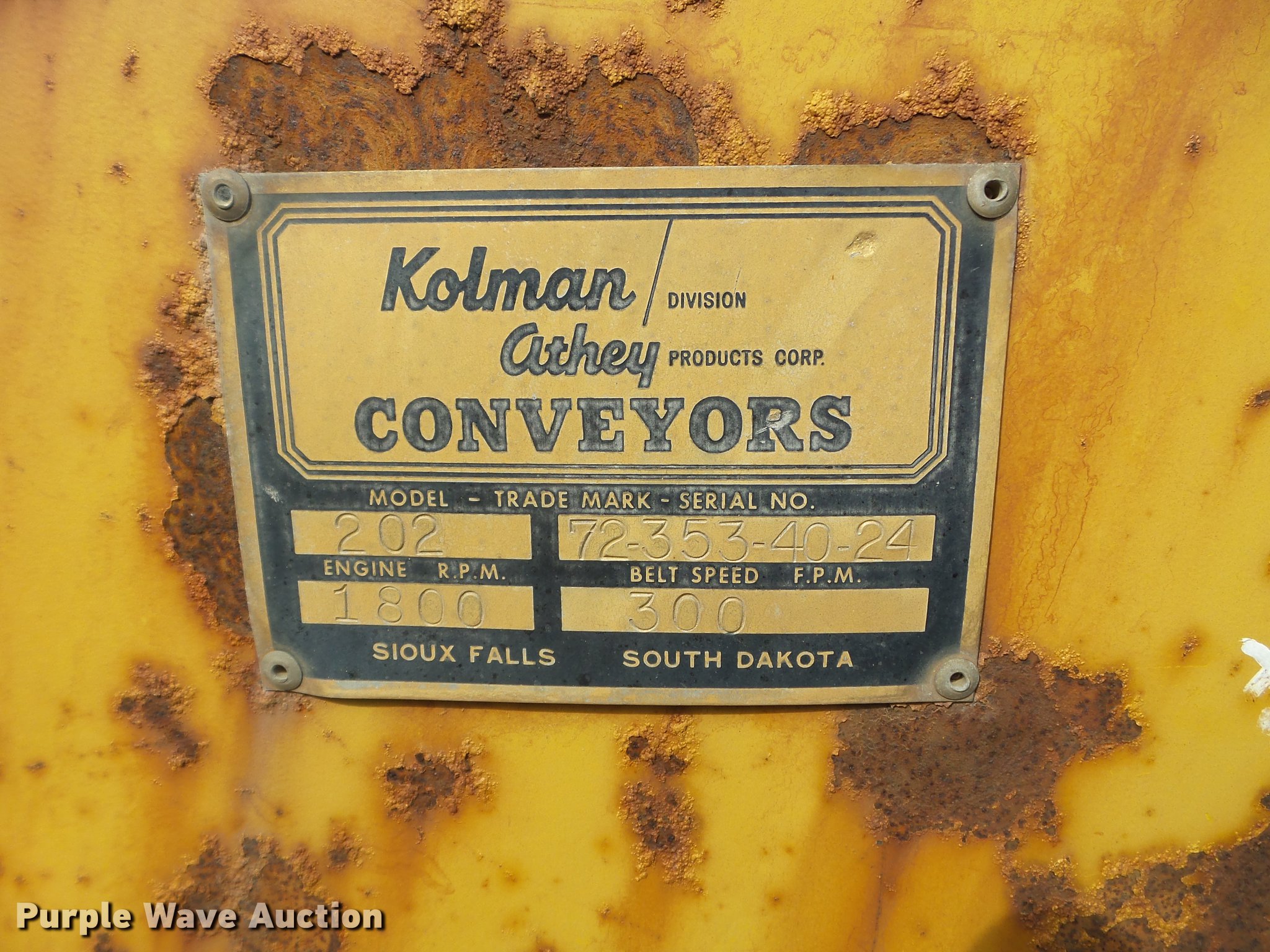 Purple Wave is selling a used Conveyor in Minnesota. This item is a Kolman 202 stacking conveyor with the following: 40'L, 24"W belt, Kolman SB70-42 screen, 7' x 43", Serial 78-355, Manual adjustable height, Pin hitch, Single axle, 7.50-20 tires