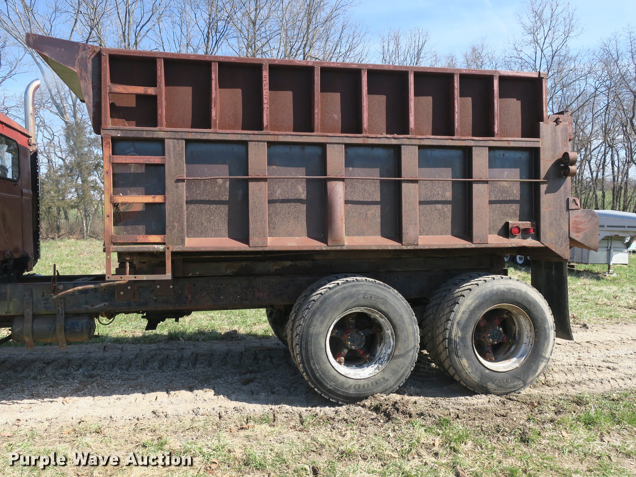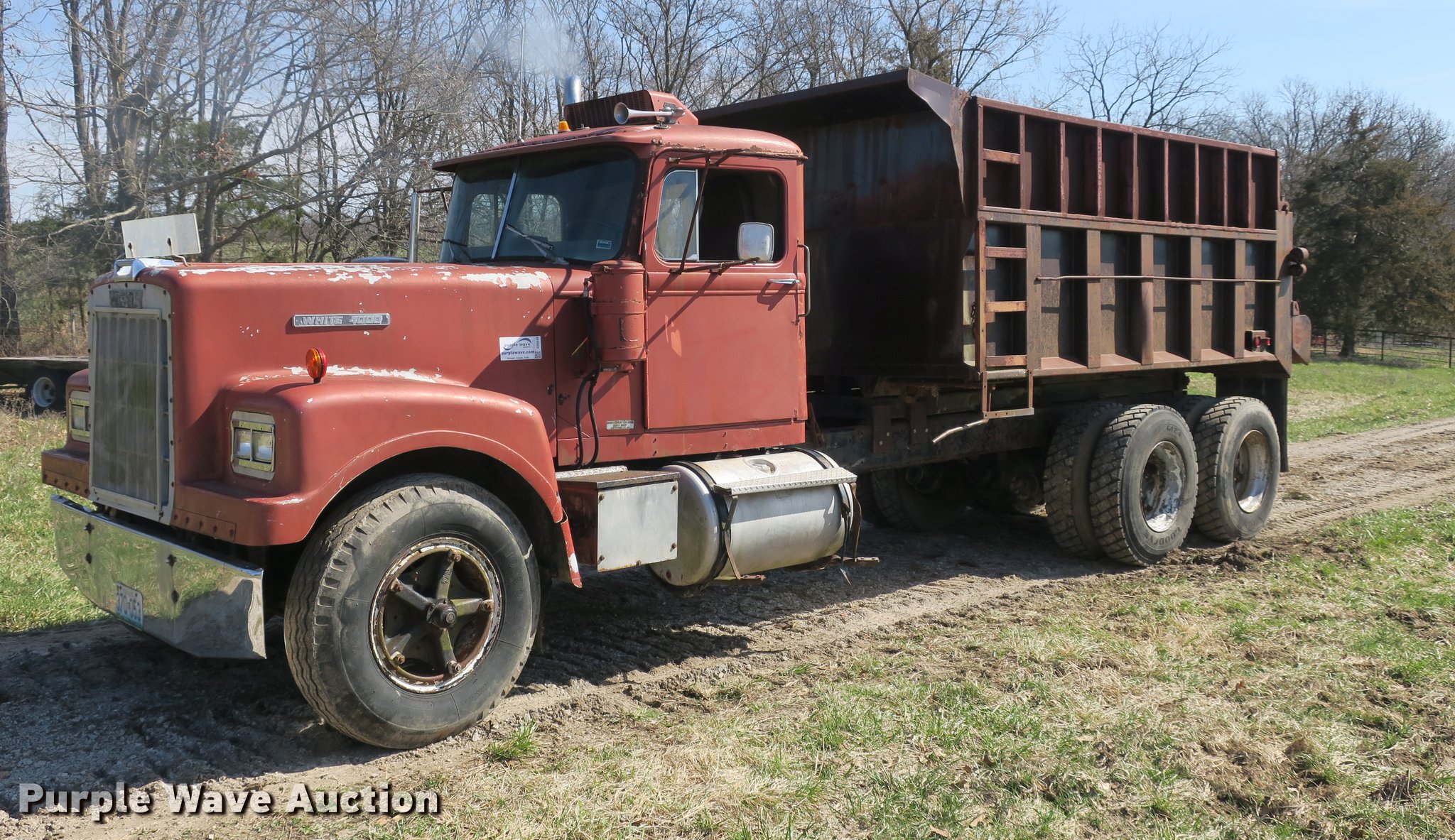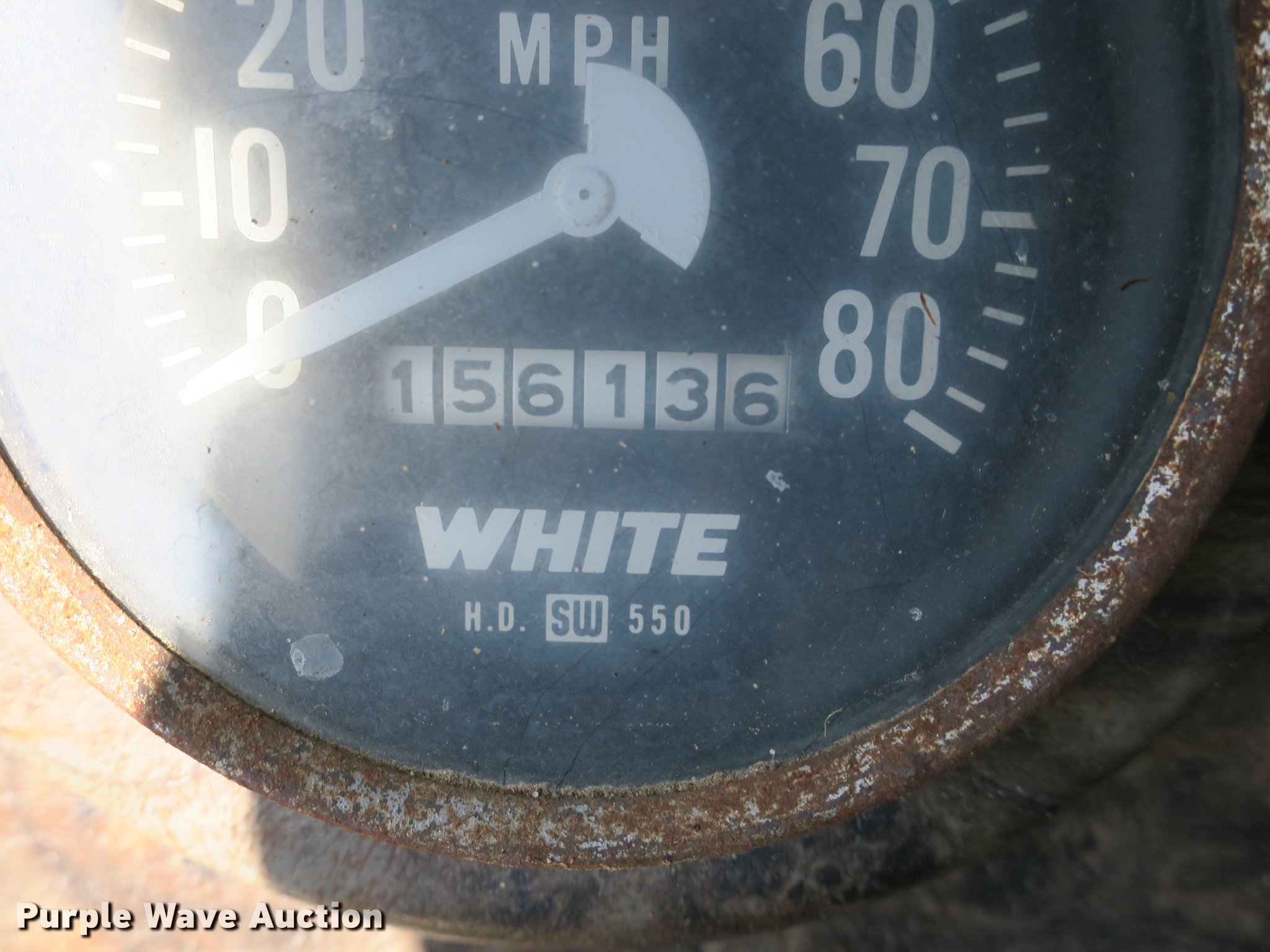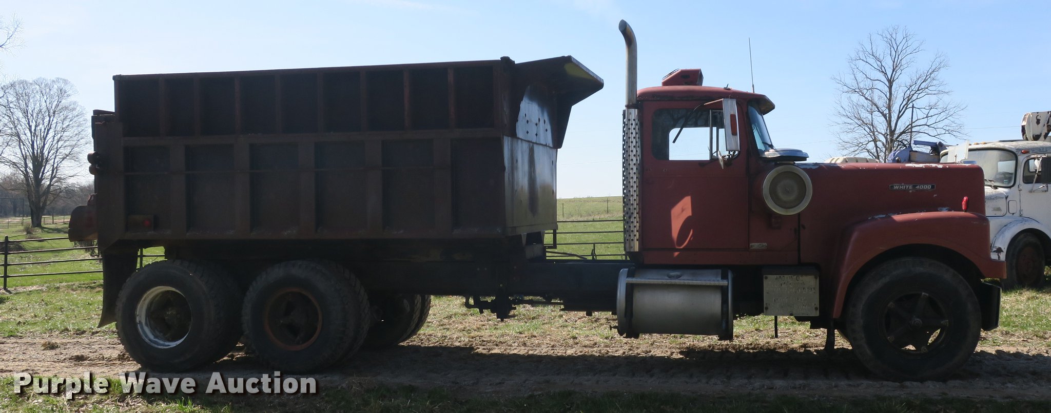 Purple Wave is selling a used Construction Dump Truck in Missouri. This item is a 1973 White 4000 dump truck with the following: 156,136 miles on odometer, 7,478 hours on meter, Cummins six cylinder diesel engine, 290 HP, 10 speed manual transmission, Tandem axle, Inter-axle differential lock, AM/FM/cassette, Air suspension seat, PTO, 13'L x 97"W steel dump bed, 60" side height, Single ram hoist, Manual operated end gate, Dual fuel tanks, Pintle hitch, Double frame, Spring suspension, Air brakes, 10.00-20 front tires, 11R22.5 rear tires, Unit blows white smoke, Exhaust leak, Mirror missing