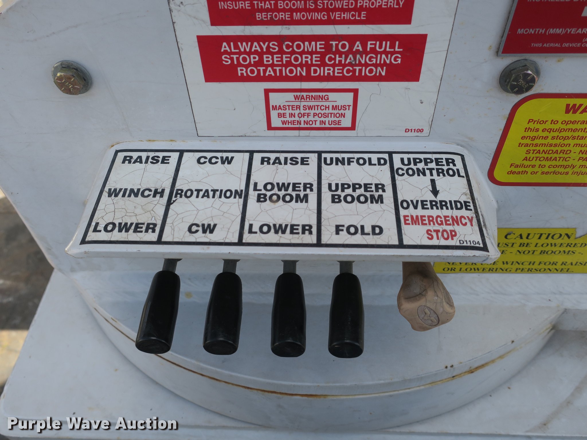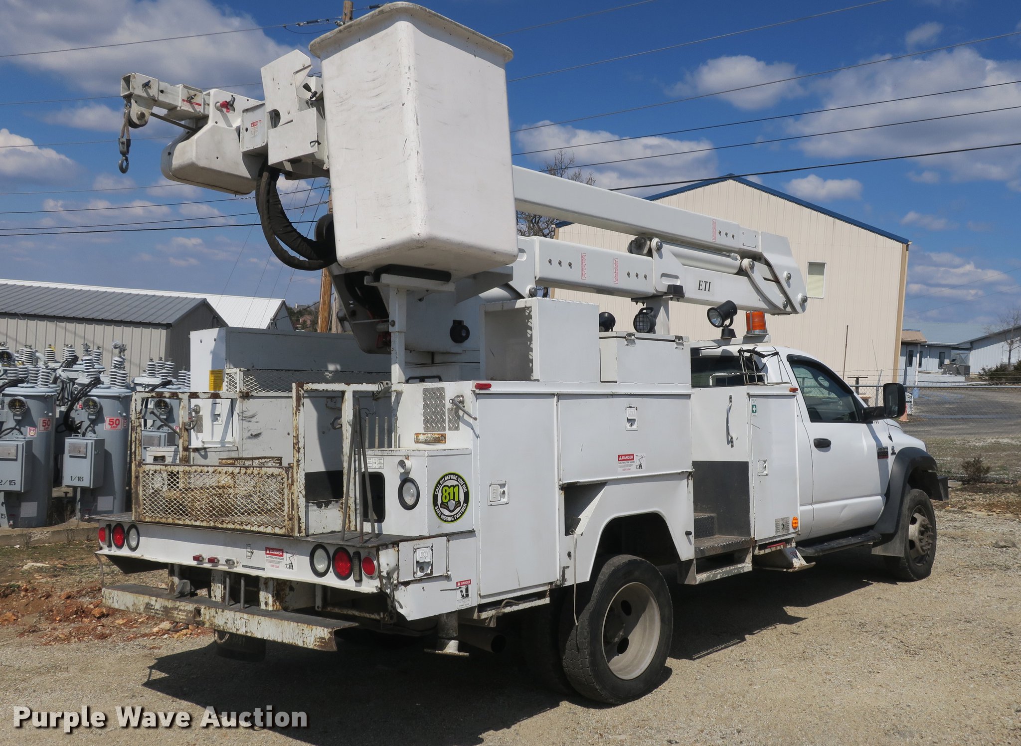 Purple Wave is selling a used Bucket Truck in Missouri. This item is a 2008 Dodge Ram 5500 bucket truck with the following: 198,094 miles on odometer, 1,933 hours on meter, 6.7L L6 OHV 24V turbo diesel engine, Automatic transmission, Four wheel drive, Single axle, AC and heat, AM/FM, Power windows and locks, Suspension seat, Beacon light, Front tow hooks, PTO, ETI utility bed, 12'L x 96"W, Shelving, Work lights, Serial 11649, ETI ET0MHH0IH boom, 400 lbs maximum lift capacity, 40' maximum lift height, Man basket, Ground and platform controls, Boom rotation, Articulating insulated boom, Rope material handler, (4) outriggers, Serial 06080M06404, Single fuel tank, Receiver hitch, Trailer wiring, Spring suspension, Hydraulic brakes, 225/70R19.5 tires, GVWR 19,500 lbs