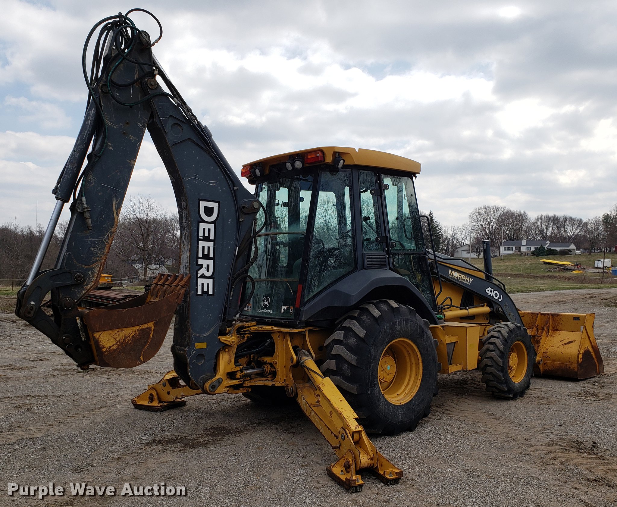 Purple Wave is selling a used Tractor Loader Backhoe in Missouri. This item is a 2008 John Deere 410J backhoe with the following: 5,133 hours on meter, John Deere four cylinder diesel engine, Powershift transmission, 4F-4R gears, Four wheel drive, EROPS, AC and heat, Suspension seat, Pilot control, 94"W loader bucket, 24"W backhoe bucket, (5) teeth, Auxiliary hydraulics, Outriggers, 12.5-80-18 front tires, 21-24 rear tires, Serial T0410JX170458