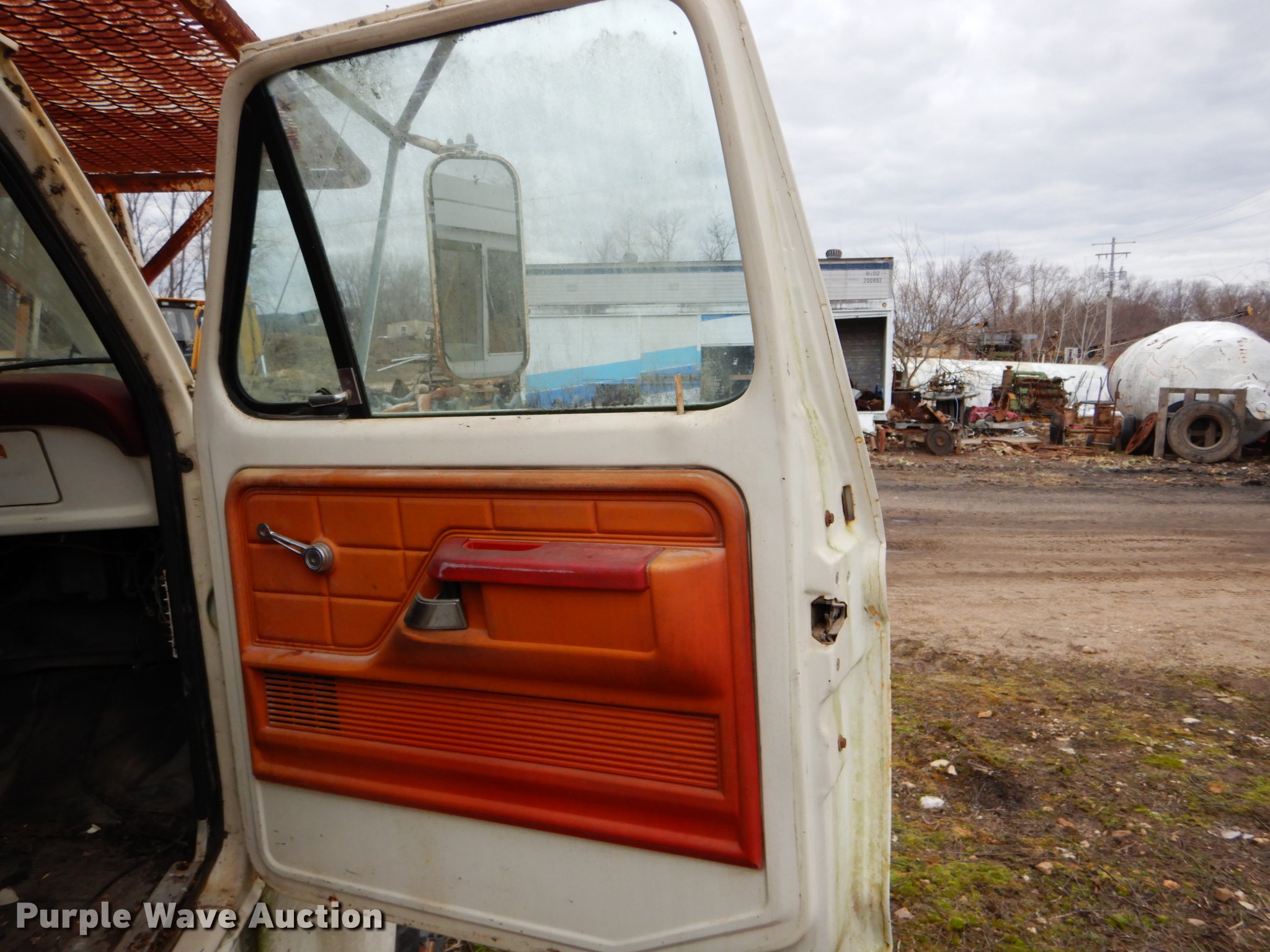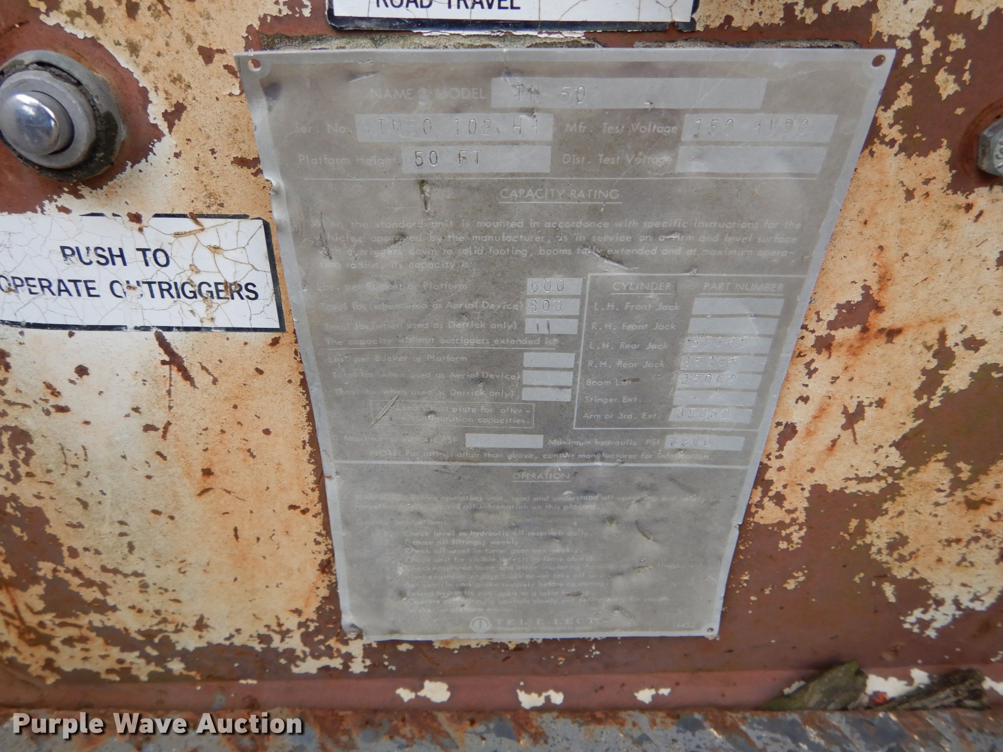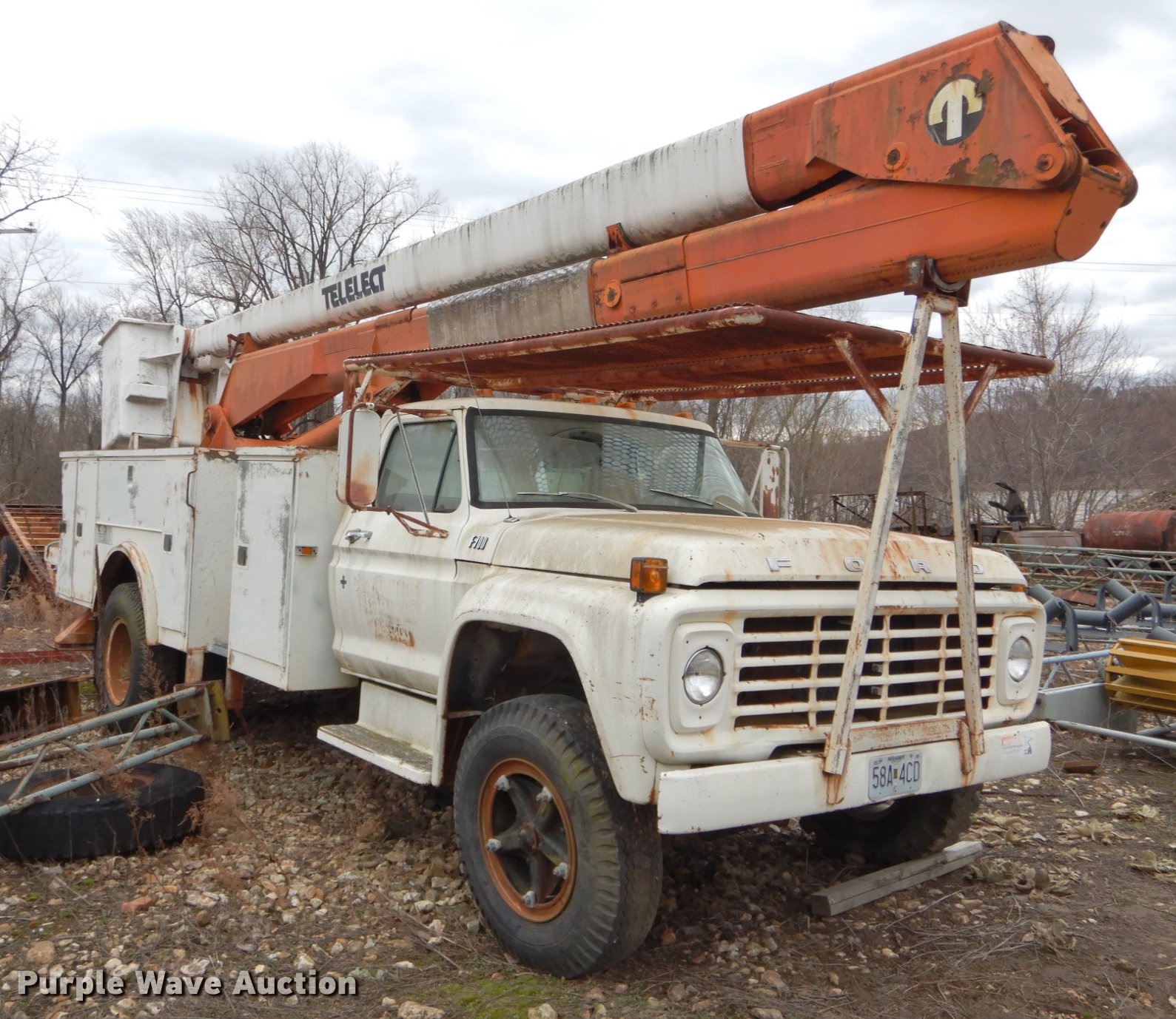 Purple Wave is selling a used Bucket Truck in Missouri. This item is a 1977 Ford F700 bucket truck with the following: 22,076 miles on odometer, Eight cylinder gas engine, Five speed manual transmission, Single axle, Heat, AM/FM, Suspension seat, PTO, 14'L utility bed, Shelving, Telelect TN50 boom, 600 lbs maximum lift capacity, 50' boom length, Man basket, Platform and ground controls, Articulating insulated boom, (2) outriggers, Serial TN50102HH, Single fuel tank, Pintle hitch, 176" wheelbase, Spring suspension, Hydraulic brakes, 10.00-20 tires, GVWR 23,000 lbs, Unknown operating condition, Hydraulic hoses need fixed, Non-operational brakes