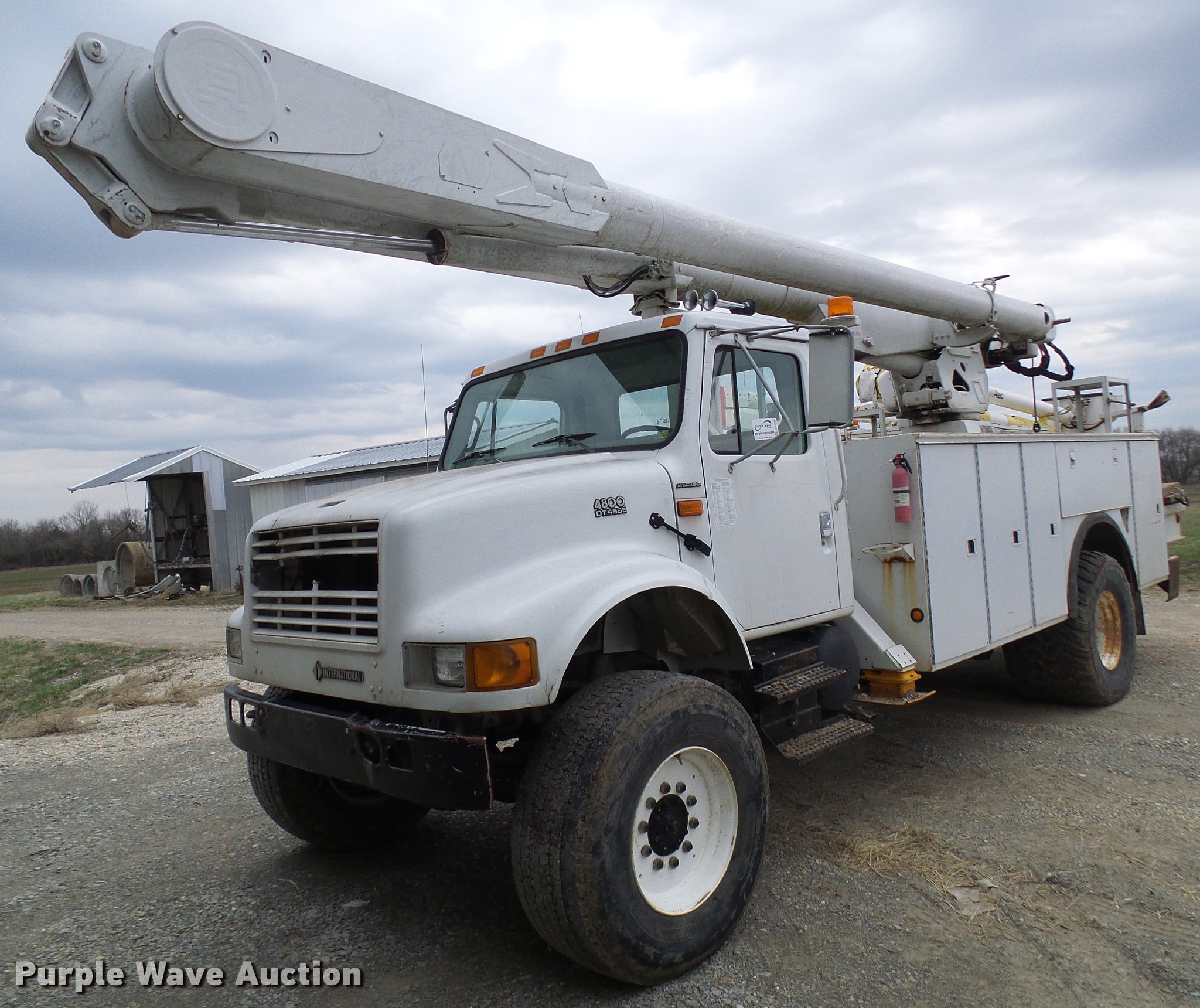 Purple Wave is selling a used Bucket Truck in Missouri. This item is a 2000 International 4800 bucket truck with the following: 87,292 miles on odometer, International DT466 7.6L L6 turbo diesel engine, Automatic transmission, Inter-axle differential lock, Single axle, AC and heat, Cruise, AM/FM, Suspension seat, PTO, Knapheide 6173AC utility bed, 18'L, Shelving, Altec AM855 boom, 600 lbs maximum lift capacity, 55' maximum lift height, Man basket, Ground and platform controls, Articulating boom, Rope material handler, (4) outriggers, Single fuel tank, Pintle hitch, Trailer wiring, Spring suspension, Air brakes, 425/65R22.5 front tires, 600/50R22.5 rear tires, Unit# 222