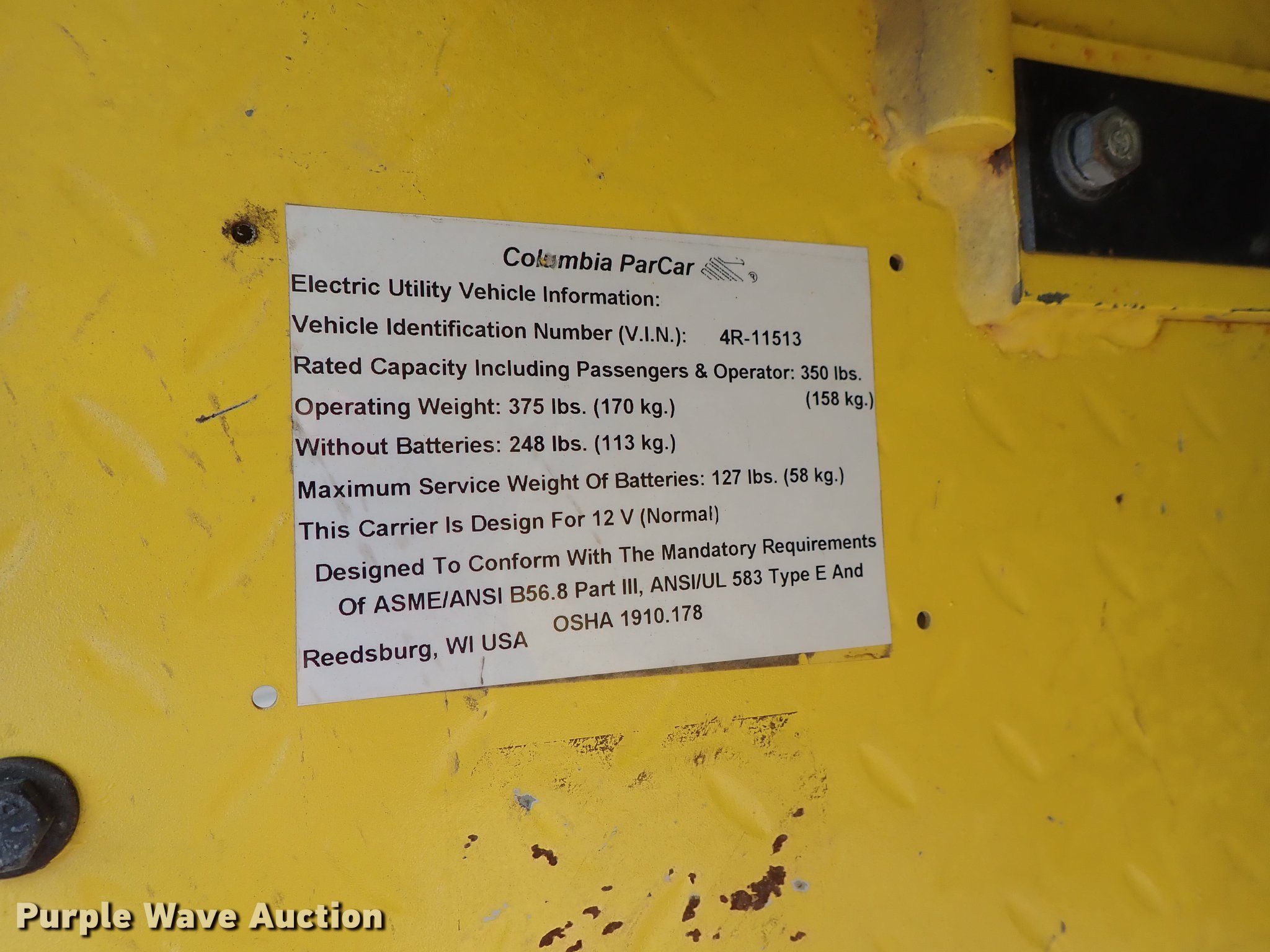 Columbia Parcar cart. Electric motor, Forward and reverse, 350 lbs capacity, 480/4.00-8 tires, Non-operational unit, Serial 4R-11513. High Reach Equipment. 3624 W 30th Street S. Wichita, KS 67217
