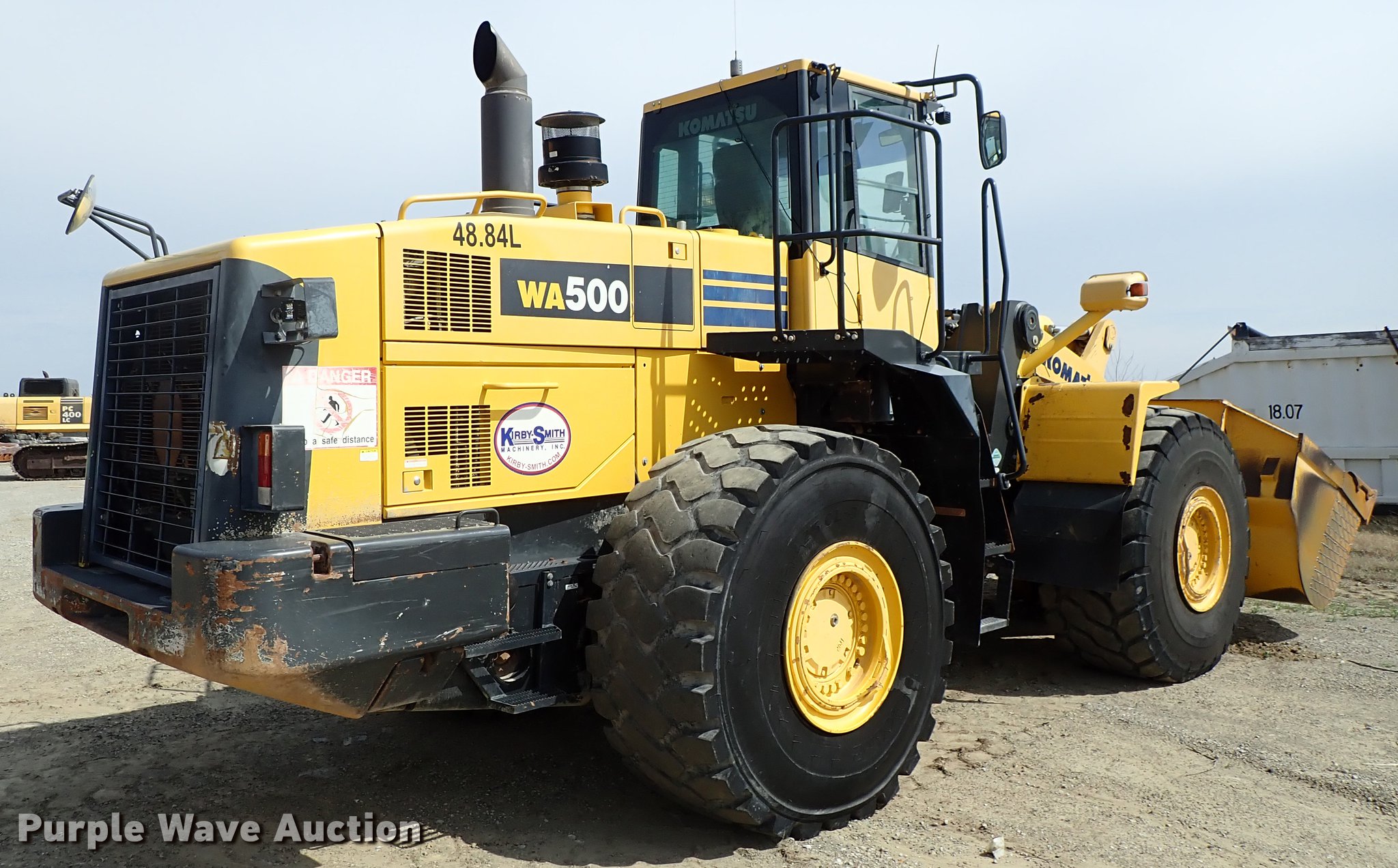 Purple Wave is selling a used Wheel Loader in Oklahoma. This item is a 2010 Komatsu WA500-6 wheel loader with the following: 18,343 hours on meter, Komatsu six cylinder turbo diesel engine, Powershift transmission, 4F-4R gears, Enclosed cab, AC and heat, Two-lever bucket controls, 132"W general purpose bucket, Bolt-on cutting edge, Loadrite 2180 scale, 29.5R25 tires, Serial 55645, Unit# 48.84L