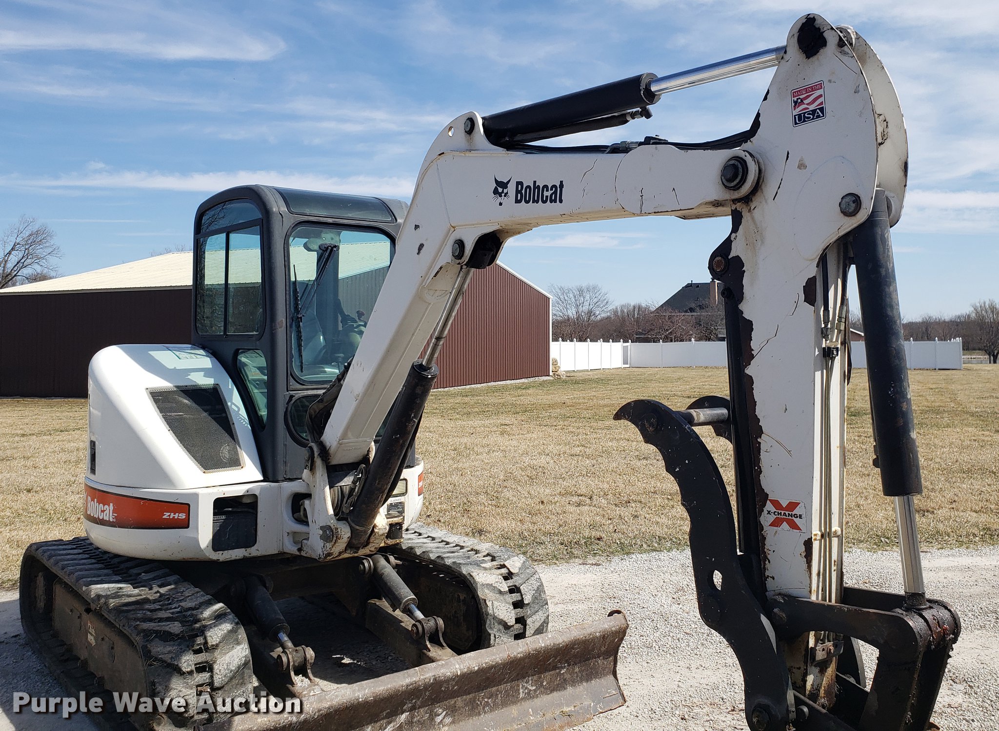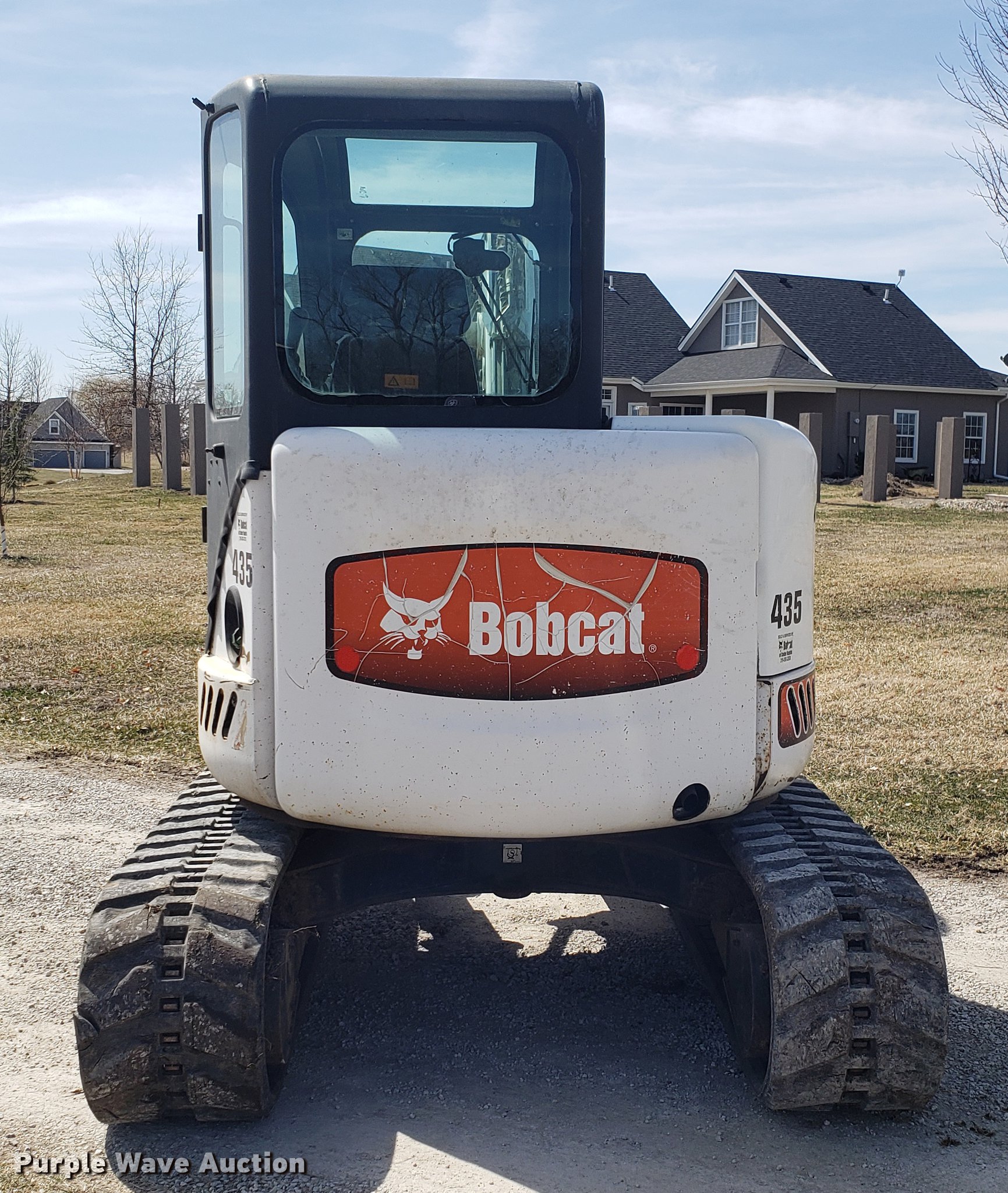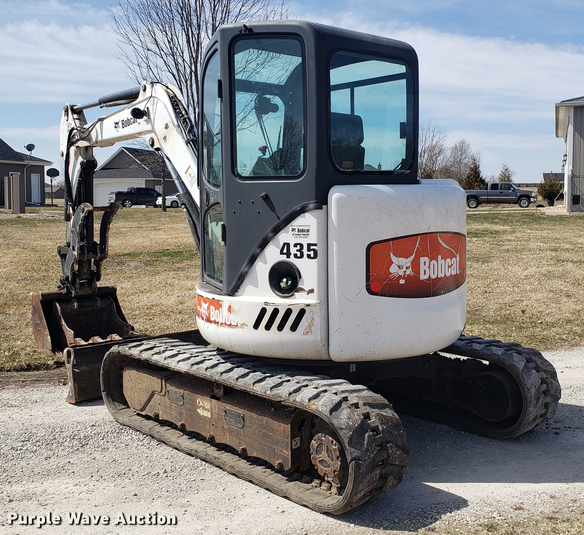 Purple Wave is selling a used Mini Excavator in Missouri. This item is a 2008 Bobcat 435 mini excavator with the following: 2,468 hours on meter, Kubota four cylinder diesel engine, Hydrostatic transmission, EROPS, AC and heat, AM/FM, 54" stick length, 24"W bucket, (4) teeth, 32"W bucket, (5) teeth, Hydraulic thumb, Mechanical quick coupler, 76"W backfill blade, 15"W rubber tracks, Serial AACB11003