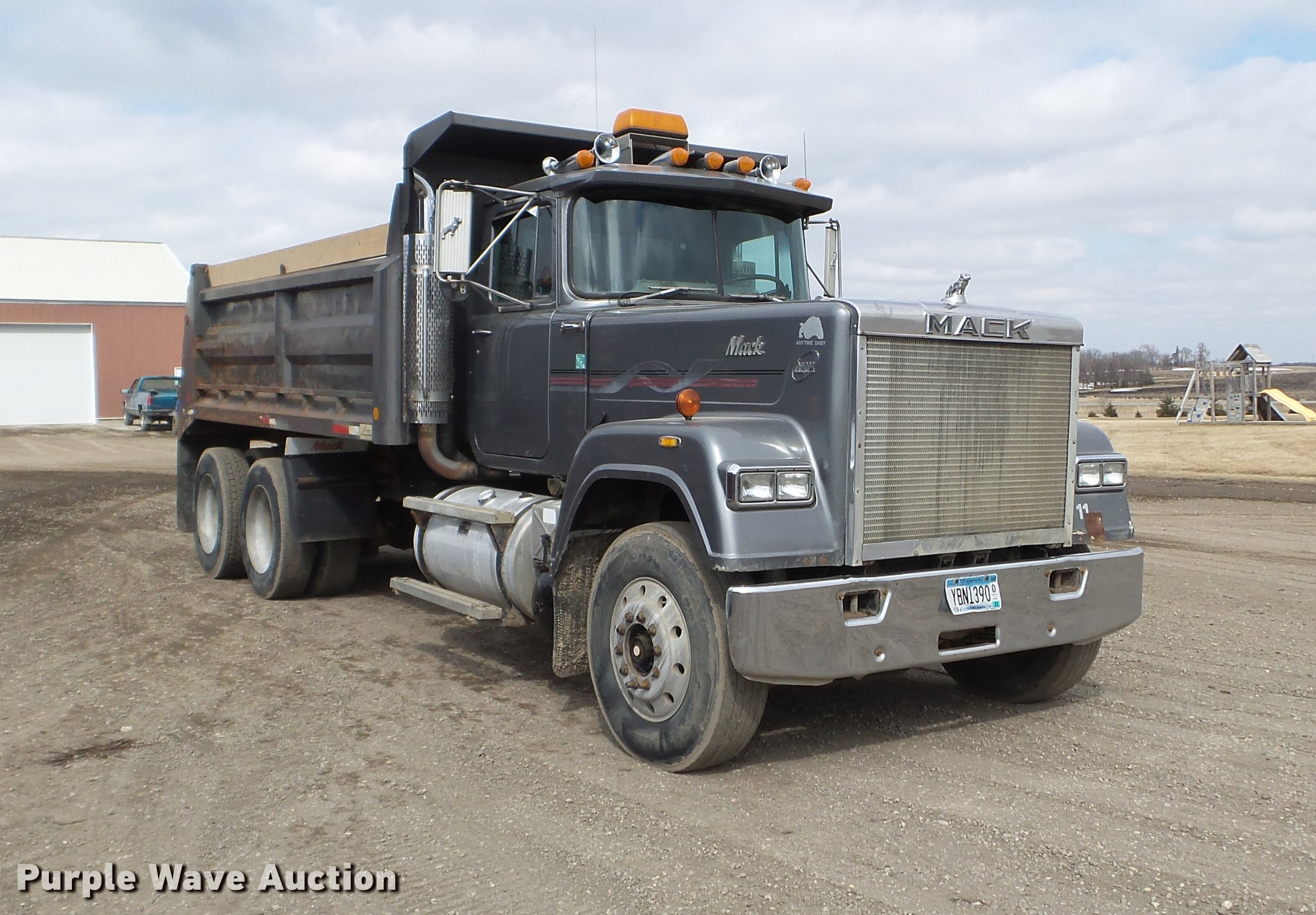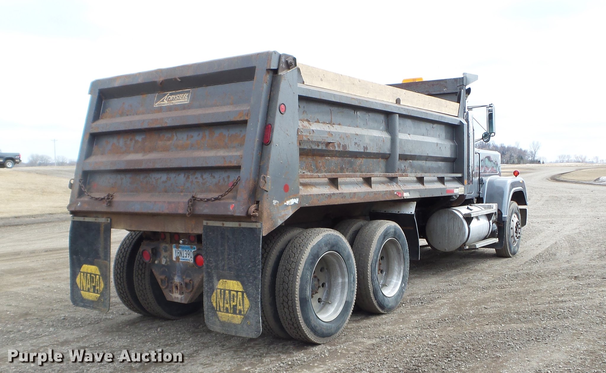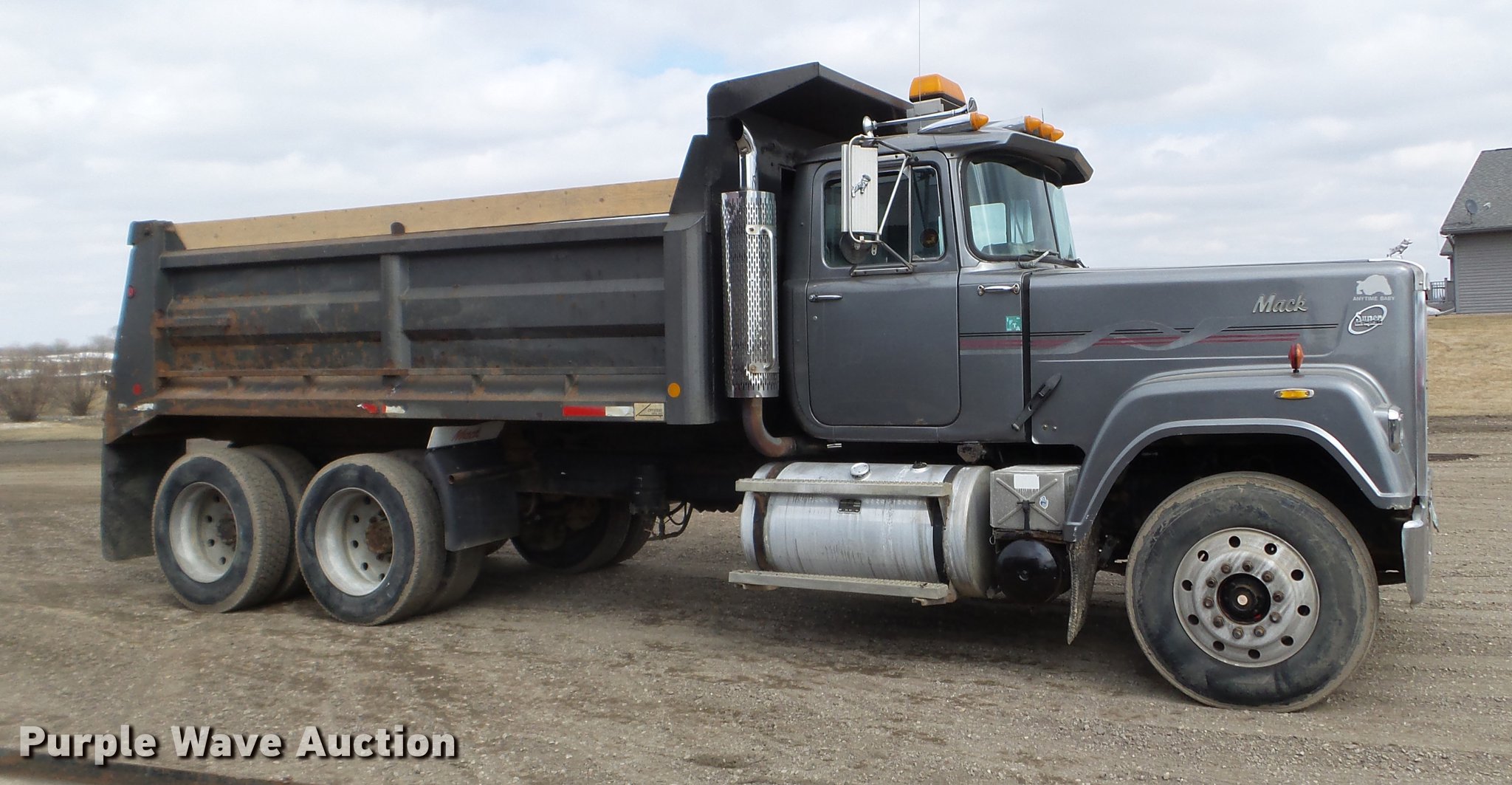 Purple Wave is selling a used Construction Dump Truck in Minnesota. This item is a 1987 Mack RW713 dump truck with the following: 502,968 miles on odometer, 3,080 hours on meter, Mack E7 six cylinder diesel engine, 13 speed manual transmission, Tandem axle, Inter-axle differential lock, Heat, AM/FM, Air suspension seat, Crysteel steel barrel dump bed, 16'L x 96"W, 40" side height, 6" side board height, Single ram hoist, Air operated end gate, Dual fuel tanks, Camelback suspension, Air brakes, Engine brake, 11R22.5 front tires, 285/27R24.5 rear tires