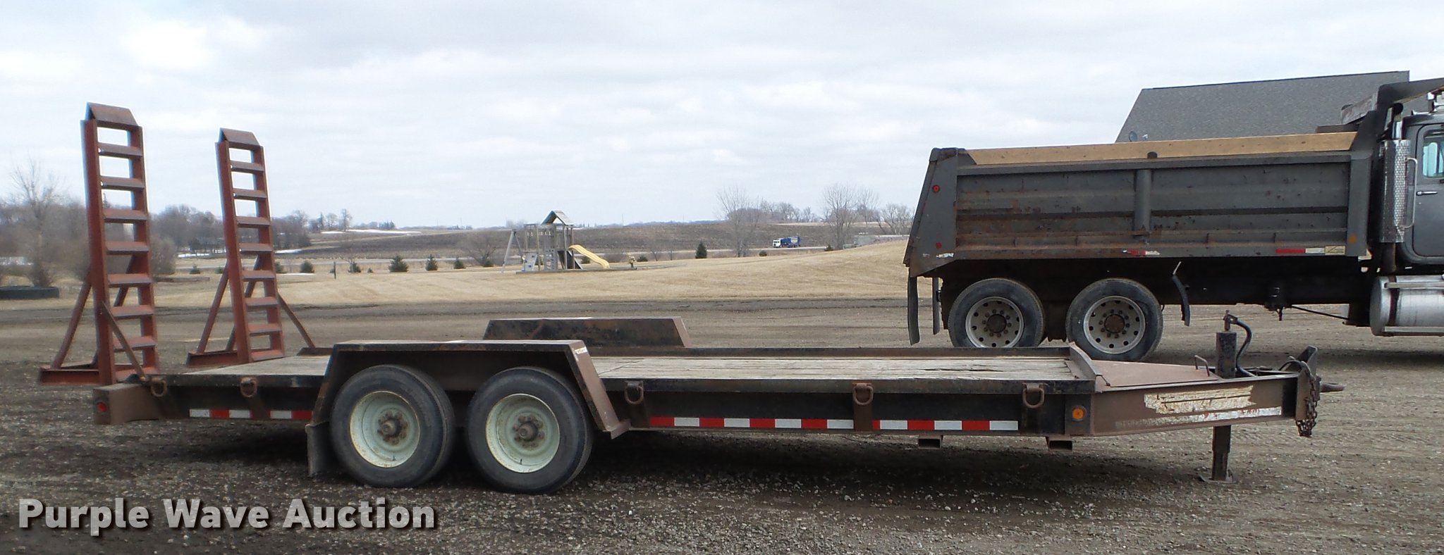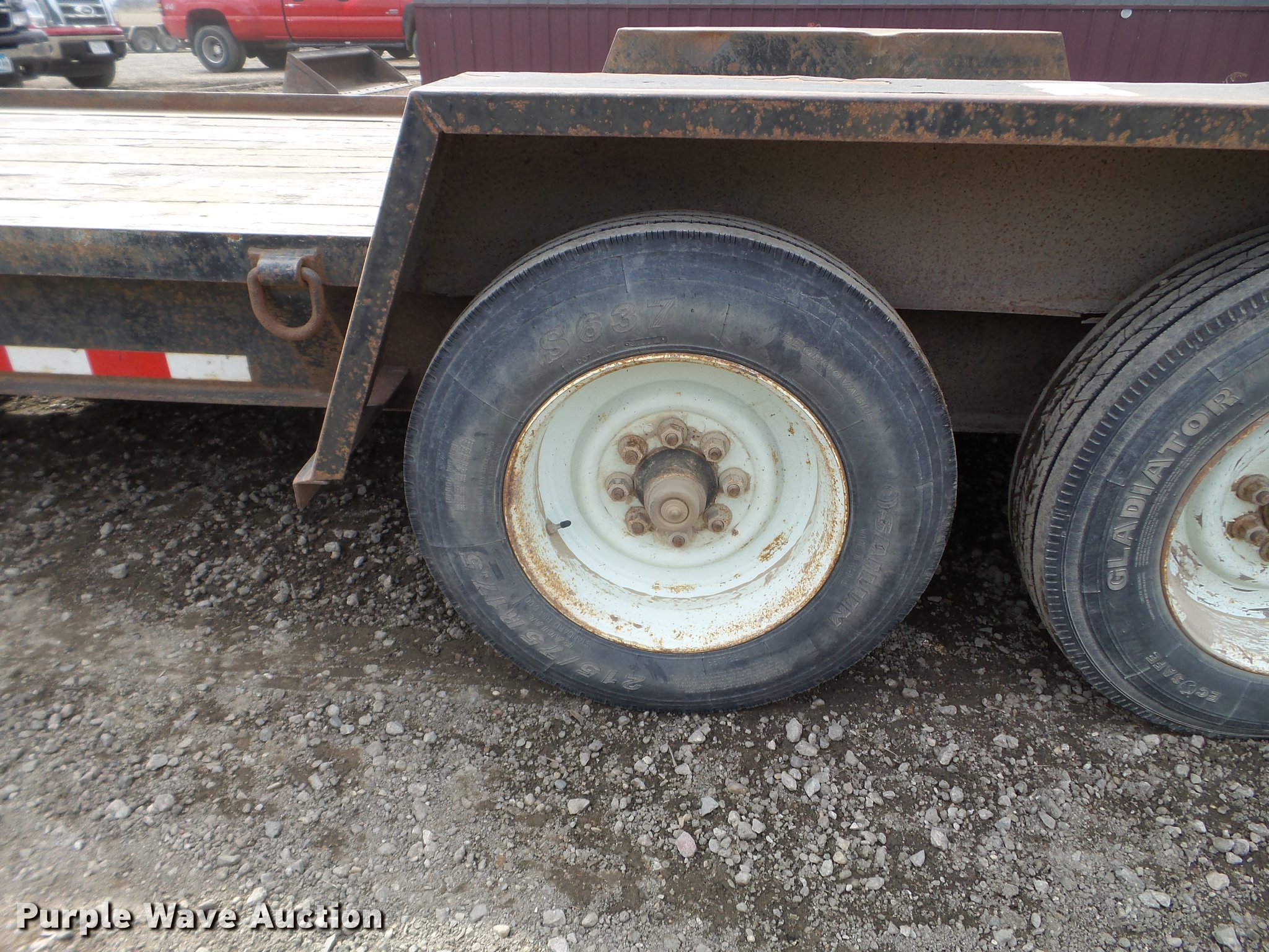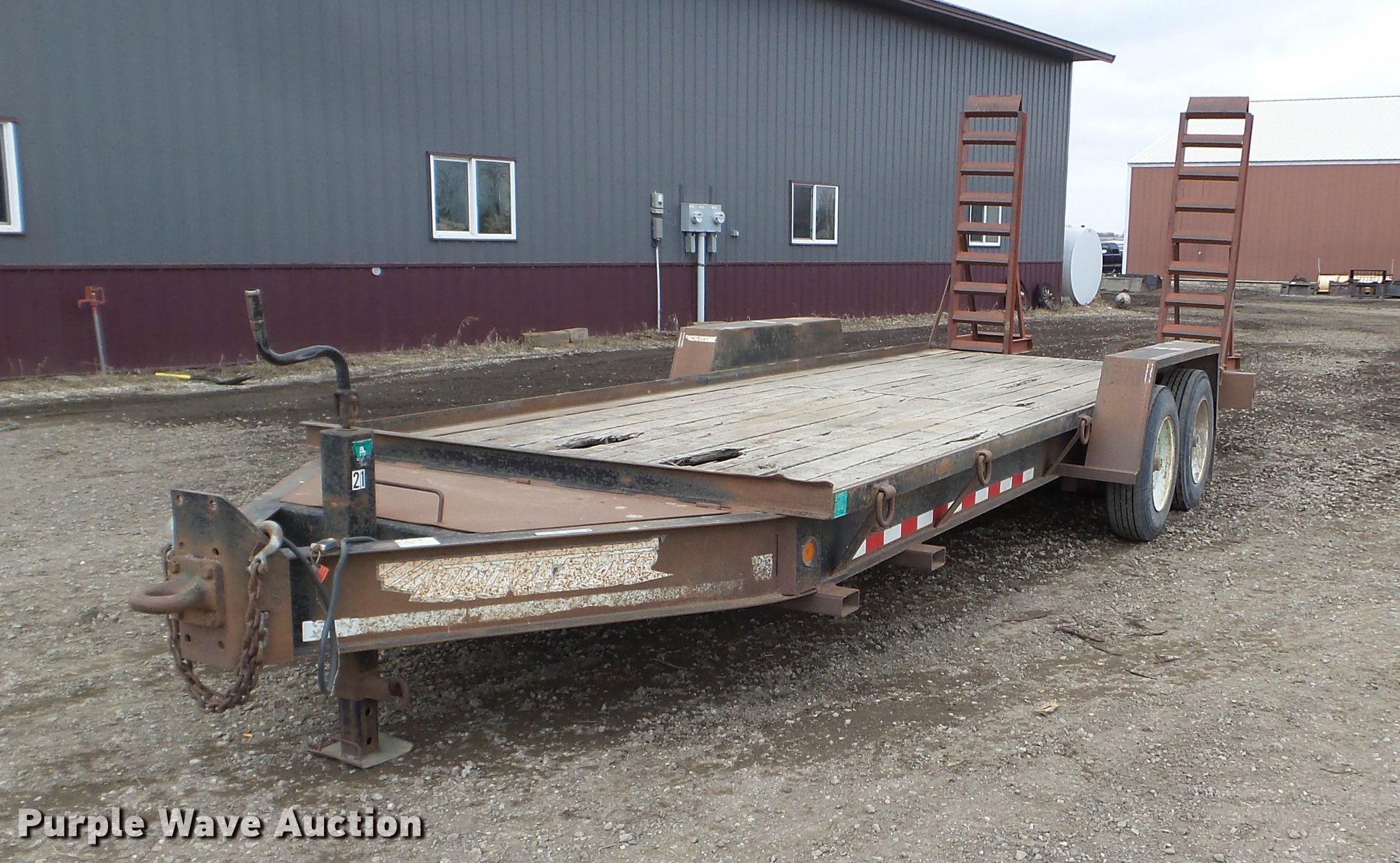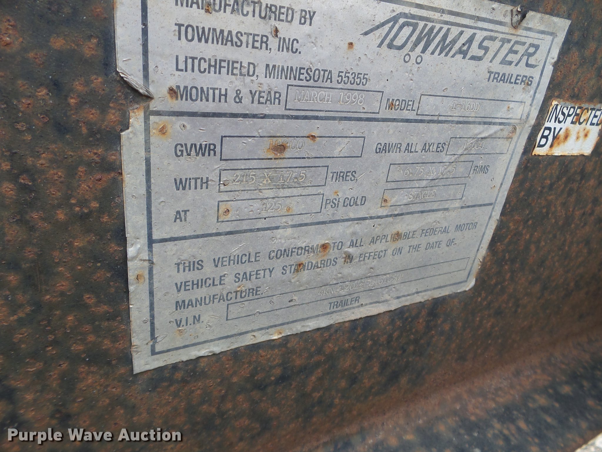 Purple Wave is selling a used Equip. Trailer in Minnesota. This item is a 1998 Towmaster T-16DD equipment trailer with the following: 25' overall length, 20'L x 82"W wood deck, 6'L ramps, 24" floor height, D-ring tie downs, Recessed toolbox, Pintle hitch, Single leg landing gear, Spring suspension, Electric brakes, Tandem axle, Steel wheels, 215/75R17.5 tires, GVWR 16,600 lbs