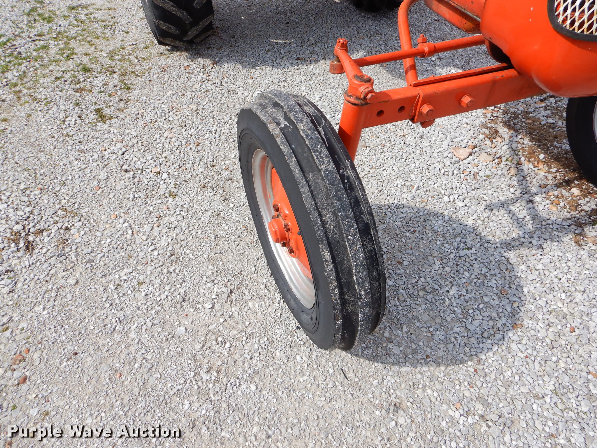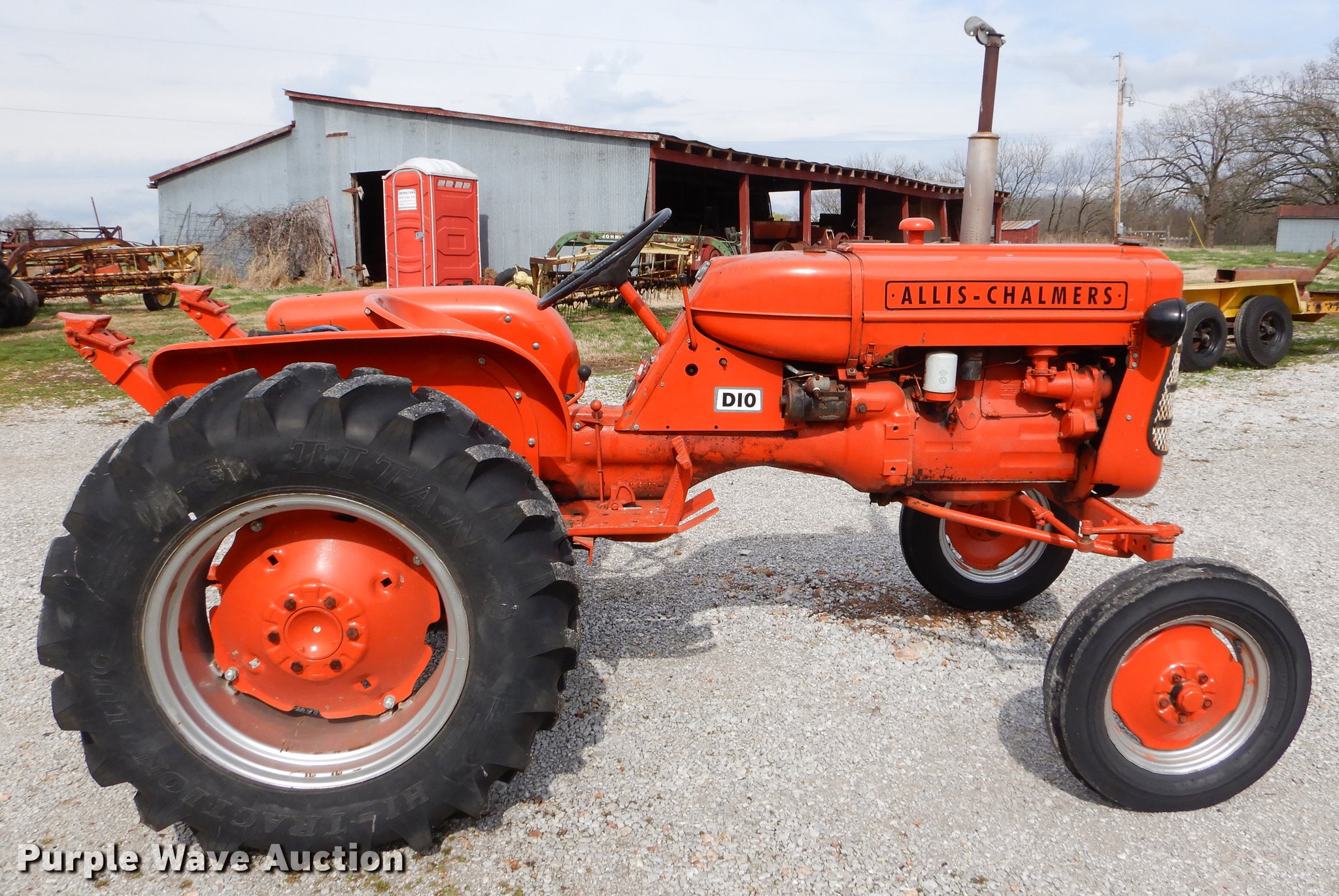 Purple Wave is selling a used Tractor in Missouri. This item is a 1959 Allis Chalmers D10 tractor with the following: Allis Chalmers four cylinder gas engine, Sliding gear transmission, 4F-1R gears, Three point, 540 PTO, 5.00-15 front tires, 12.4-24 rear tires, Generator is unhooked, Serial D101103