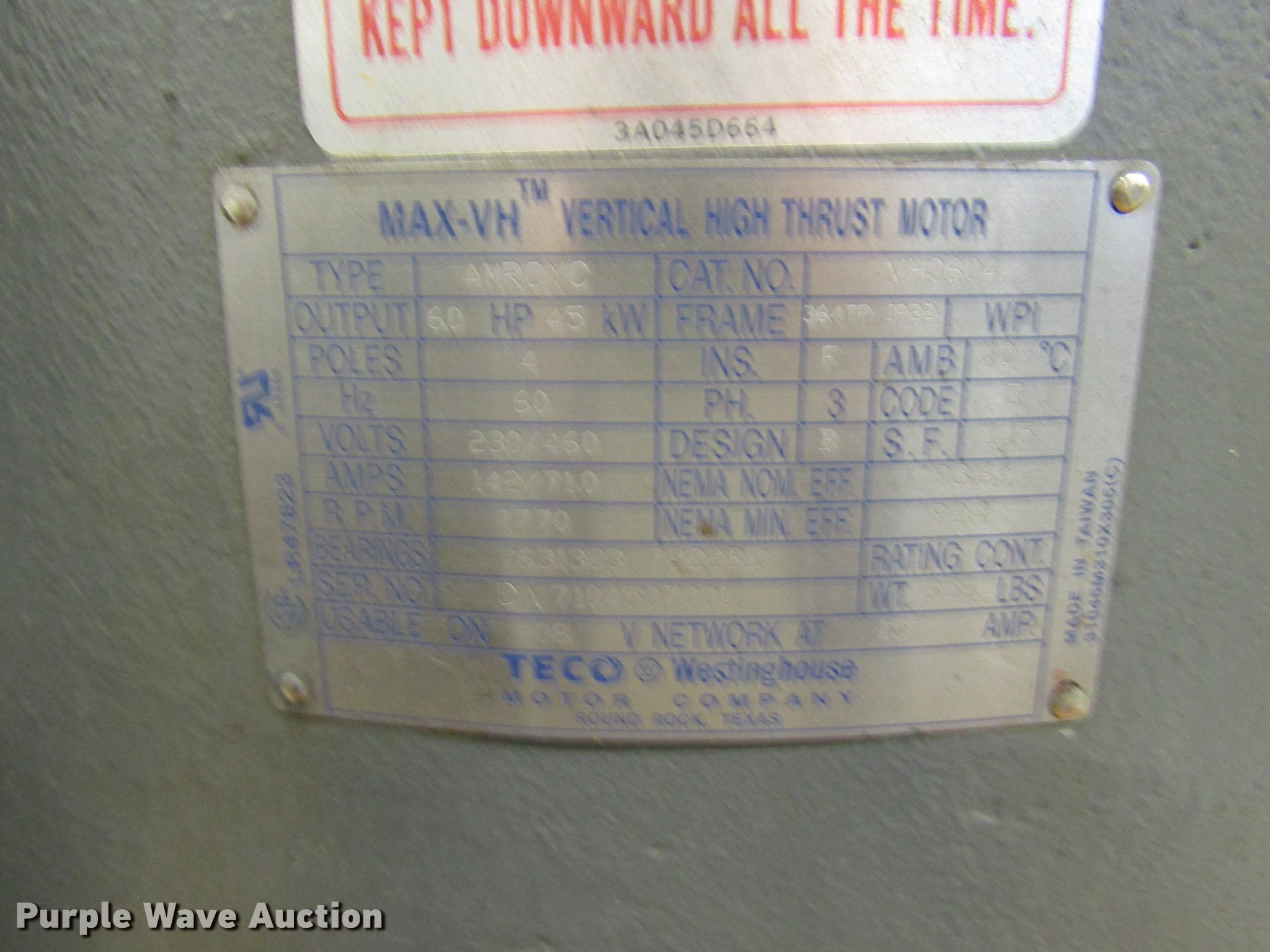 Purple Wave is selling a used Electric Motor in Kansas. This item is a Westinghouse electric motor with the following: Type AMRCYC, 60 HP, 45 kW, 60 Hz, 230/460V, 142/71.0 amps, Serial DV7104507001