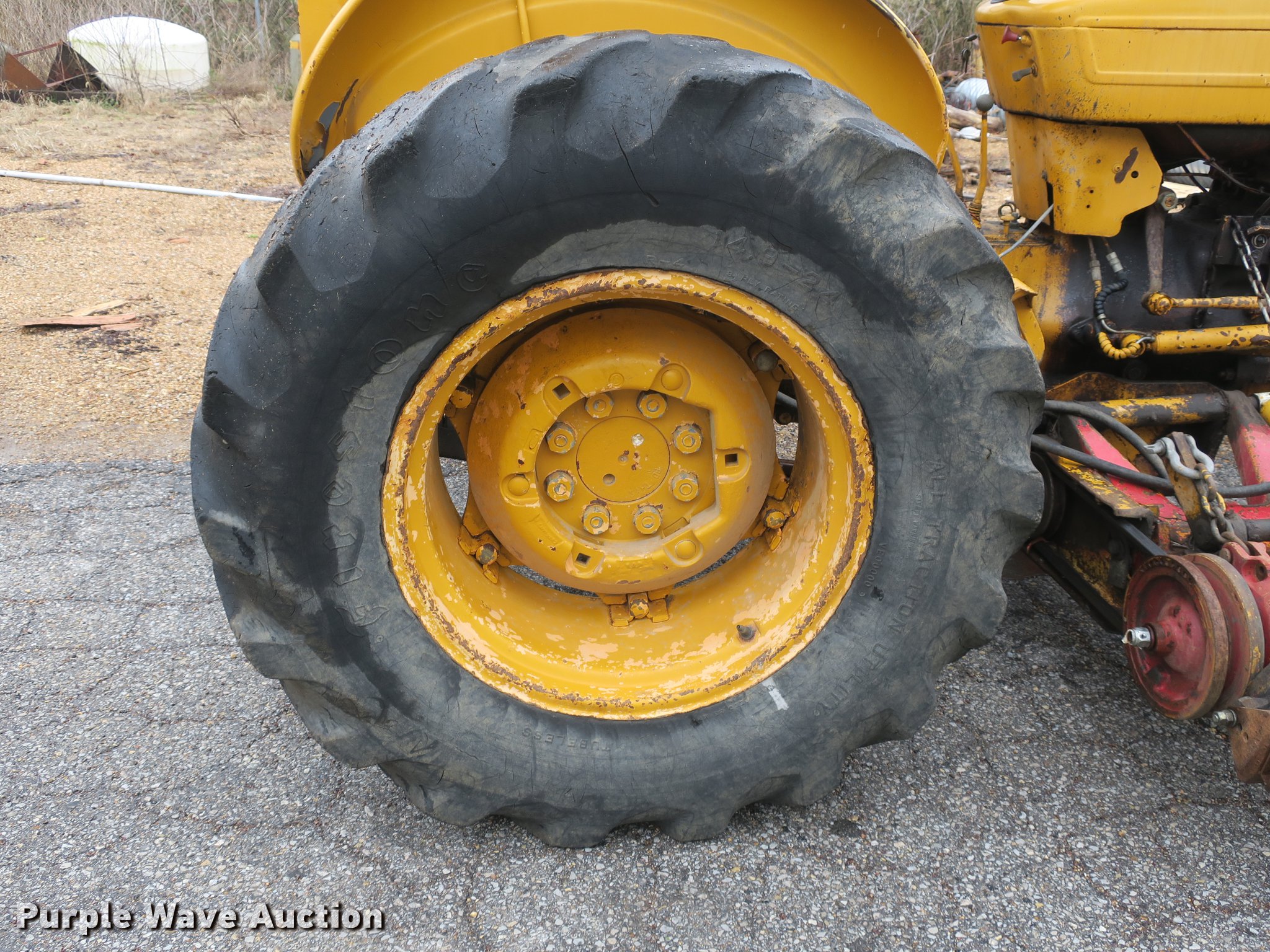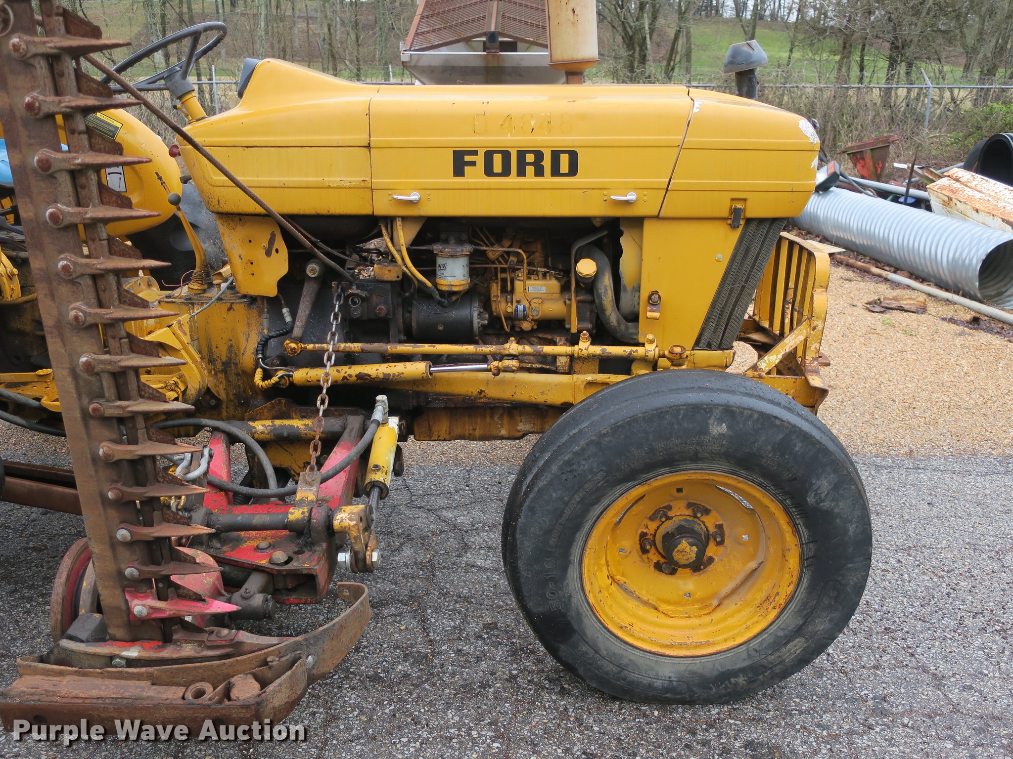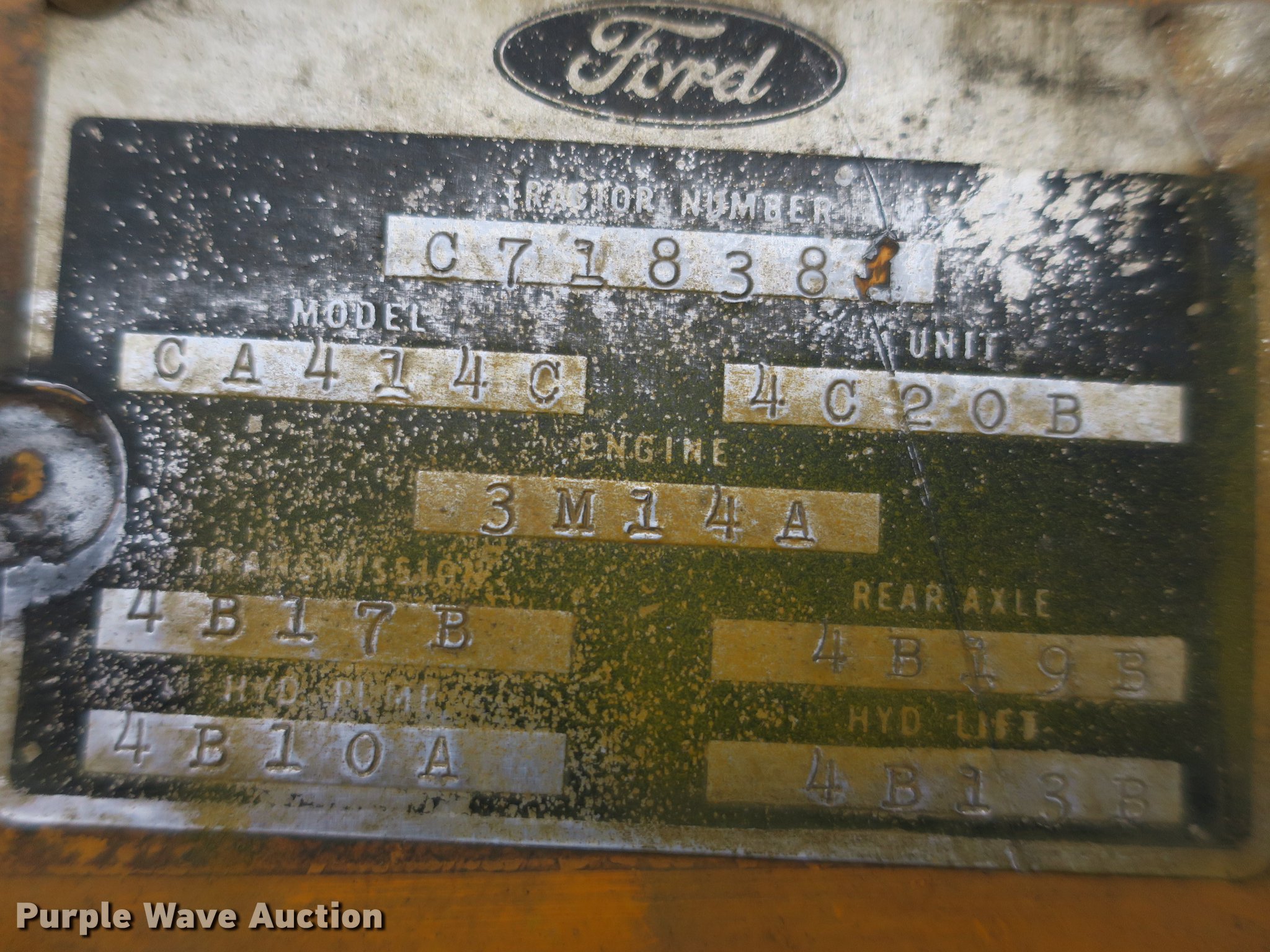 Purple Wave is selling a used Tractor in Missouri. This item is a Ford CA414C tractor with the following: 6,172 hours on first hour meter, 1,225 hours on second hour meter, Ford 3M14A three cylinder diesel engine, Manual transmission, 8F-2R gears, Canopy, Suspension seat, Flashers, 69"L sickle mower, Plug cylinder missing, 7.50-16 front tires, 14.0-24 rear tires, Serial C71838