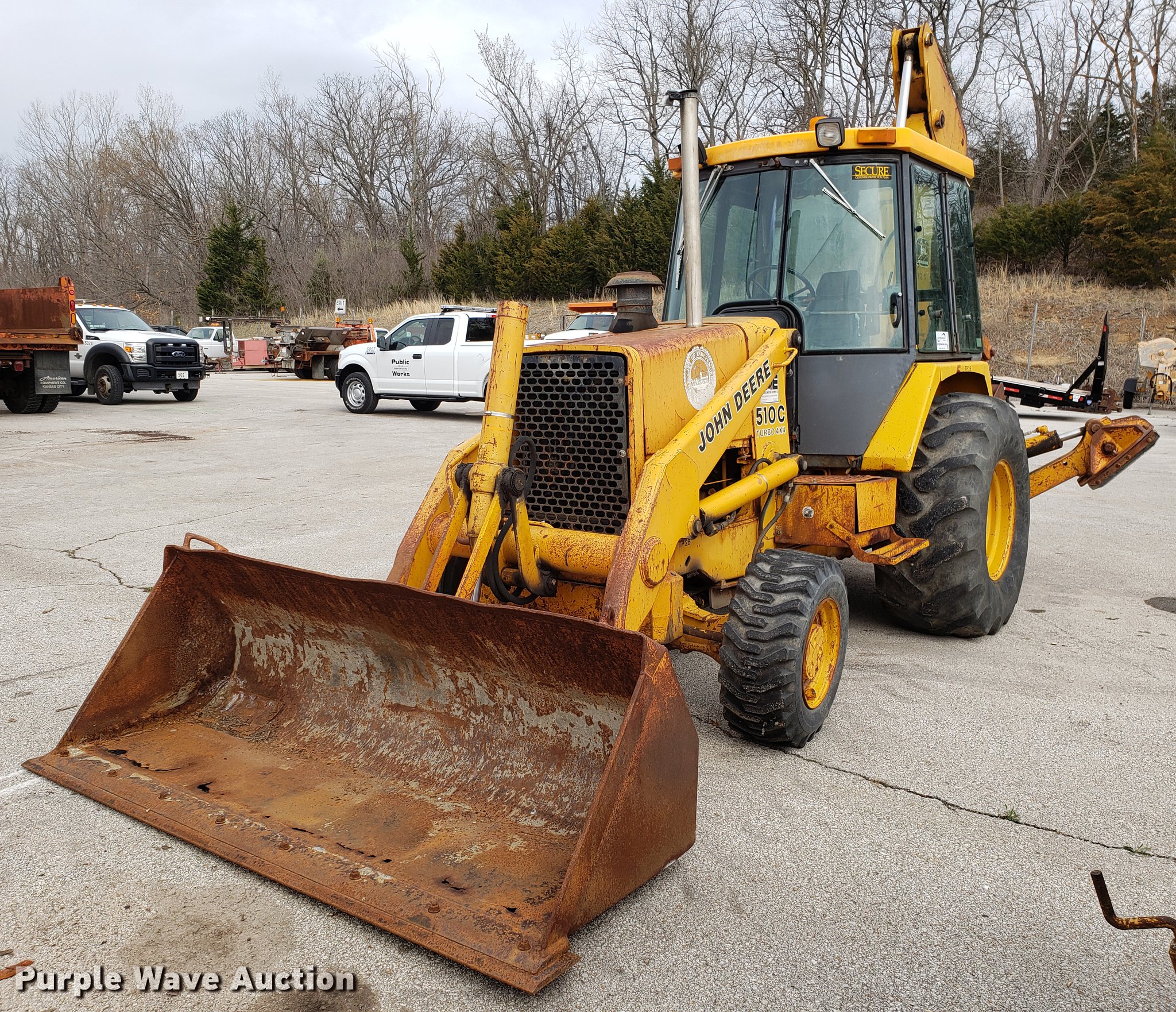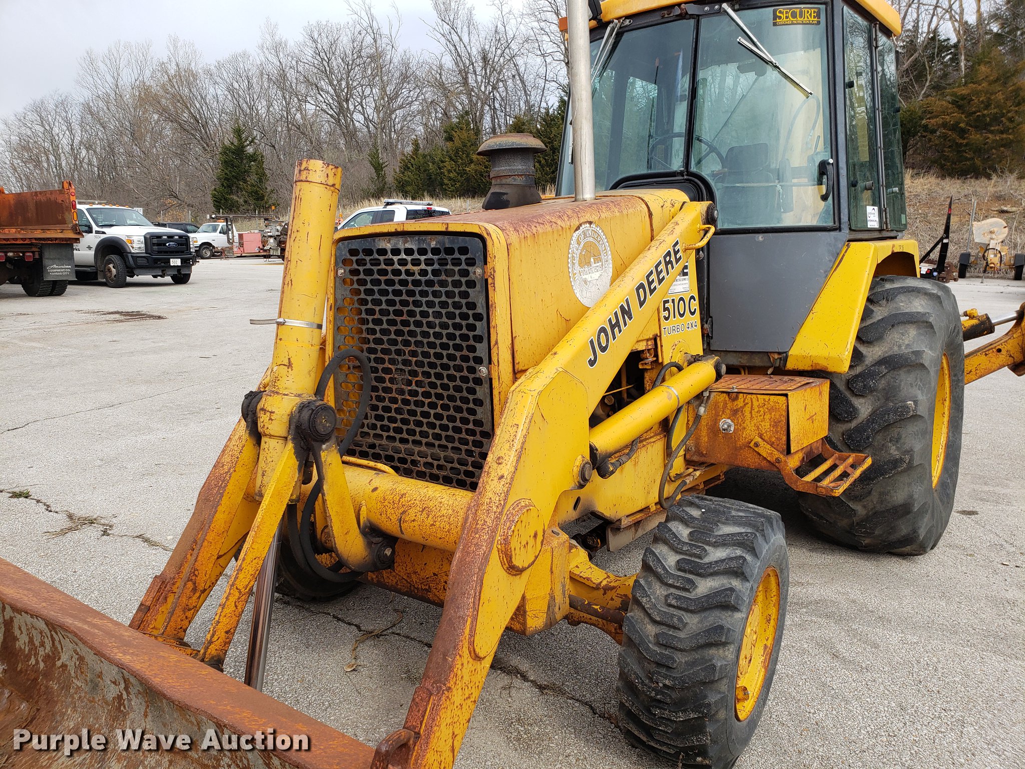 1991 John Deere 510C backhoe. 5,928 hours on meter, Four cylinder diesel engine, Shuttle shift transmission 4F-4R gears, Four wheel drive, Enclosed cab, Heat, Joystick loader controls, Two stick backhoe controls, Suspension seat, 90"W general purpose loader bucket, 24"W backhoe bucket (4) teeth, 21-24 tires, Dead batteries, Low tire, Serial T0510CG774380. City of Independence. 111 E Maple Ave. Independence, MO 64050