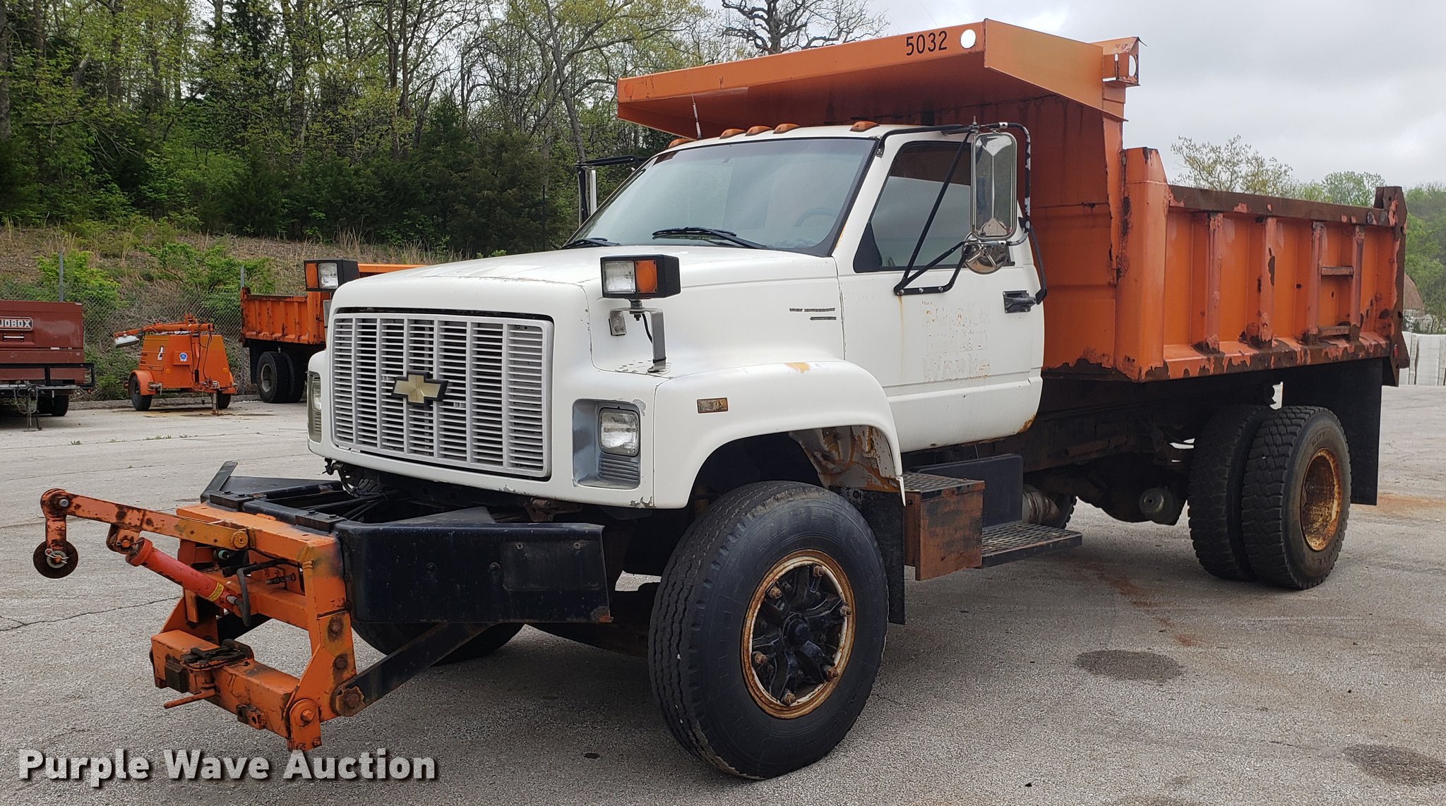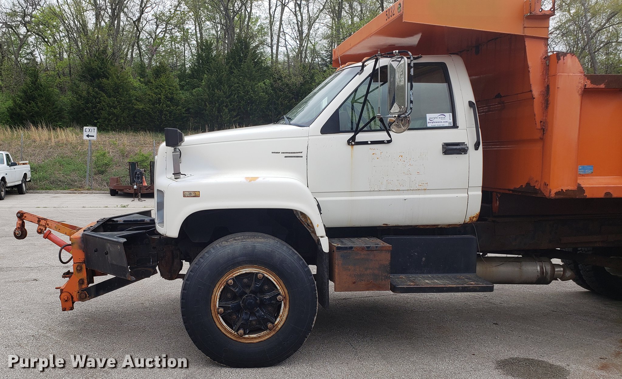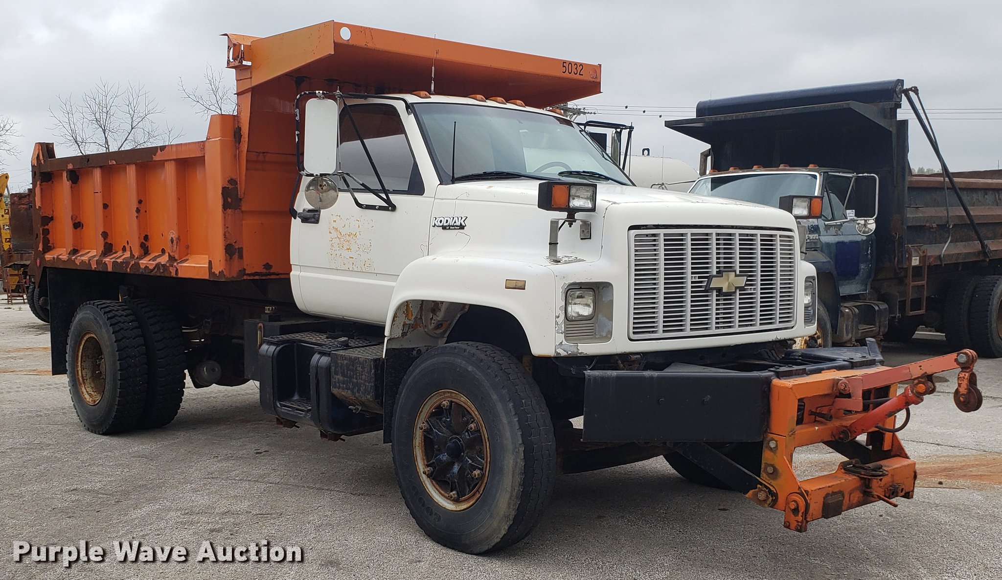 Purple Wave is selling a used Construction Dump Truck in Missouri. This item is a 1991 Chevrolet Kodiak C6500 dump truck with the following: 105,697 miles on odometer, Caterpillar 3116 6.6L six cylinder diesel engine, Automatic transmission, Heat, PTO, 11'L x 8'W steel dump bed, 32" side height, Single ram hoist, Front plow mount, Single fuel tank, Spring suspension, Air brakes, 10R20 tires, Dead battery