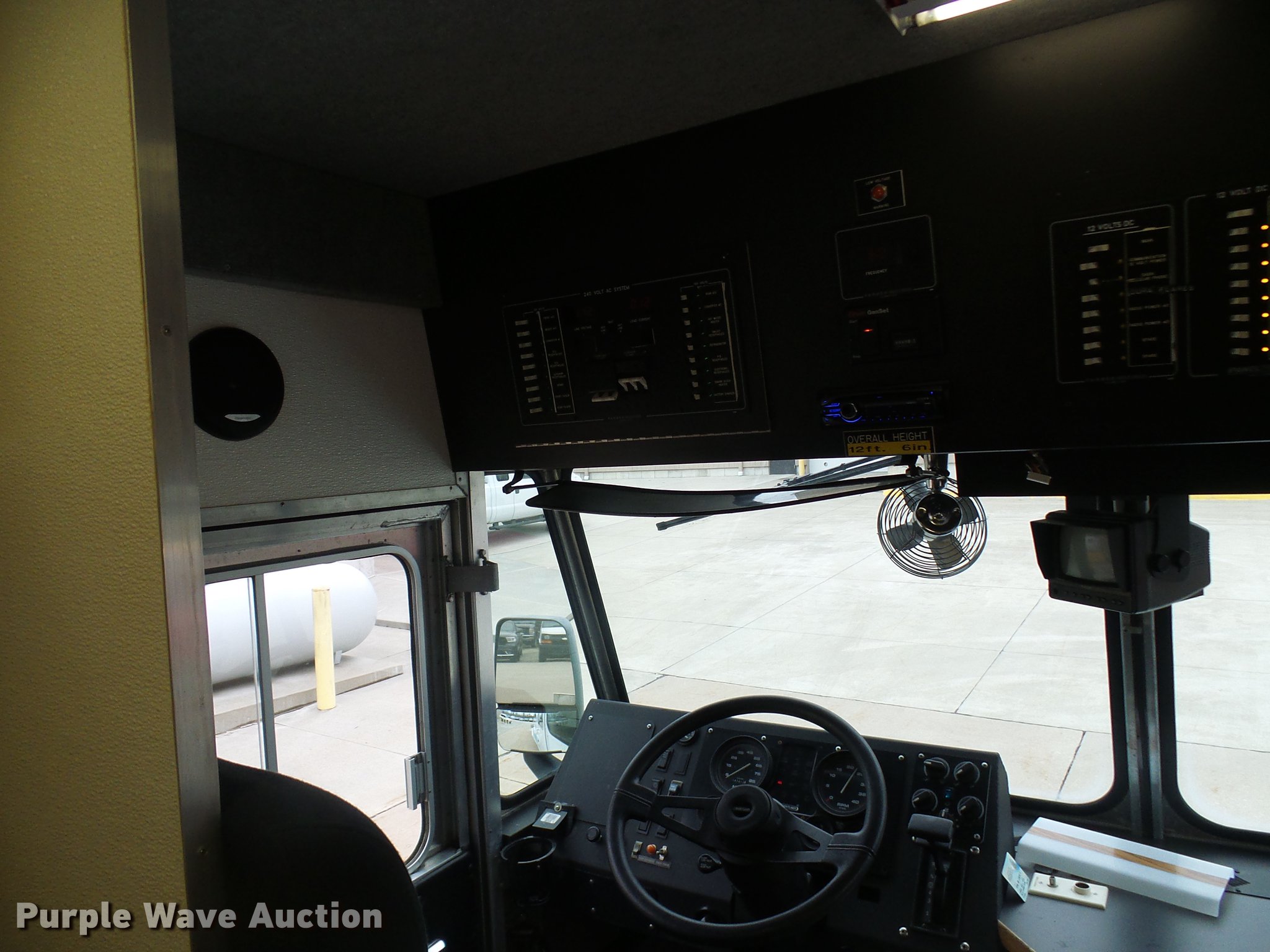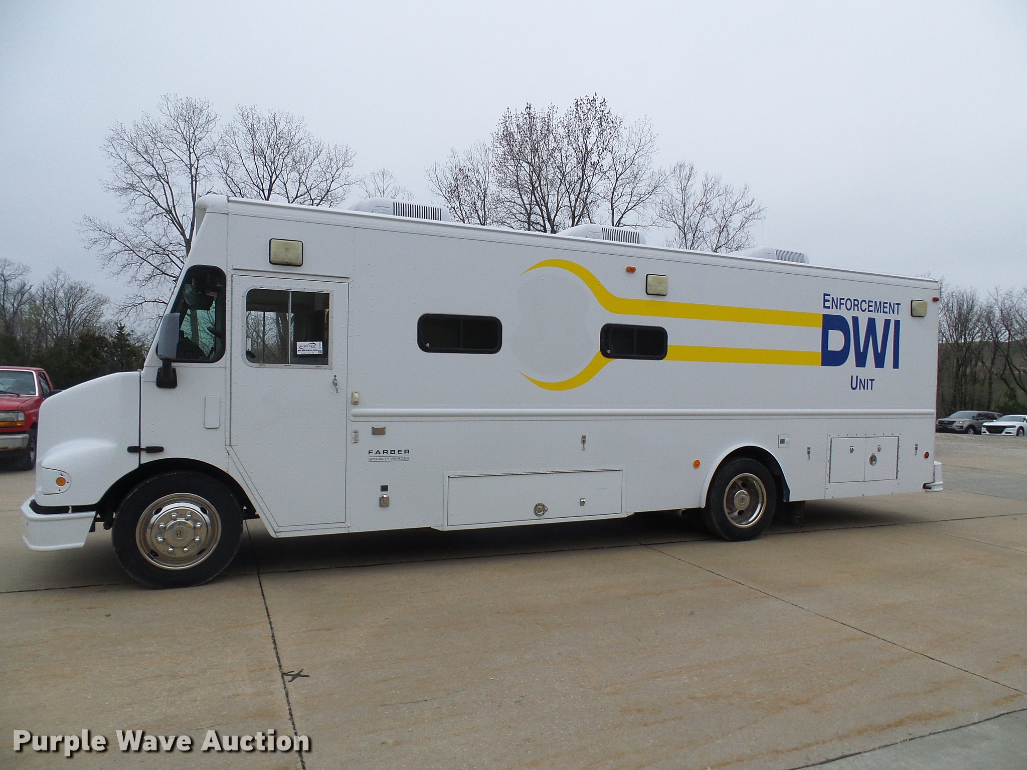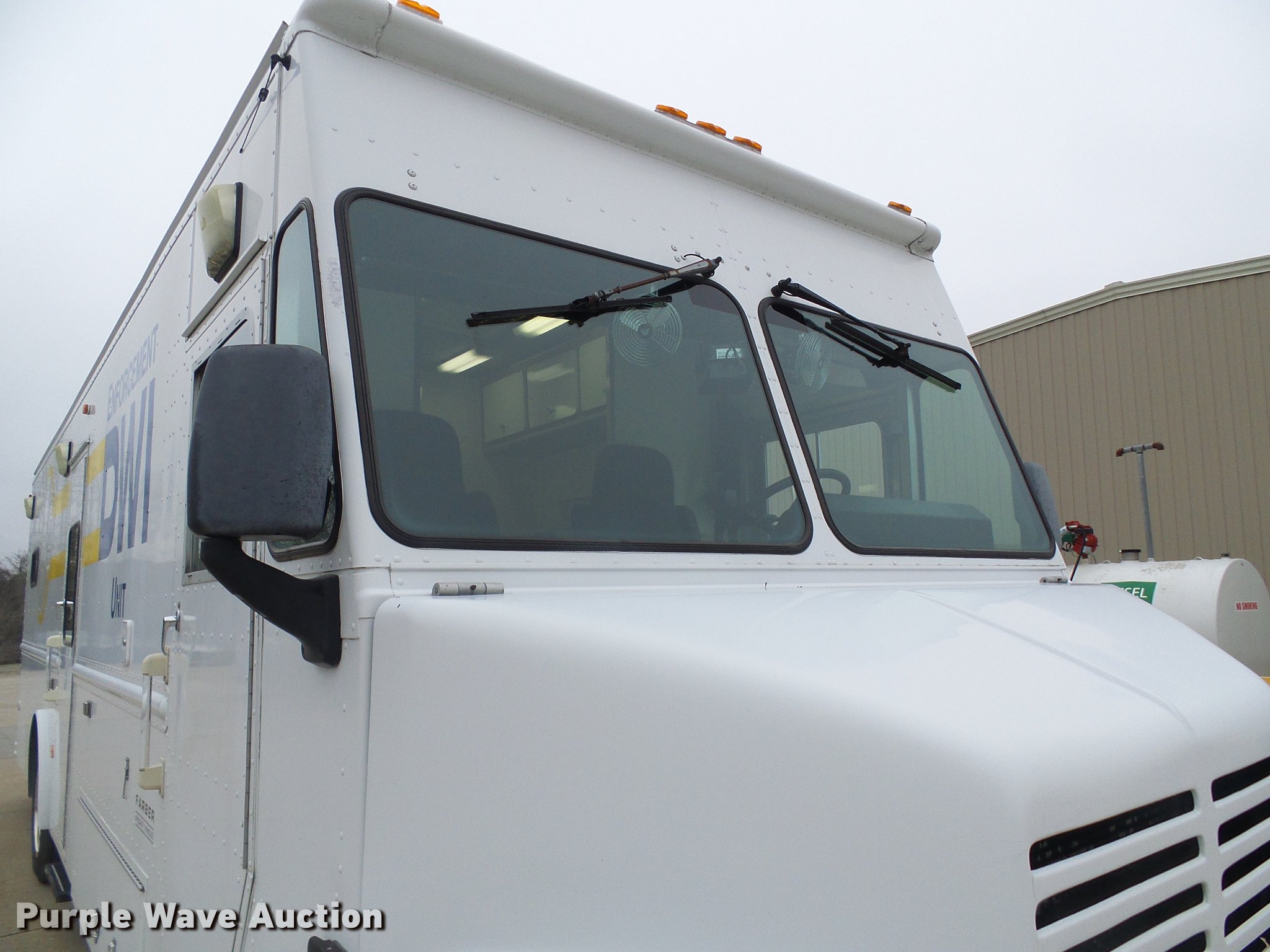 Purple Wave is selling a used Service Truck in Missouri. This item is a 2003 Freightliner MT55 DWI/DUI enforcement/command center truck with the following: 43,913 miles on odometer, Cummins ISB 5.9L L6 turbo diesel engine, Allison automatic transmission, Single axle, AC and heat, Cruise, AM/FM/CD, Power mirrors, Suspension seat, 32'L x 8'W body, Swinging side door, Swinging rear doors, Storage boxes, Custom shelving, Generator, 2,062 hours on meter, Onan CMQD three cylinder diesel engine, 12,000 watts, Pure-Sine inverter system, (3) roof AC units, Holding tank with running water, Refrigerator, Rear camera, Shore Power exterior power outlets, Single fuel tank, Receiver hitch, Spring suspension, Hydraulic brakes, 255/70R22.5 tires, GVWR 25,500 lbs