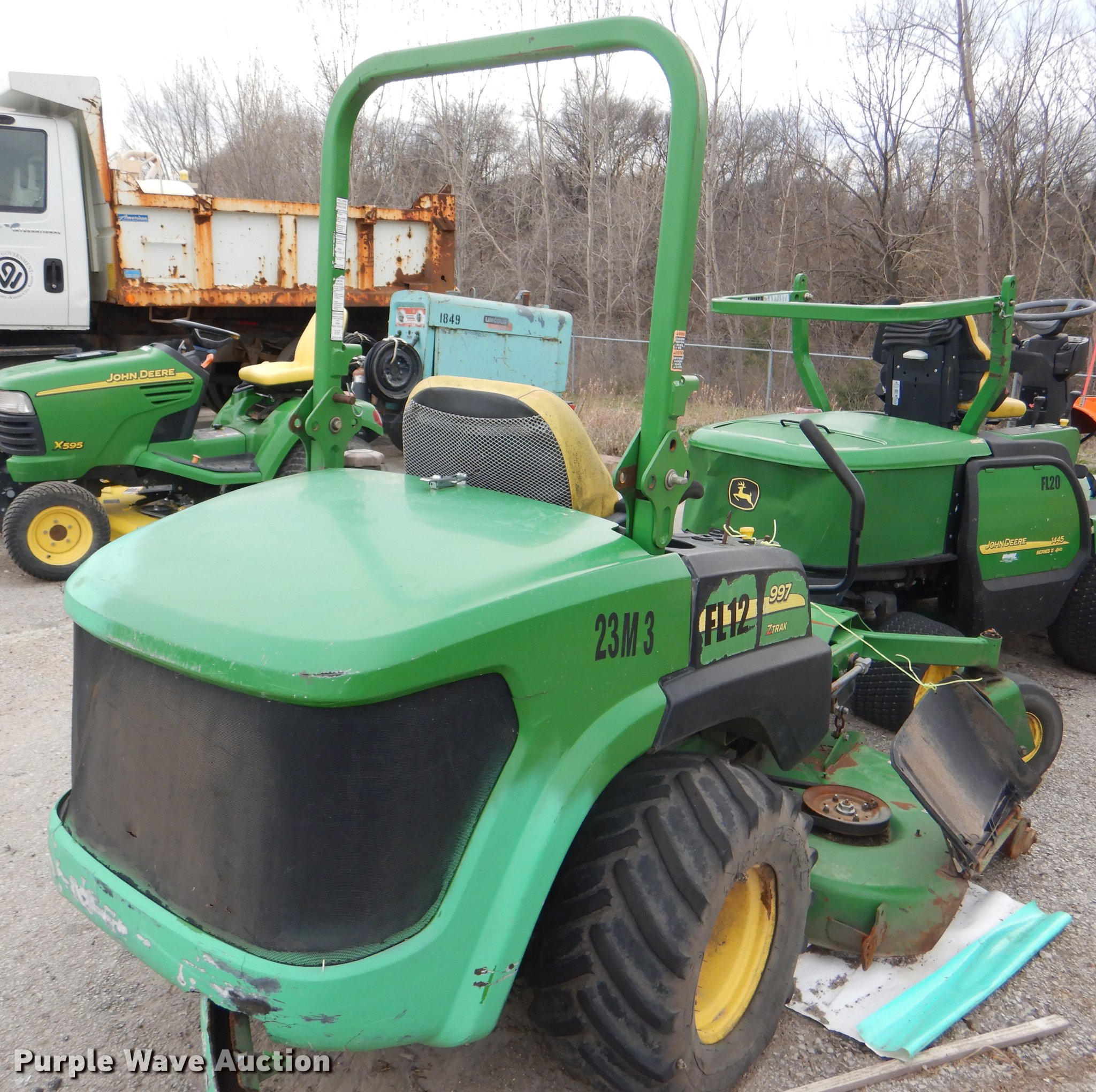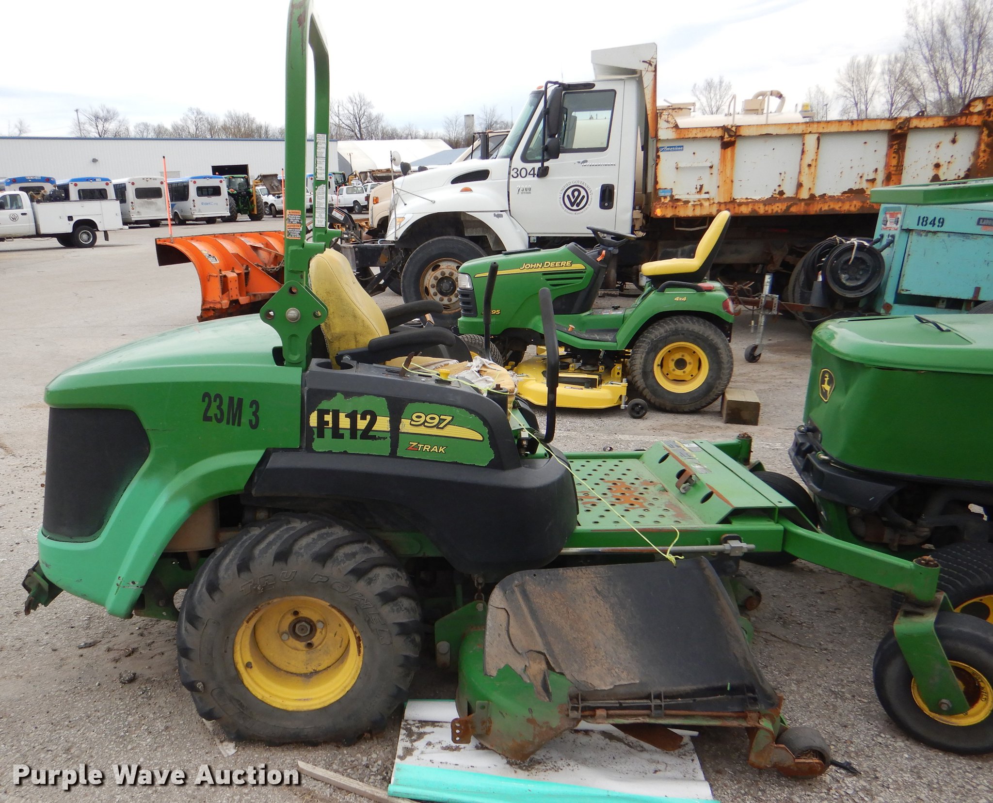 Purple Wave is selling a used Commercial Turf Mower in Kansas. This item is a John Deere 997 ZTrak ZTR lawn mower with the following: 72" cut, John Deere 3TNV82A-KJMZ three cylinder diesel engine, Serial CH3013D232441, Carlisle 15x6.00-6/4.50 front tires, Carlisle 2x12.00-12 rear tires, Flat rear tires, Hood damage, Non-operational unit, parts only