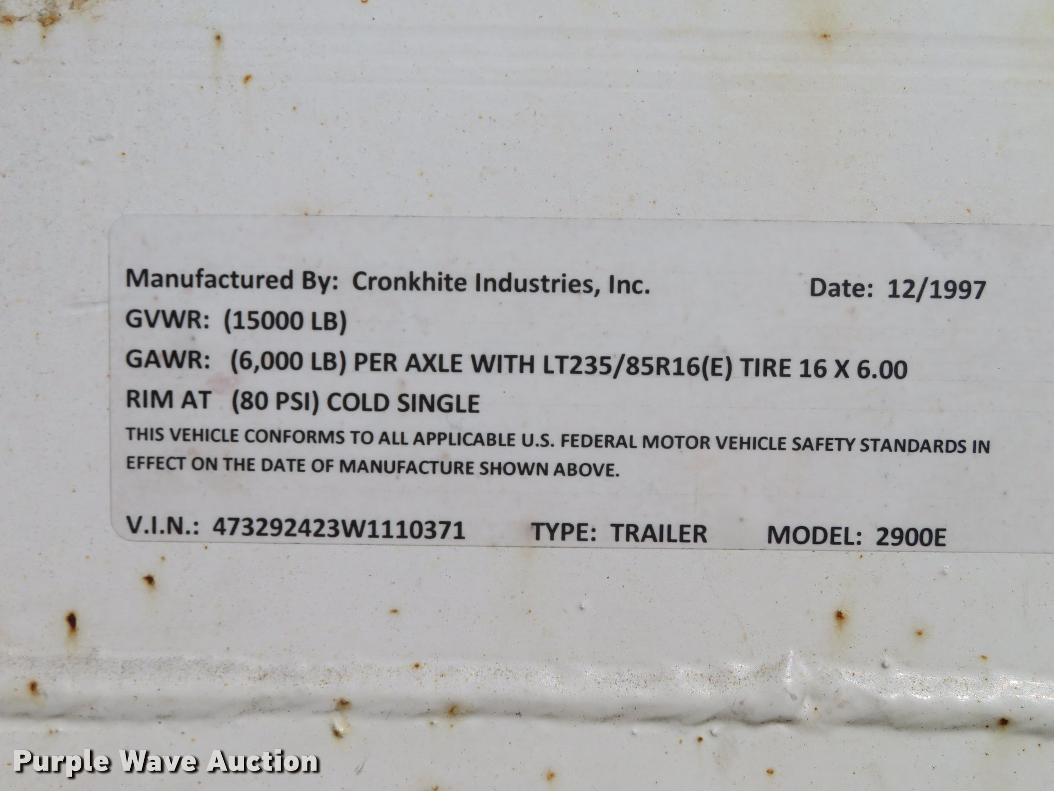 Purple Wave is selling a used Car or Utility Trailer in Missouri. This item is a 1998 Cronkite 2900E utility trailer with the following: 26'L x 100"W overall, 18'L x 79"W deck, 4'L x 14"W ramps, 16" floor height, Wood deck, Stake pockets, Pintle hitch, Single leg landing gear, Spring suspension, Electric brakes, Tandem axle, Steel wheels, LT235/85R16 tires, GVWR 15,000 lbs, GAWR 6,000 lbs