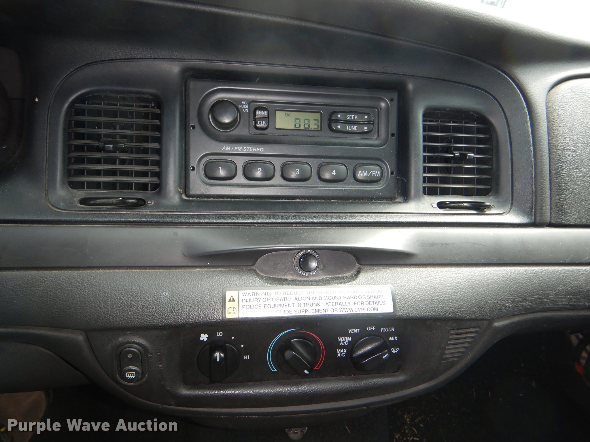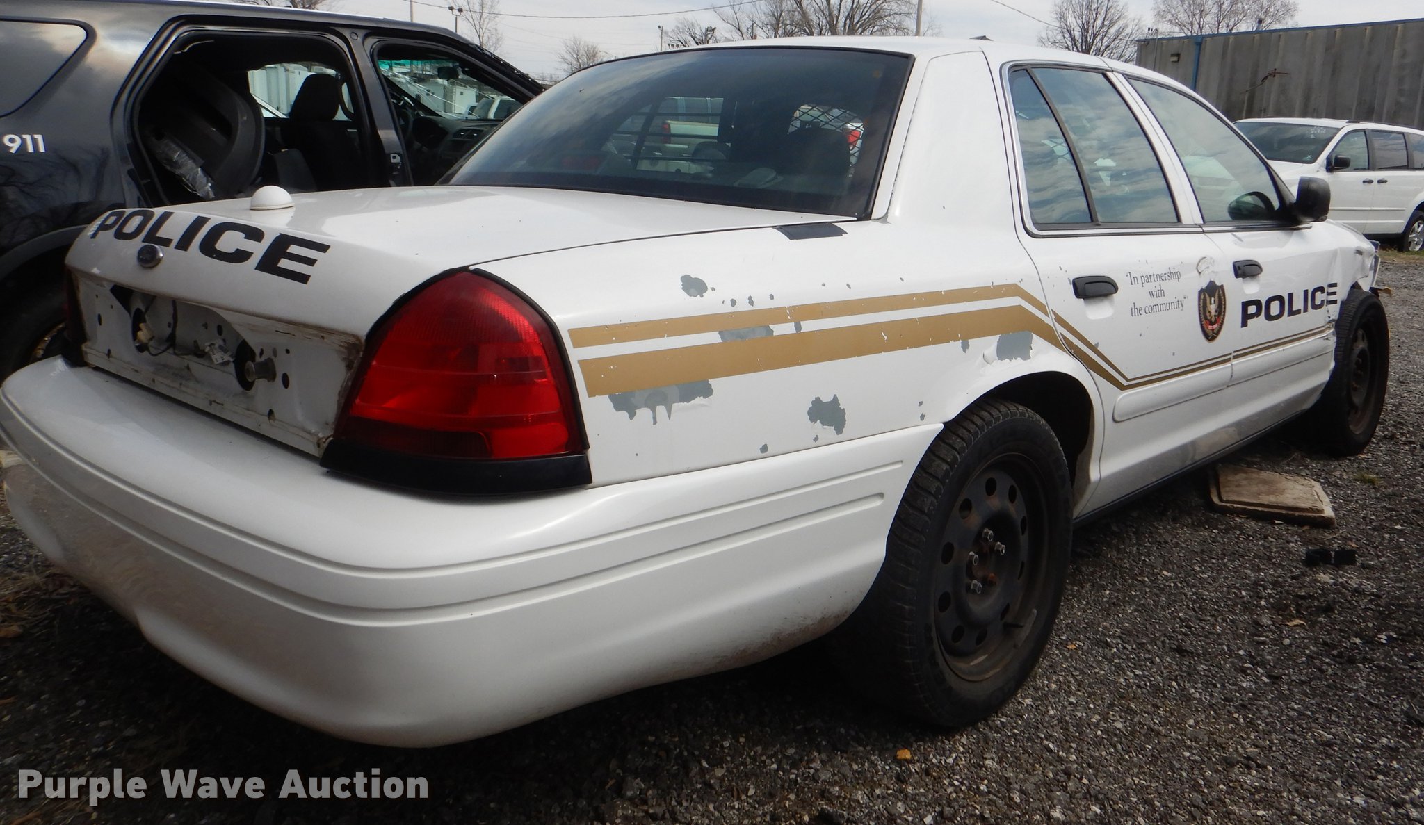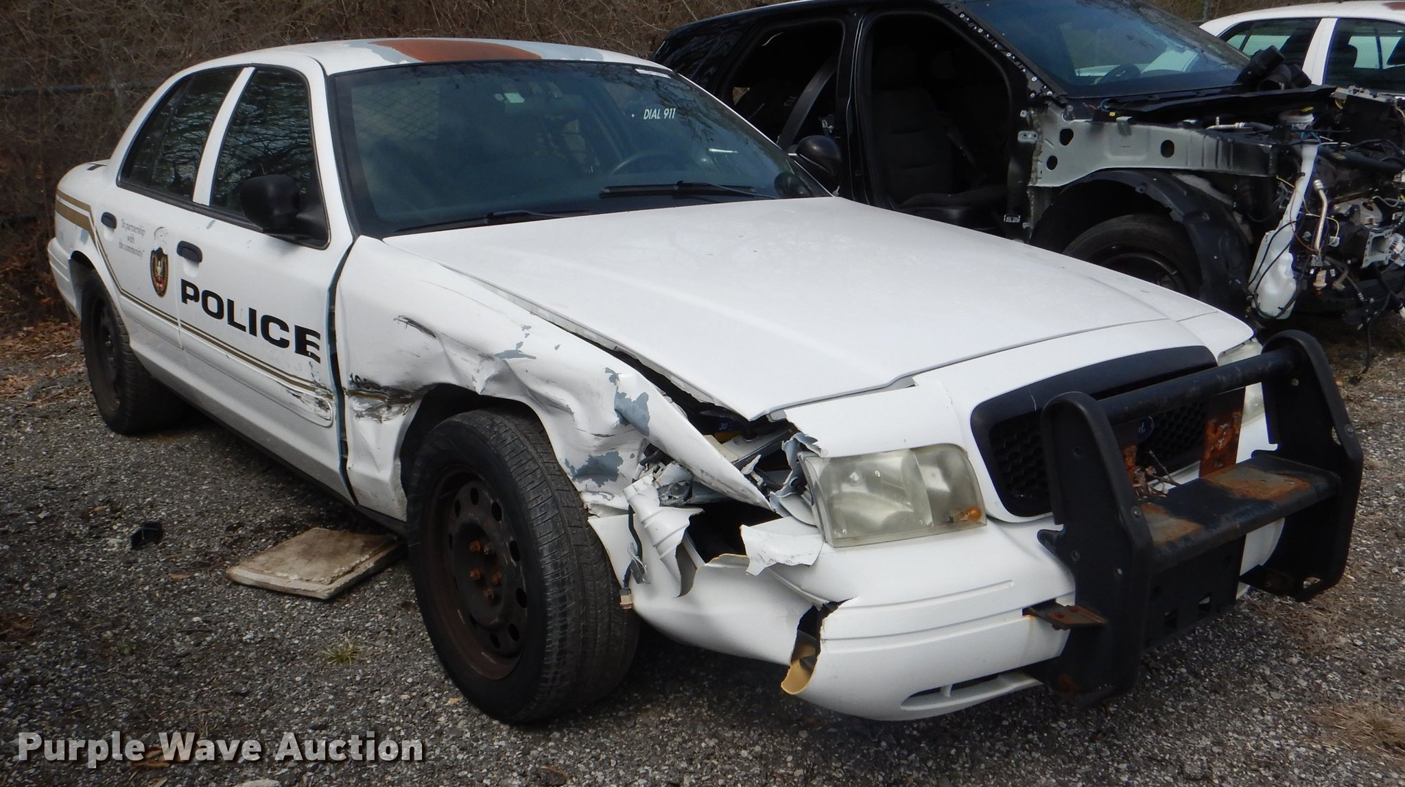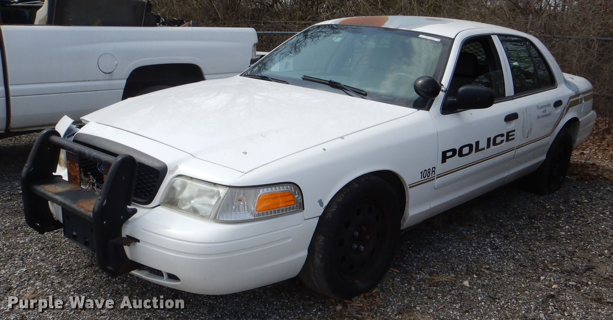 Purple Wave is selling a used Passenger Vehicle in Kansas. This item is a 2008 Ford Crown Victoria Police Interceptor with the following: 81,339 miles on odometer, 4.6L V8 SOHC 16V FFV gas engine, Automatic transmission, AC and heat, Cruise, Power windows, locks, and seat, 235/55R17 tires, Wrecked, Front end damage, Flat tire, Unit# 108