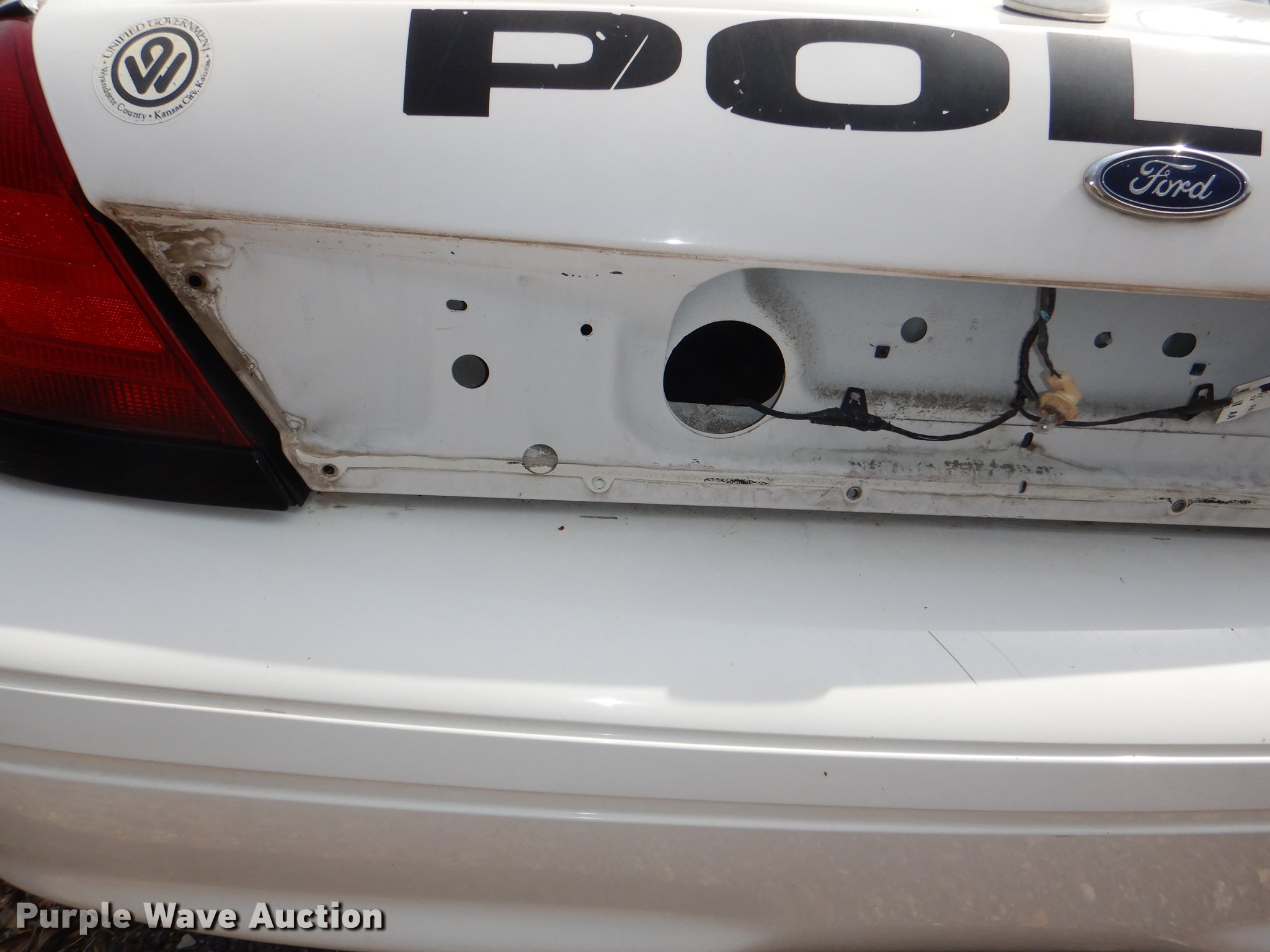 2008 Ford Crown Victoria Police Interceptor. 81,339 miles on odometer, 4.6L V8 SOHC 16V FFV gas engine, Automatic transmission, AC and heat, Cruise, Power windows, locks, and seat, 235/55R17 tires, Wrecked, Front end damage, Flat tire, Unit# 108. Kansas title. 2FAFP71V08X103950. Unified Government of Wyandotte County. 5033 State Ave. Kansas City, KS 66102