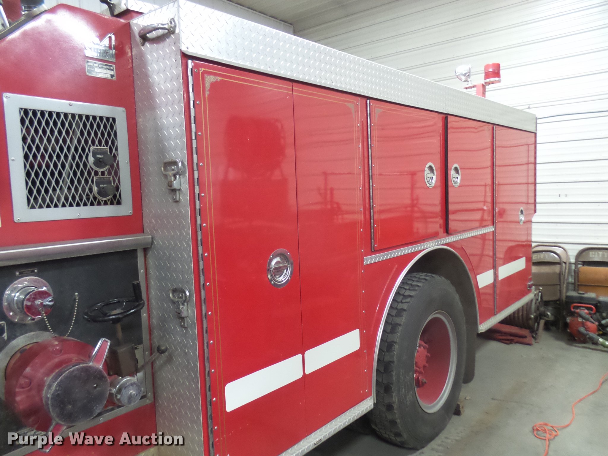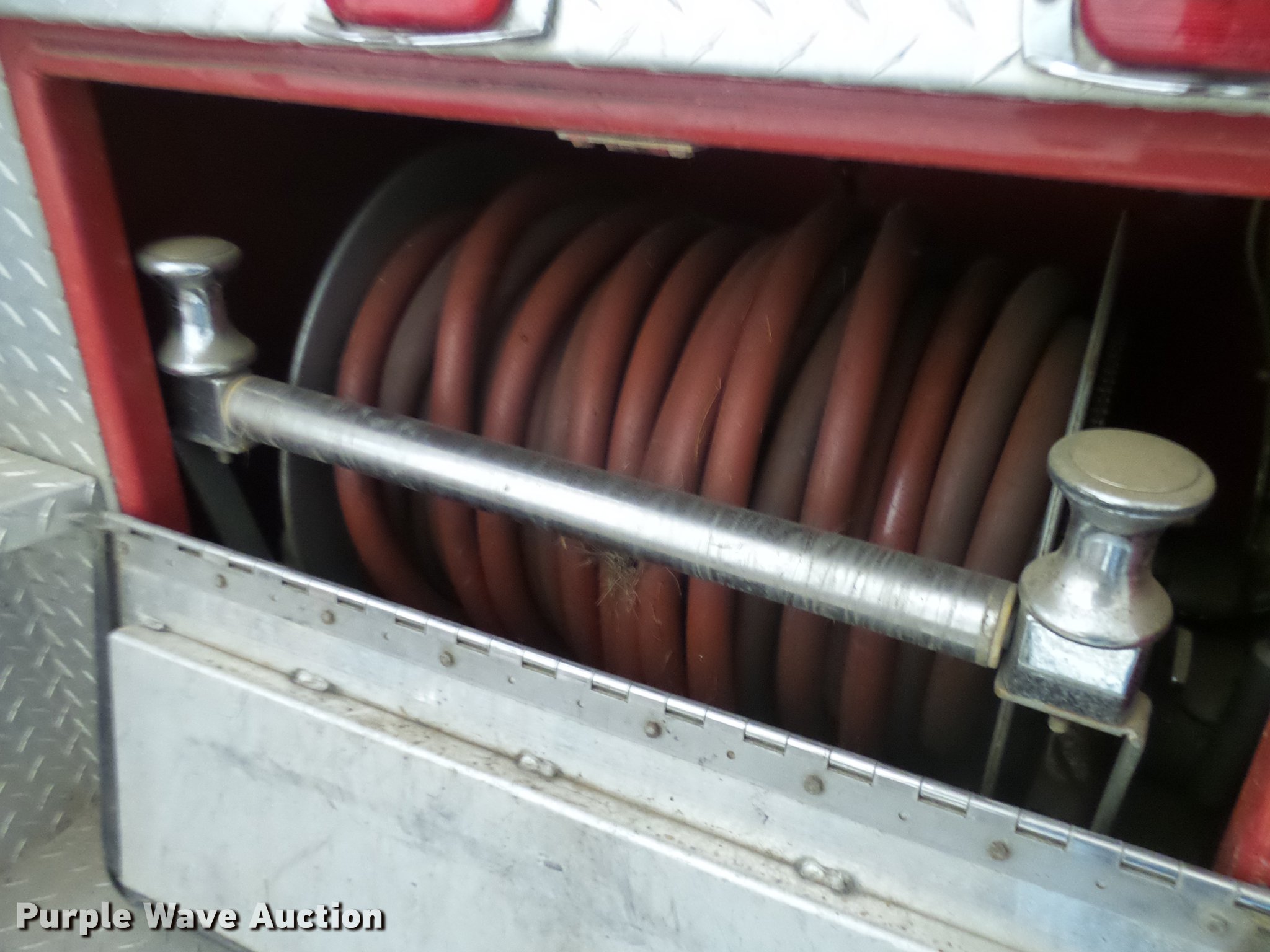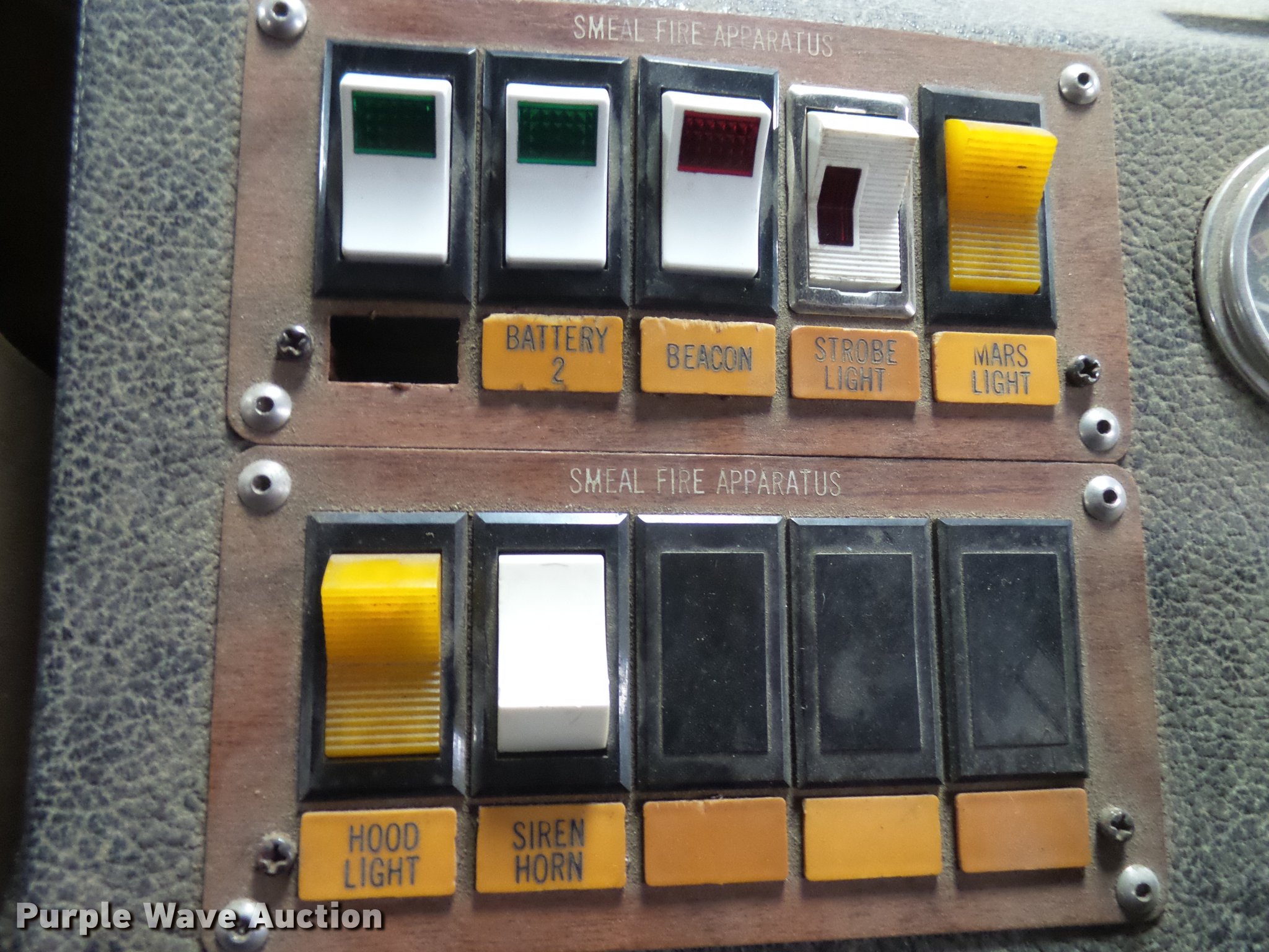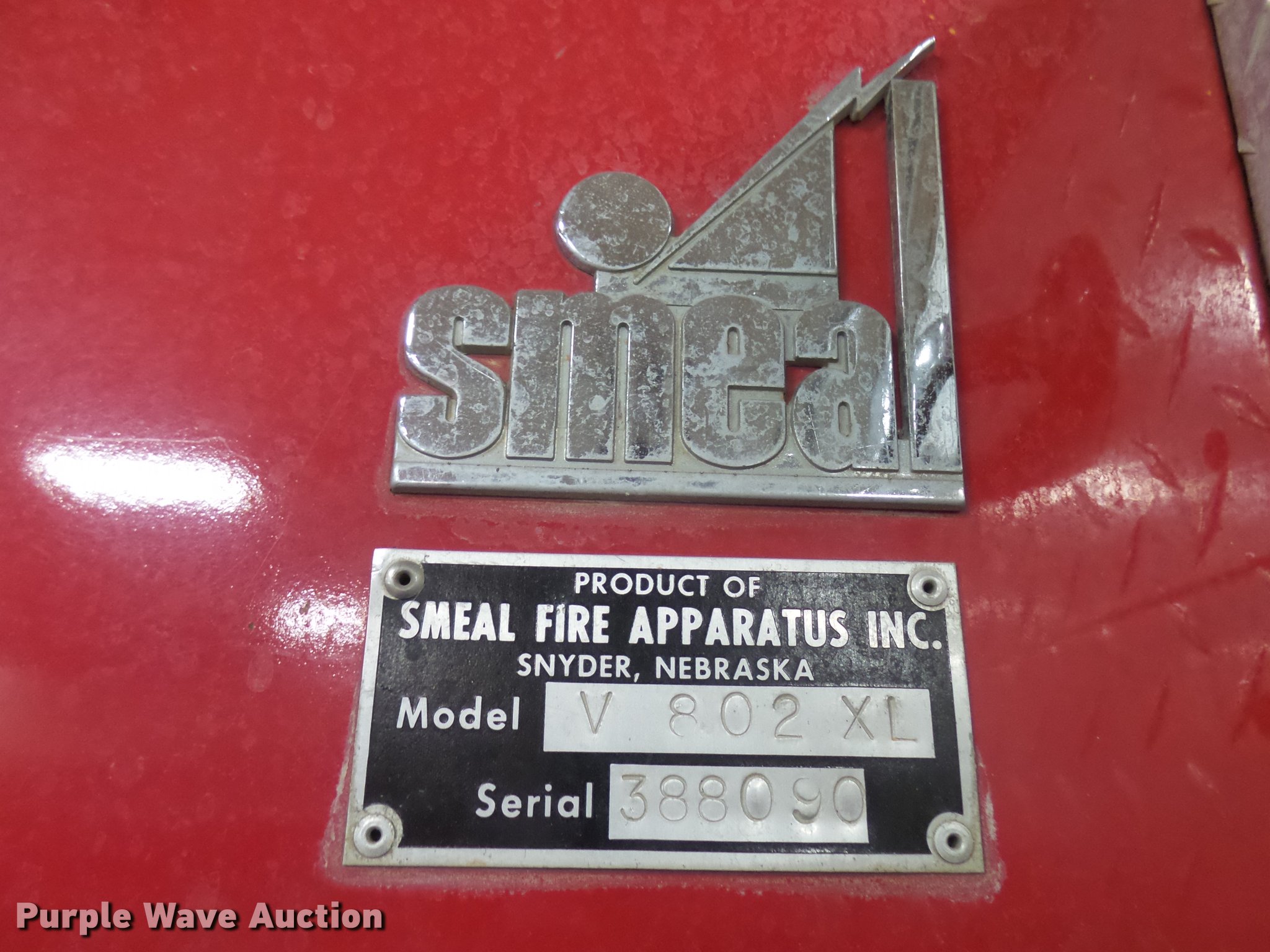 Purple Wave is selling a used Fire Truck or Emergency Vehicle in South Dakota. This item is a 1983 Ford F800 fire truck with the following: 21,267 miles on odometer, 7.0L V8 gas engine, Five speed manual transmission, Two speed rear end, Single axle, Heat, Suspension seat, Air horn, Brake controller, Block heater, Smeal V802XL platform, 467 hours on meter, Serial 388090, Elevated control station, Water gun, Electric cord reel, Outlet box, Work lights, Hose, Ladder, 450' of 2.5" hose, 150' of LDH hose, Roof ladder, Extension ladder, Air brakes, 10.00R22 tires