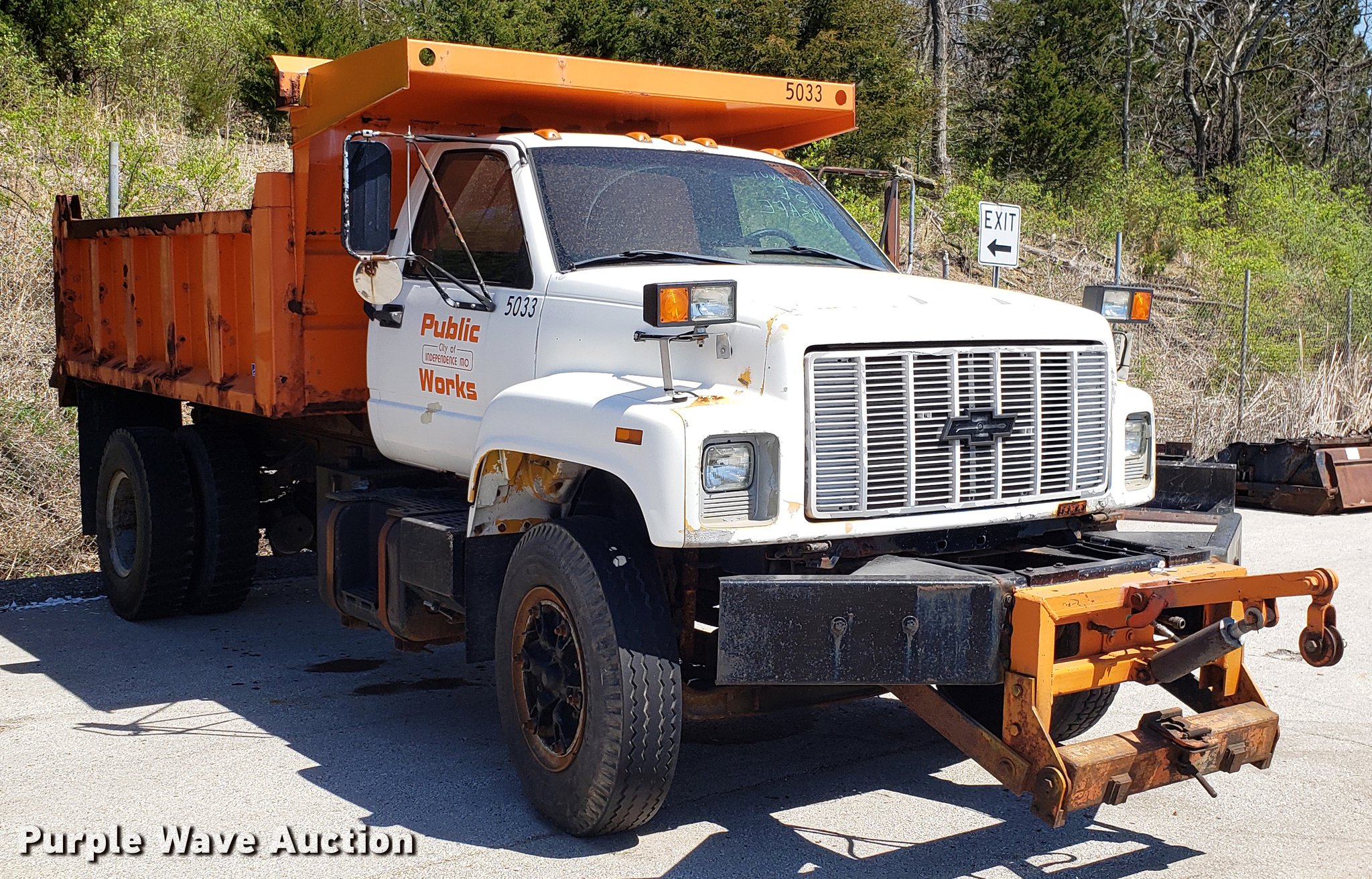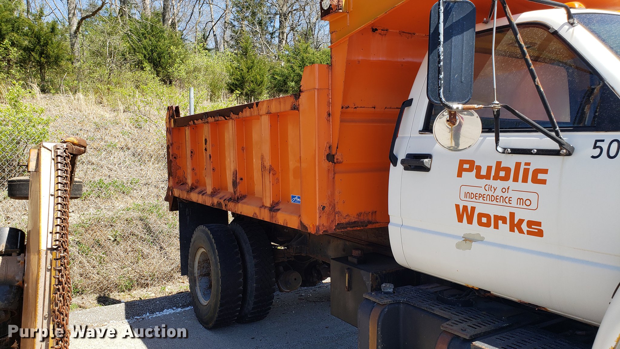 1991 Chevrolet Kodiak C6500 dump truck. 102,646 miles on odometer, Caterpillar 3116 6.6L six cylinder diesel engine, Automatic transmission, Heat, AM/FM, PTO, 11'L x 8'W dump bed 30" side height, Plow bracket, Spring suspension, Air brakes, 10-20 tires, Dead batteries, Brakes need replaced, currently not road worthy, Unit# 8388. Missouri title. 1GBP7H1J0MJ103374. City of Independence. 111 E Maple Ave. Independence, MO 64050