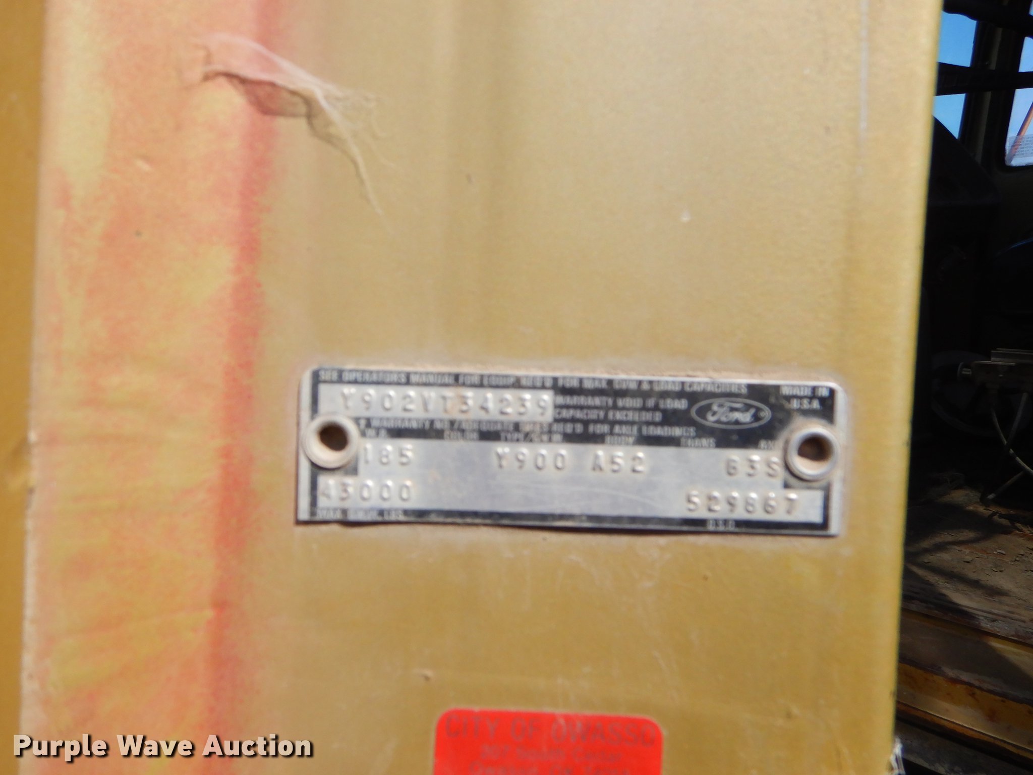 1974 Ford Custom Cab dump truck. 258,755 miles on odometer, Ford six cylinder diesel engine, Spicer 13 speed manual transmission, Tandem axle, Inter-axle differential lock, Heat, Air suspension seat, PTO, 14'L x 96"W steel dump bed 40" side height, Roll tarp, Single ram hoist, Manual end gate, Dual fuel tanks, Spring suspension, Air brakes, 188" wheelbase, 12R22.5 tires, GVWR 51,000 lbs, Unknown operating condition. Oklahoma title. Y902VT34239. City of Owasso. 499 S Main St. Owasso, OK 74055