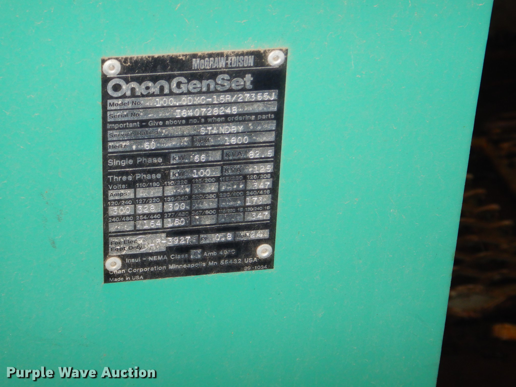 Purple Wave is selling a used Generator Set in Oklahoma. This item is a Generac 100ODYC15R27355J generator with the following: 433 hours on meter, Six cylinder diesel engine, Single phase, 66 kW, 82.5 kVA, Three phase, 100 kW, 125 kVA, Onan 100 generator, 16.5' x 8' x 8', Unknown operating condition, Serial 1840728248