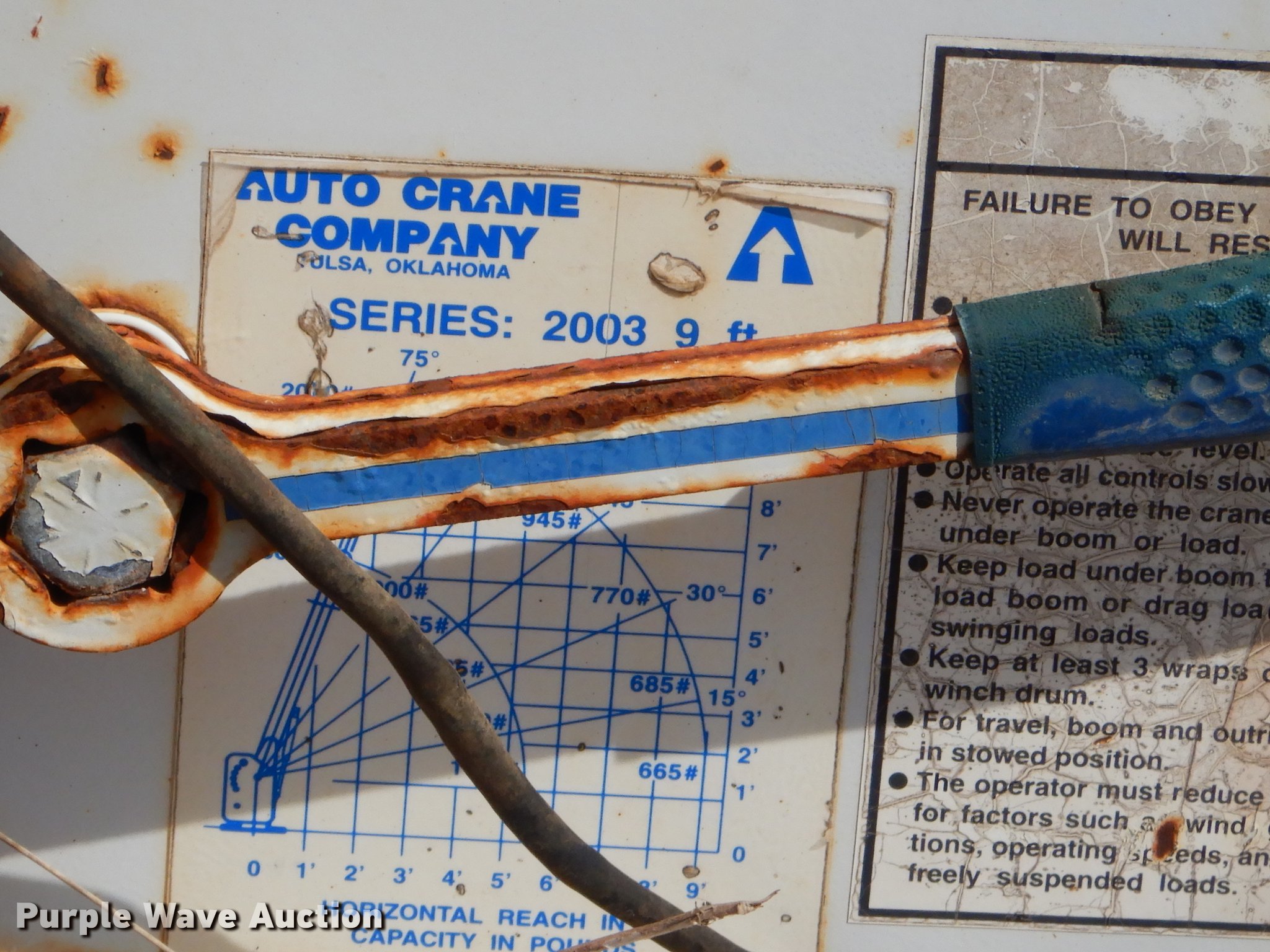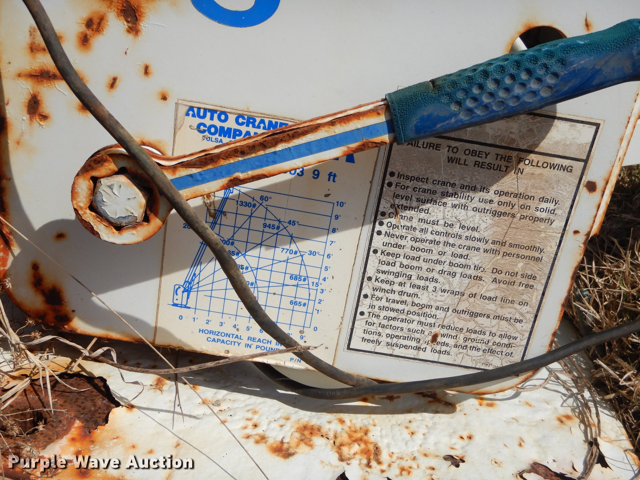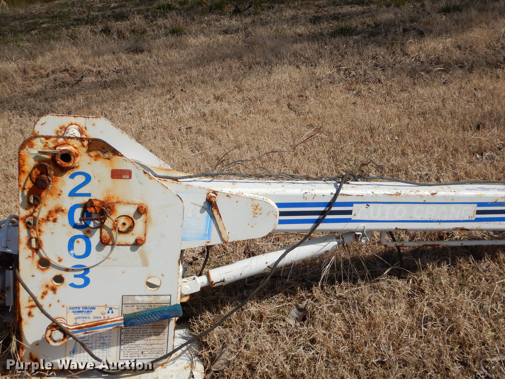 Purple Wave is selling a used Truck Part and Attach. in Oklahoma. This item is a Autocrane with the following: 9' boom length, 2,000 lbs maximum lift capacity, Unknown operating condition