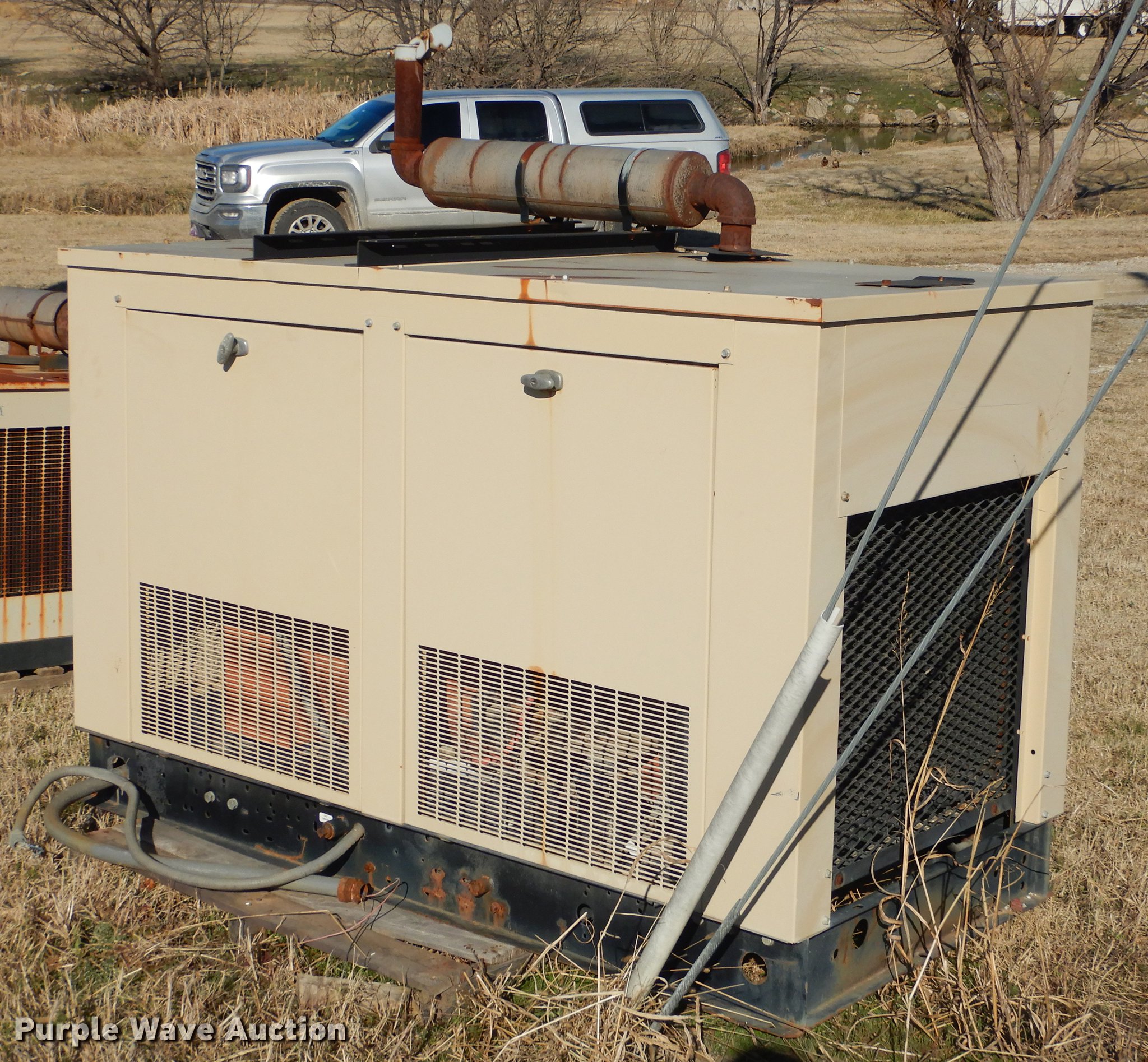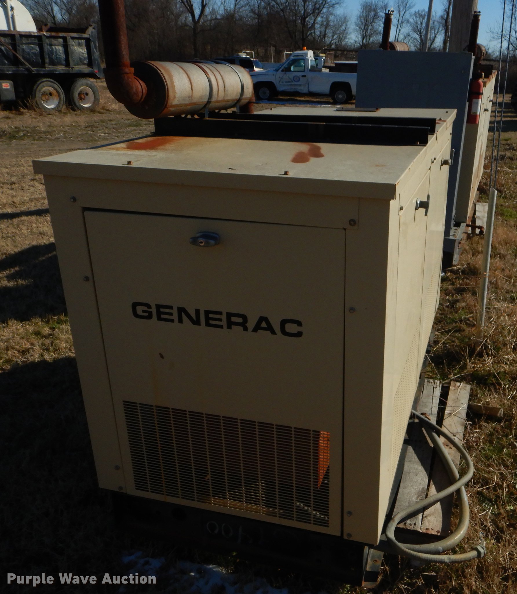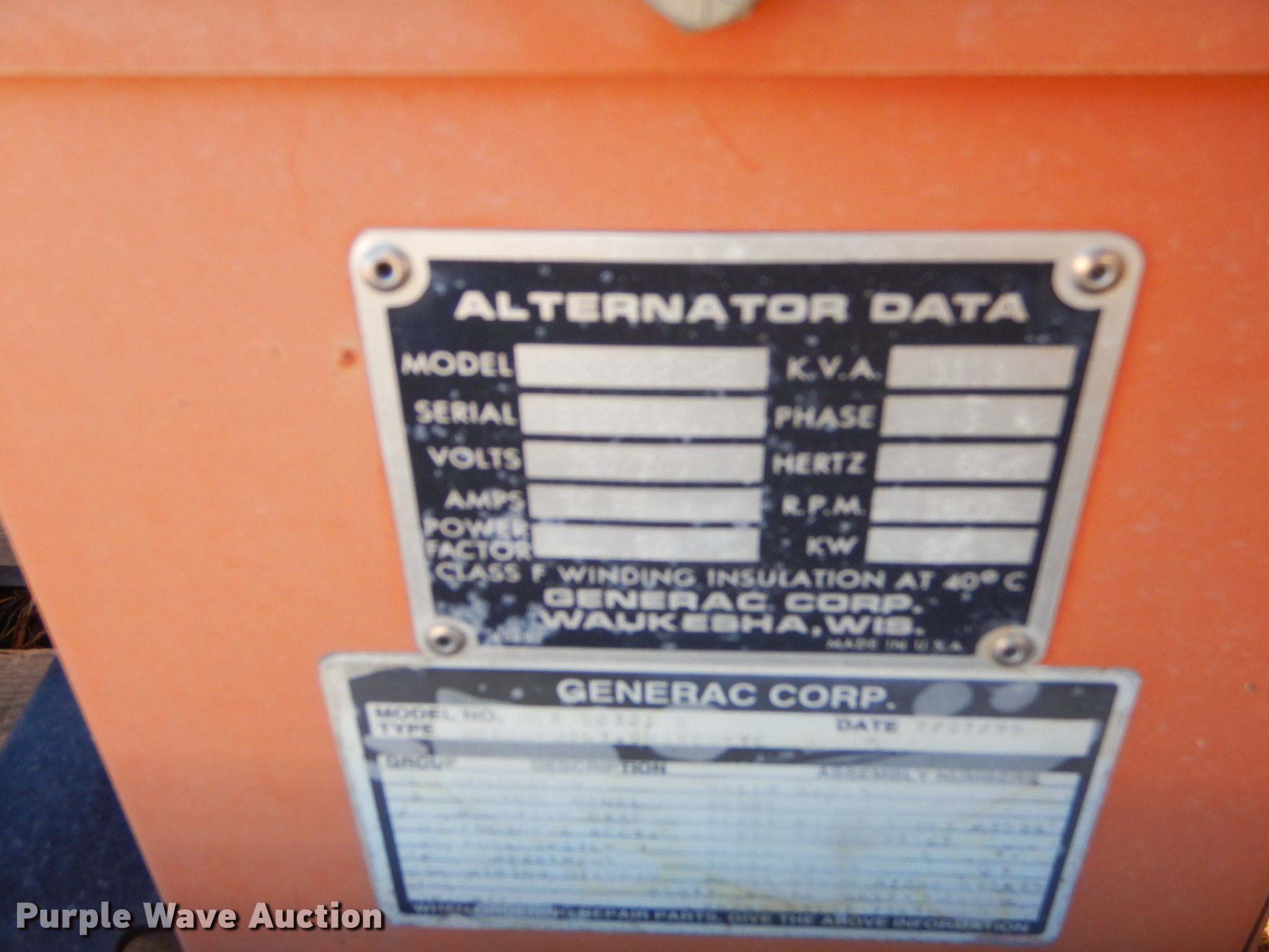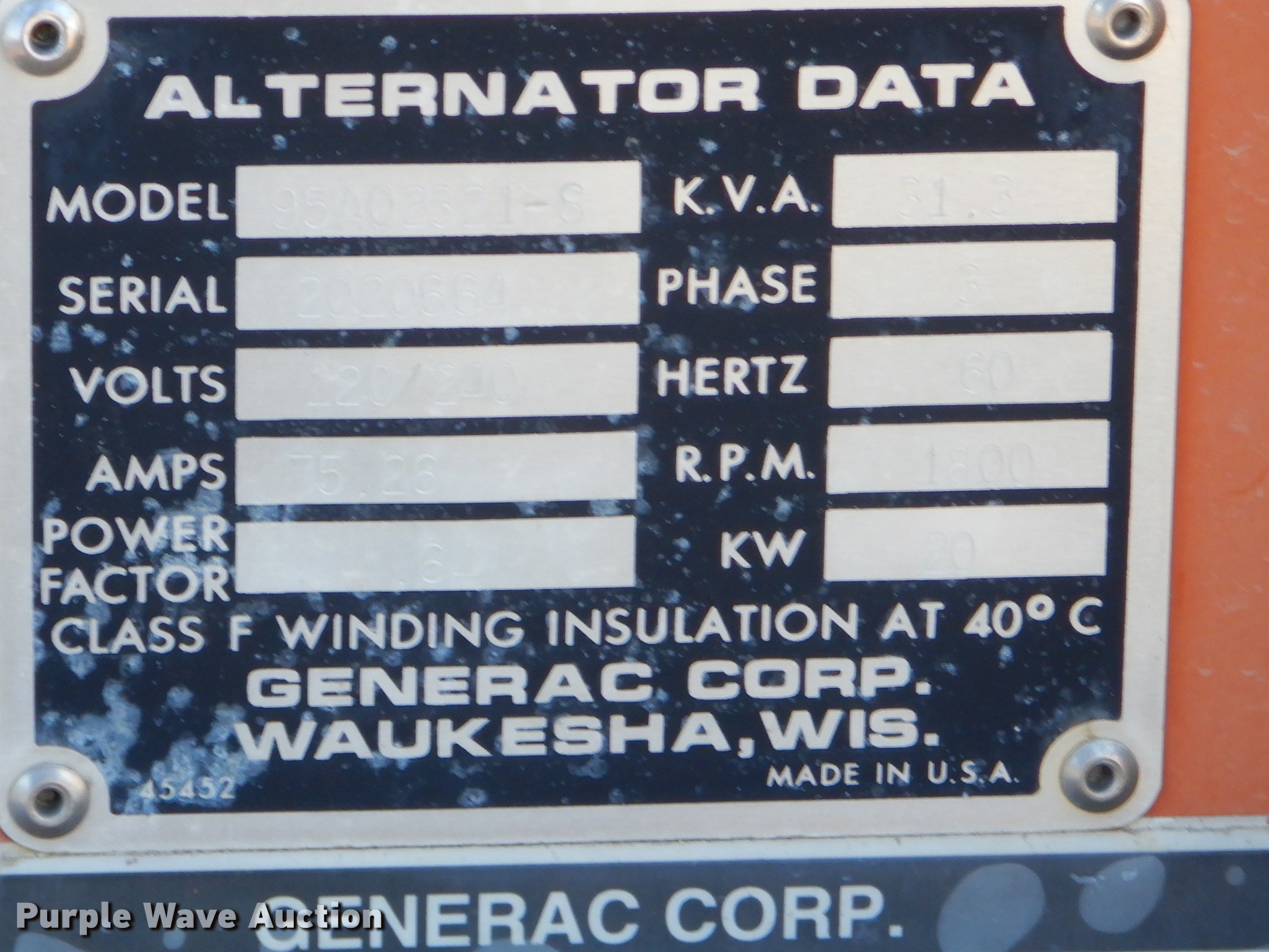 Purple Wave is selling a used Generator Set in Oklahoma. This item is a Generac 95A02321-S generator with the following: Four cylinder gas engine, 31.3 kVA, 20 kW, 120/240V, Three phase, 73" x 36" x 46", Unknown operating condition, Serial 2020664