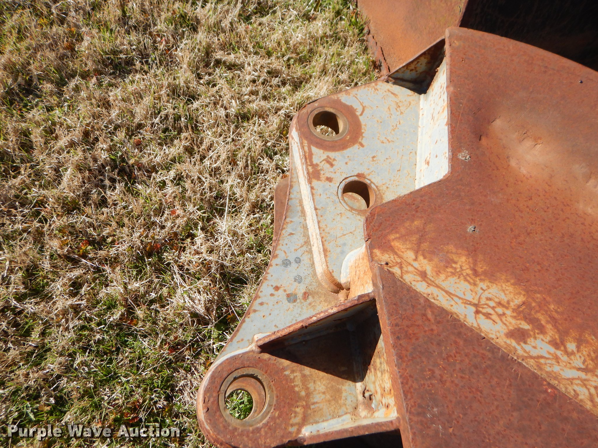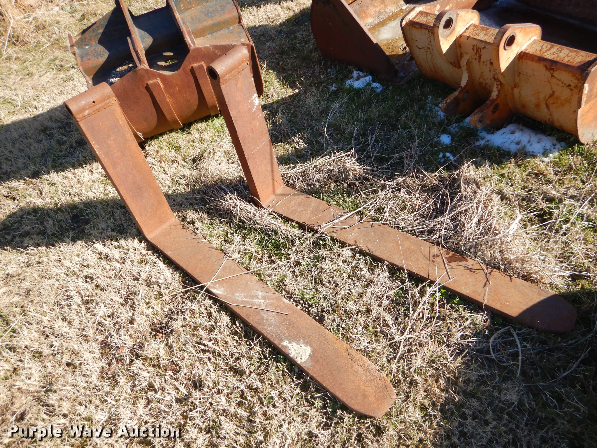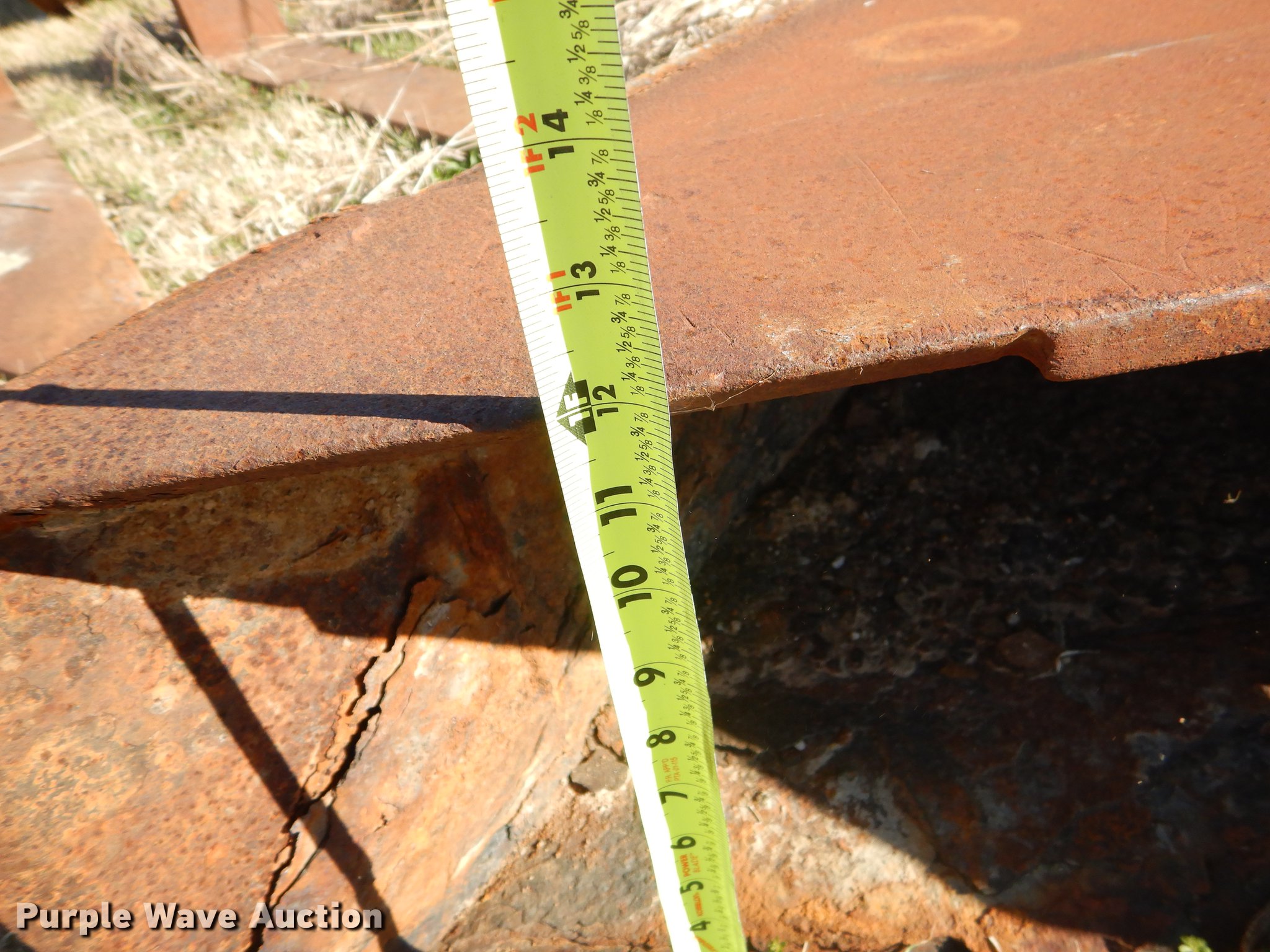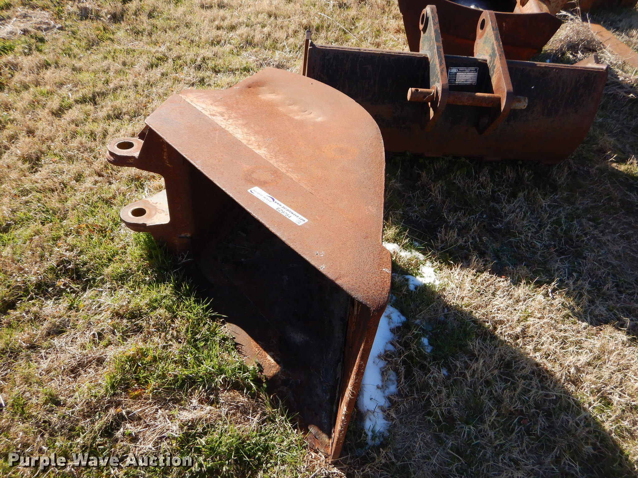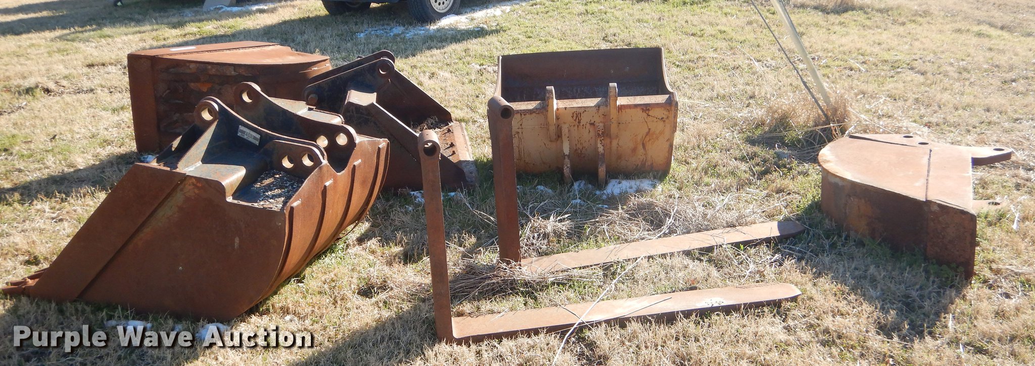 Purple Wave is selling a used Excavator Attach. in Oklahoma. This item is a (5) excavator buckets with the following: 22"W, Gannon bucket, Bolt-on cutting edge, D22145 pivot and curl bushing, Enlow Force shank, Serial SF04B72M480991747, 35"W bucket, (6) bolt-on teeth, 35"W bucket, 12"W bucket, 48"L pallet forks