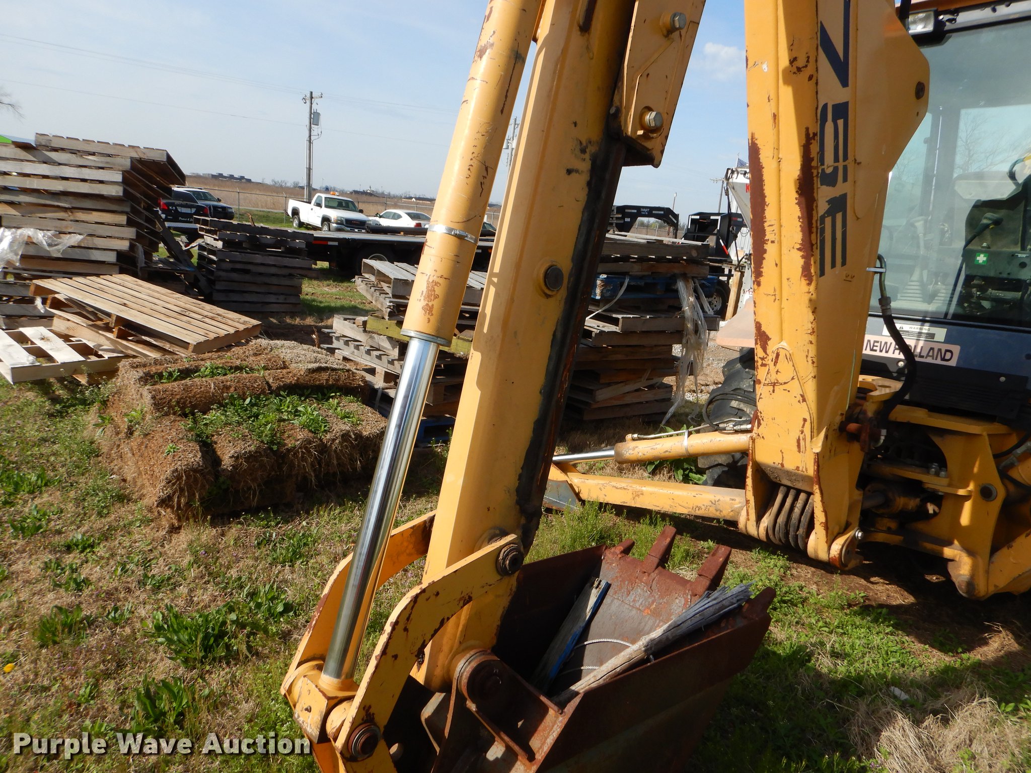 Purple Wave is selling a used Tractor Loader Backhoe in Oklahoma. This item is a 1996 New Holland 575E backhoe with the following: 3,385 hours on meter, New Holland four cylinder diesel engine, Powershift transmission, 4F-4R gears, Four wheel drive, Enclosed cab, AC and heat, Wobble stick backhoe controls, 72"W loader bucket, Bolt-on cutting edge, Extendable stick, 23"W backhoe bucket, (2) teeth, 12-16.5 front tires, 19.5L-24 rear tires, Possible fuel pump issues, Unknown operating condition, Serial 03101978