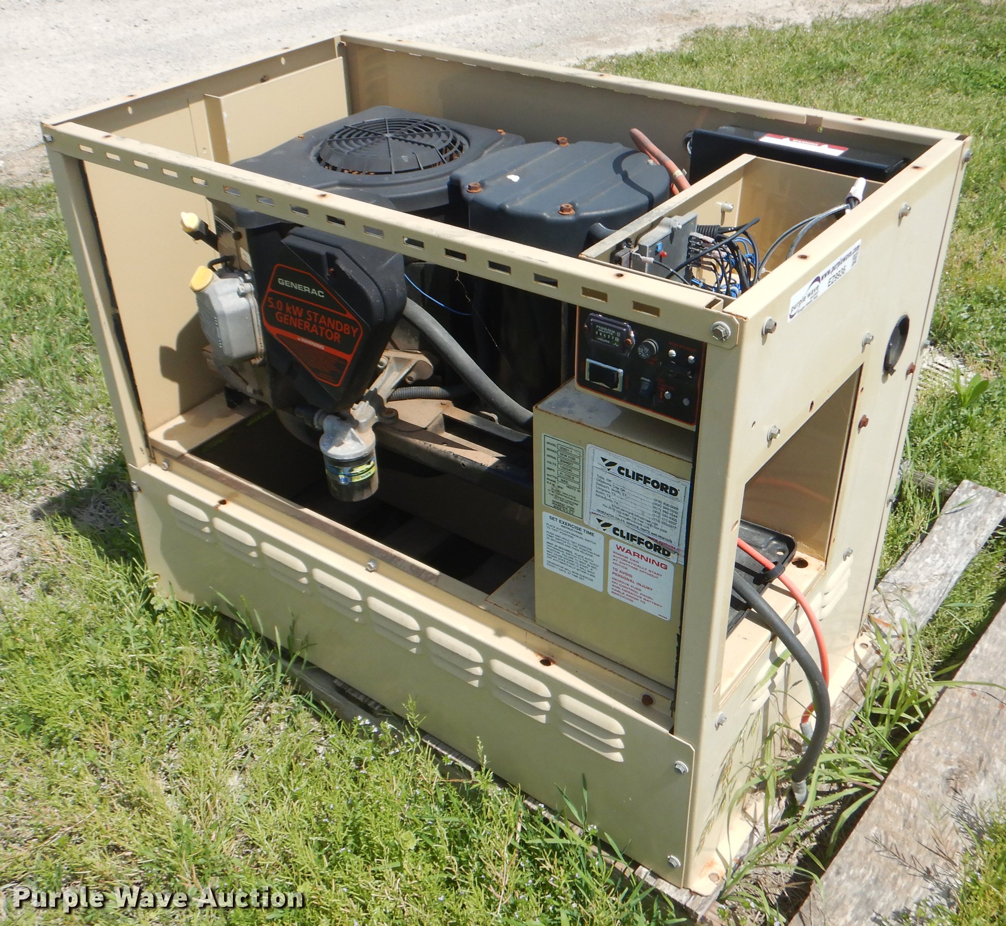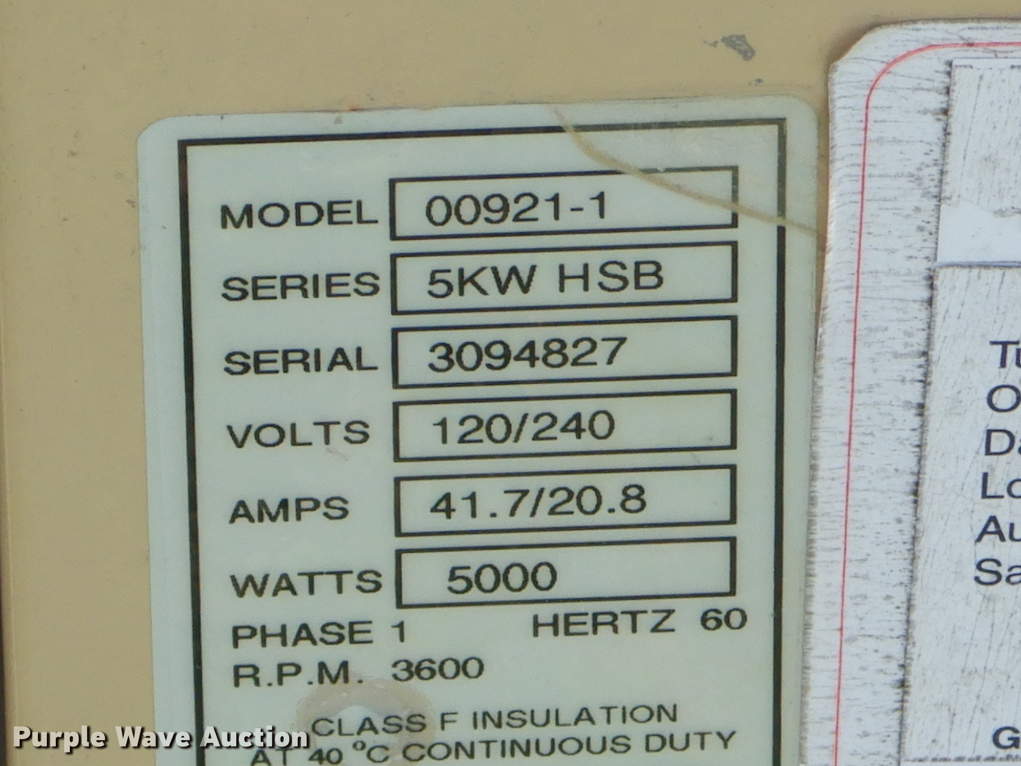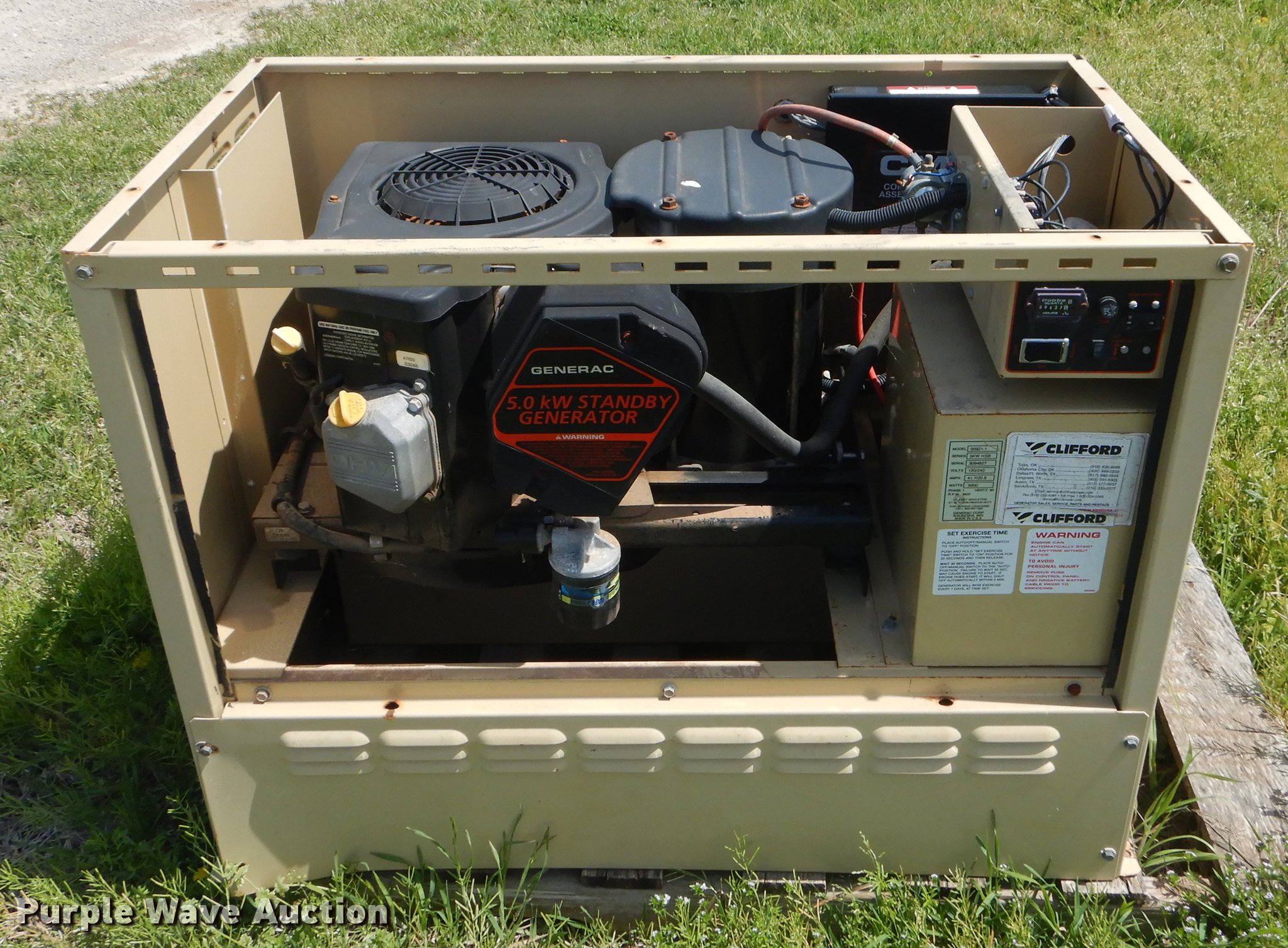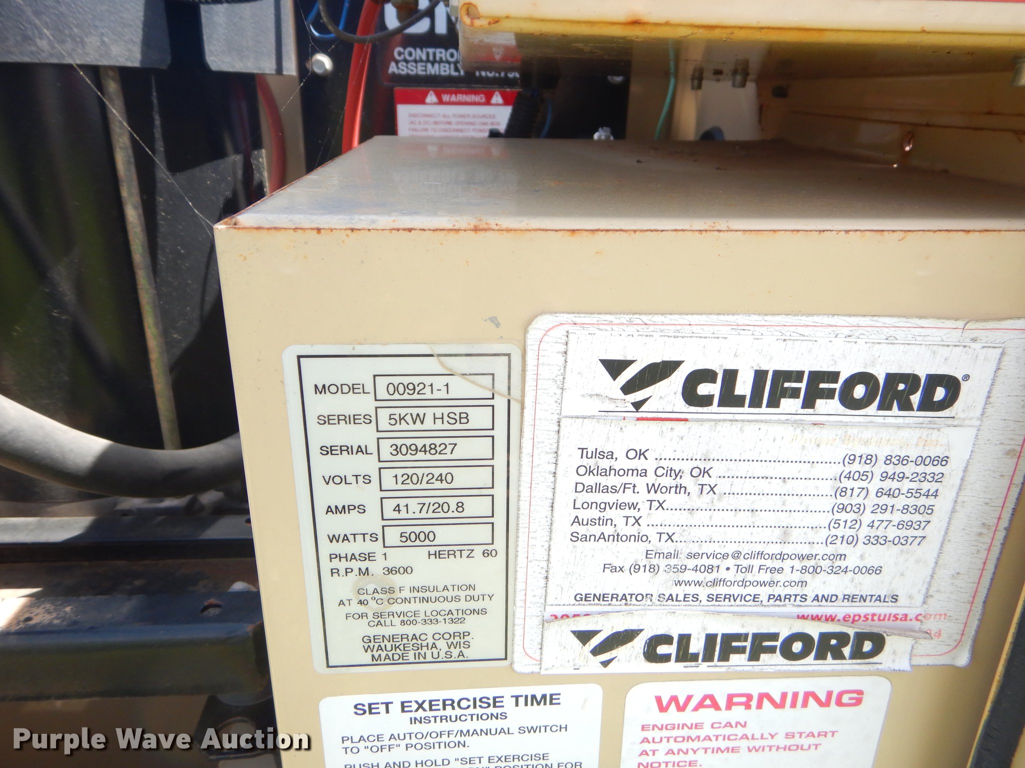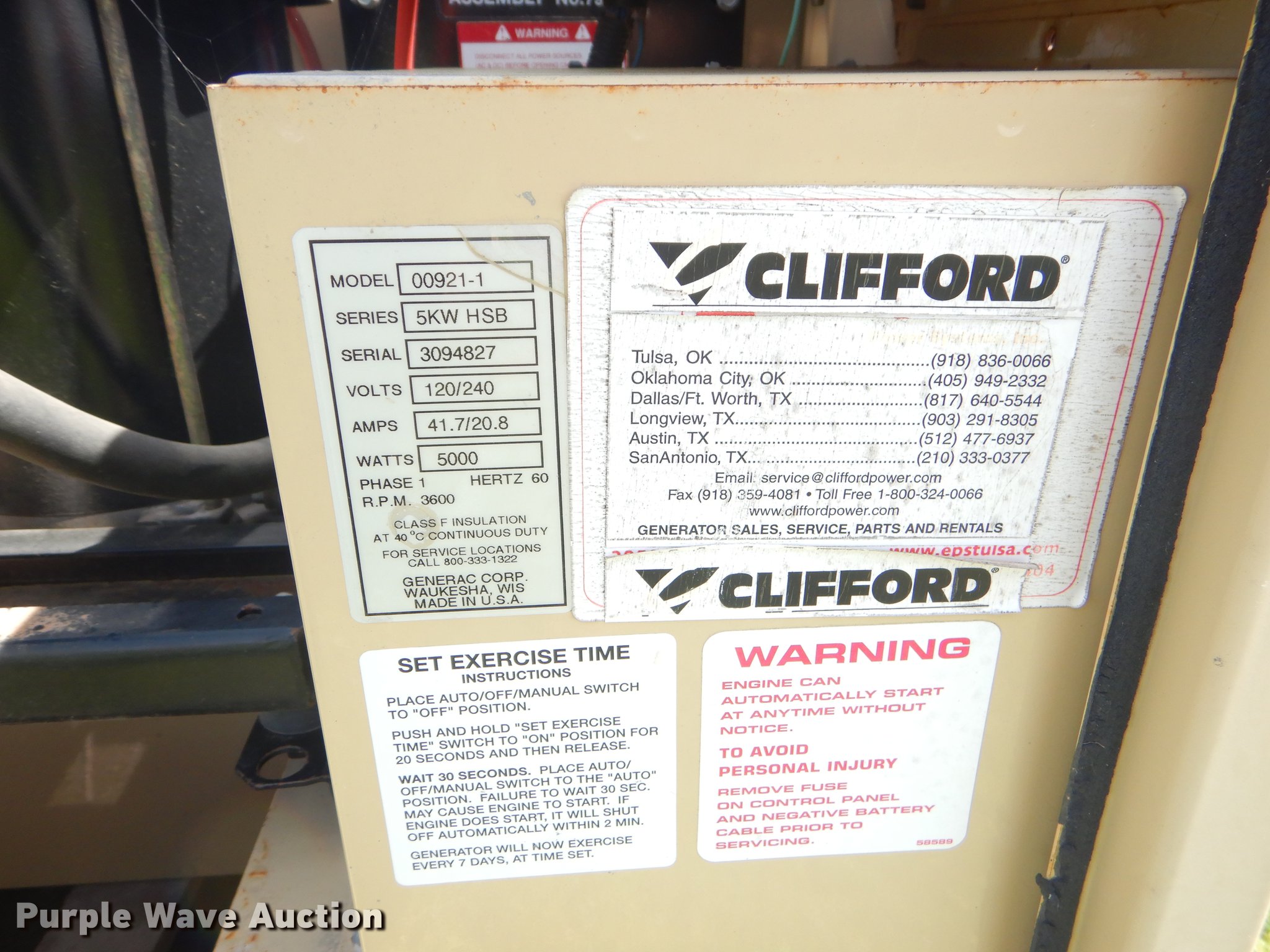 Purple Wave is selling a used Generator Set in Oklahoma. This item is a Generac 00921-1 generator with the following: 537 hours on meter, One cylinder natural gas engine, 5,000 watts, 120/240V, 41.7/20.8 amps, Single phase, Electric start, Non-operational unit, Serial 3094827