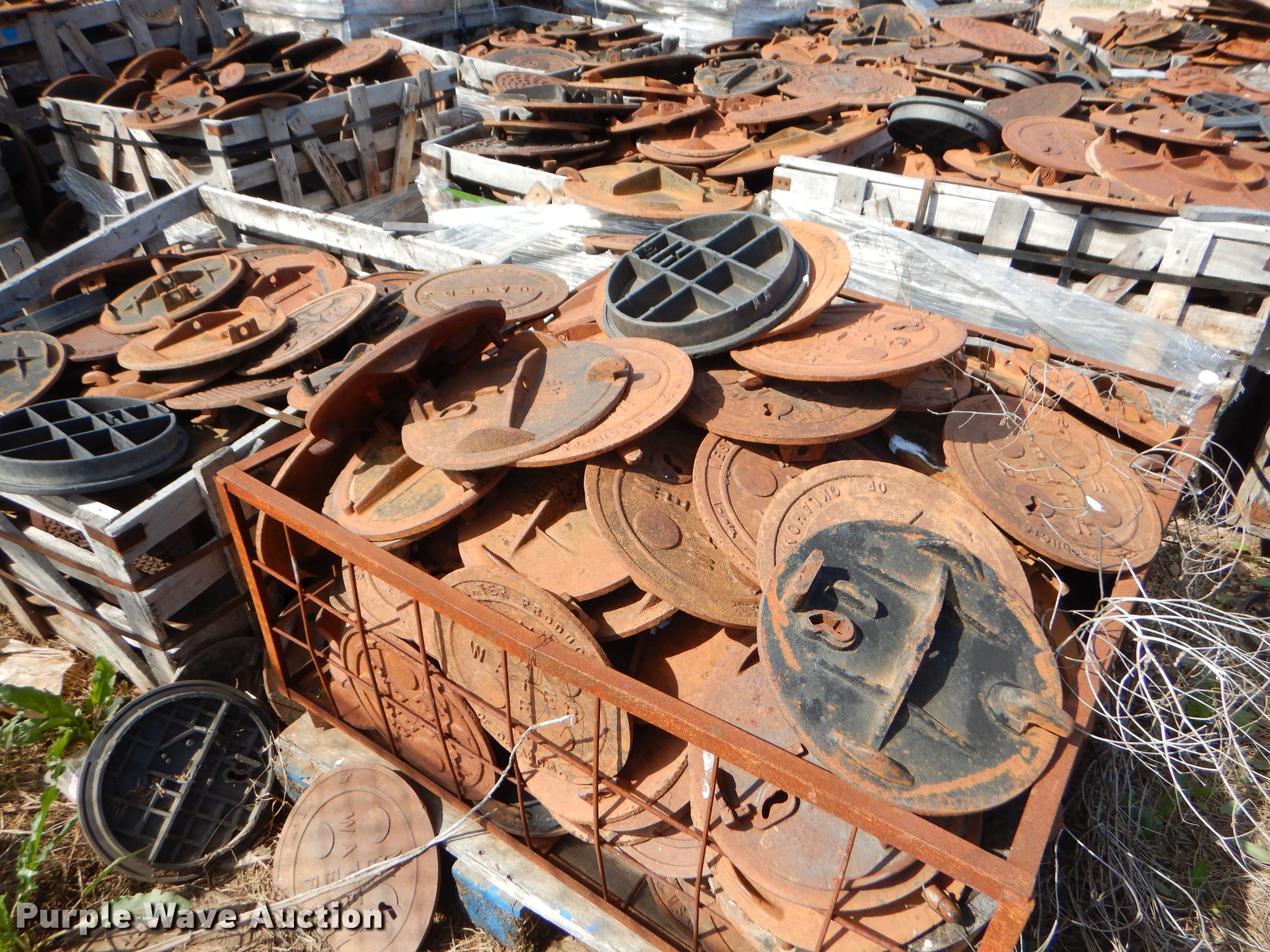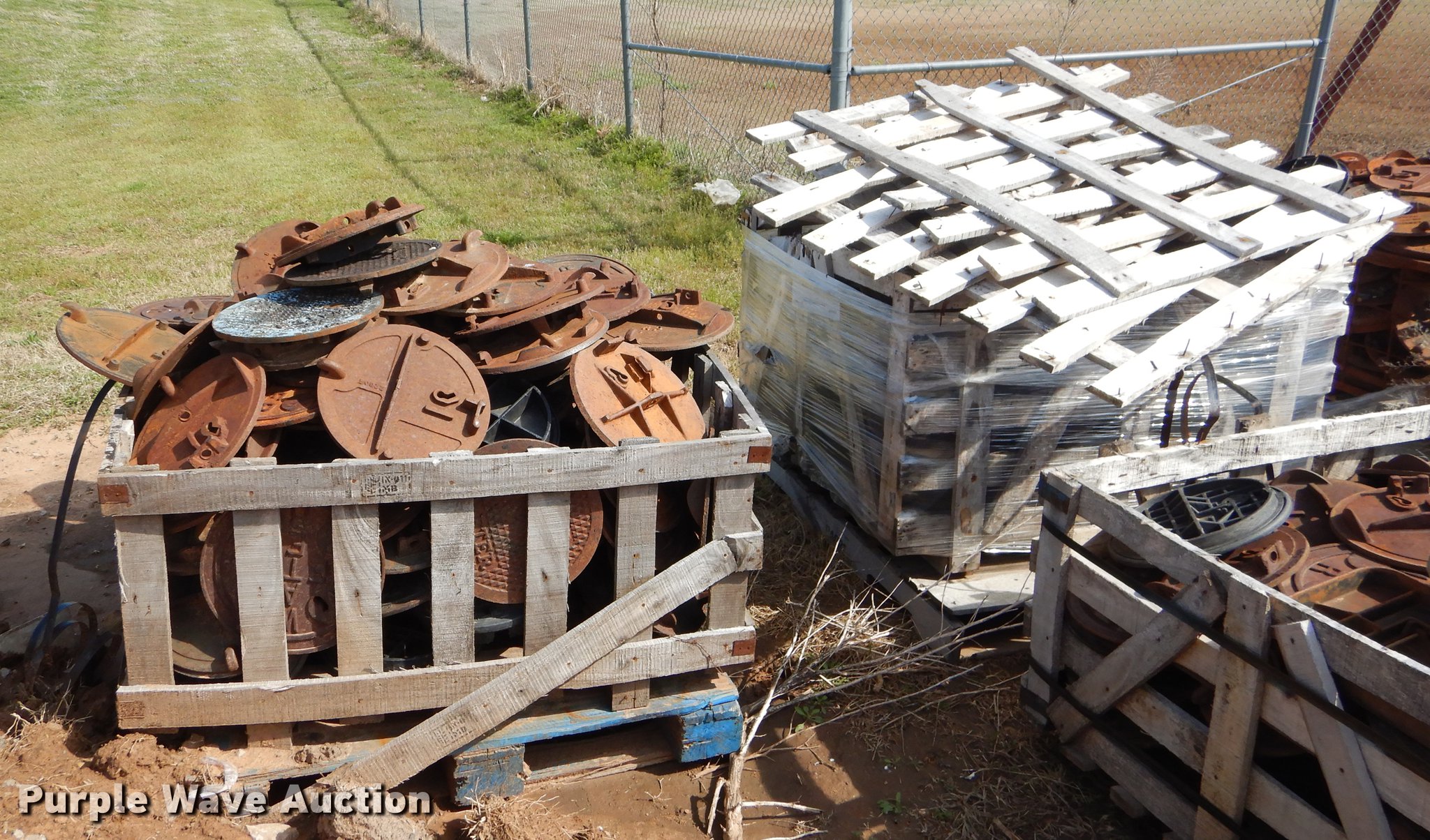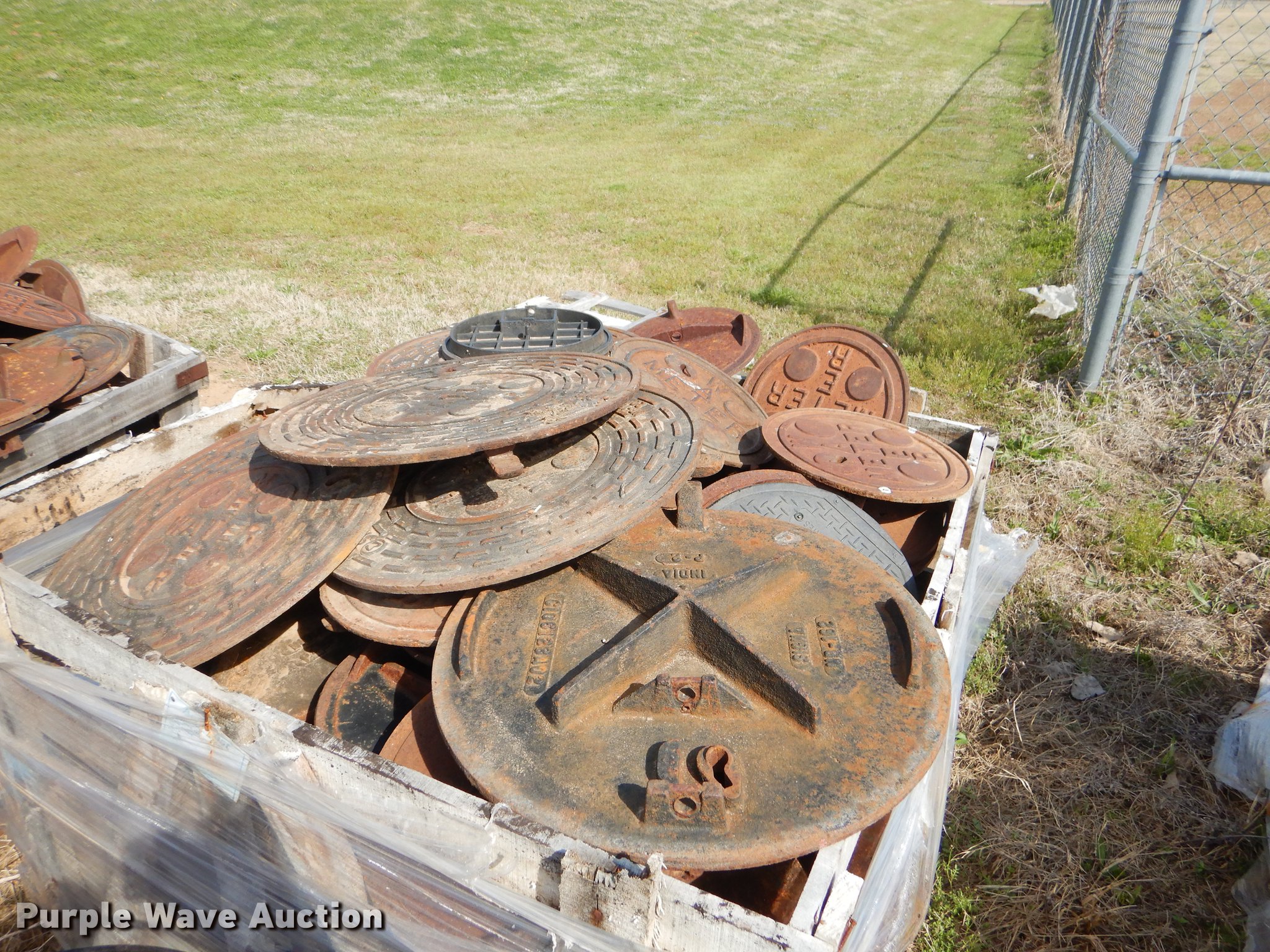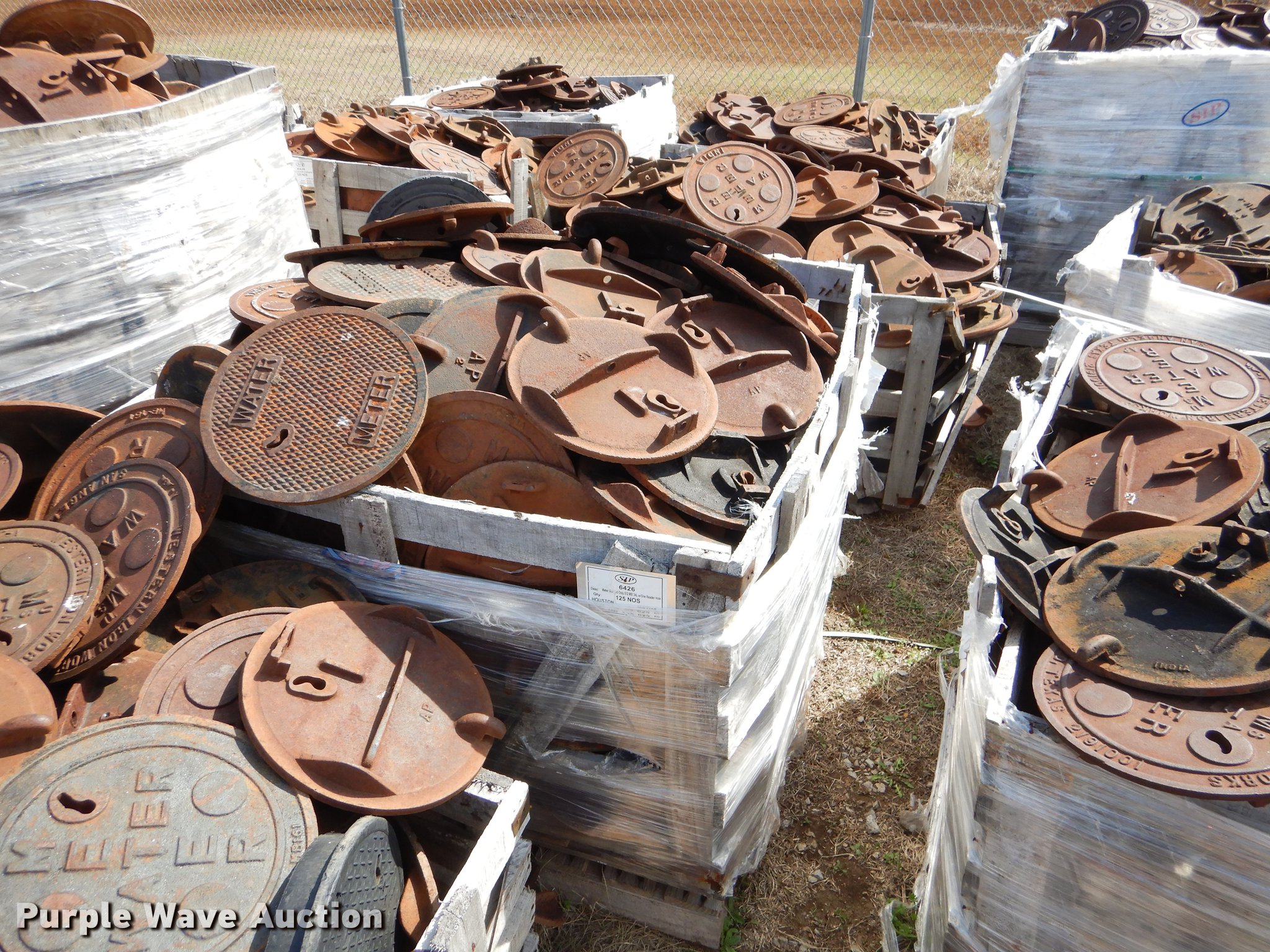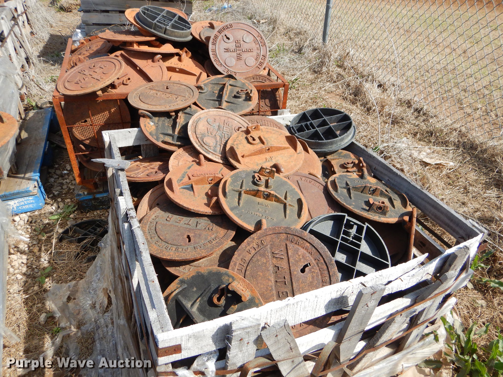 Purple Wave is selling a used Tools in Oklahoma. This item is a Water meter lids with the following: 12" to 21", Approx. 48 40" x 40" x 24" containers