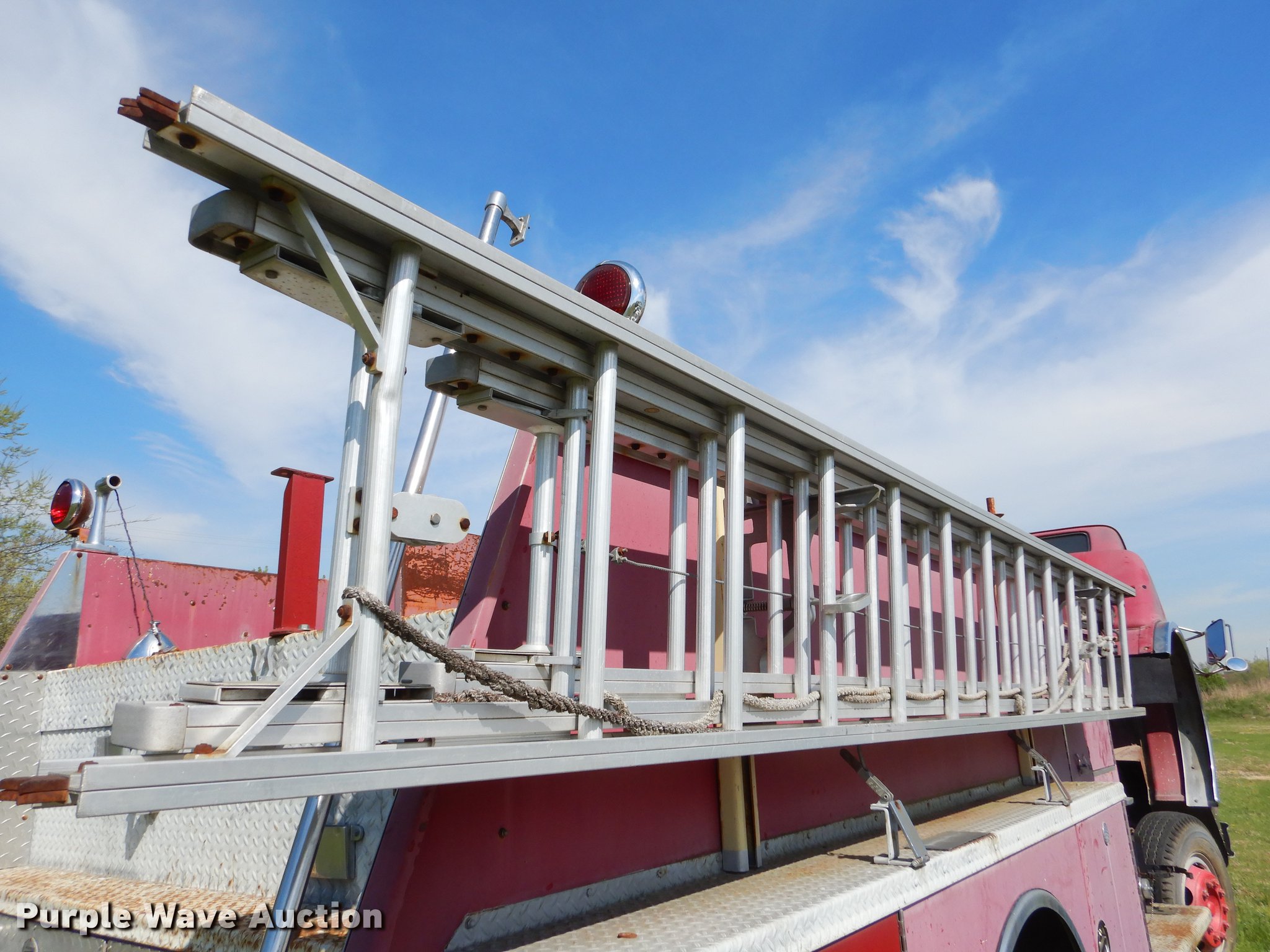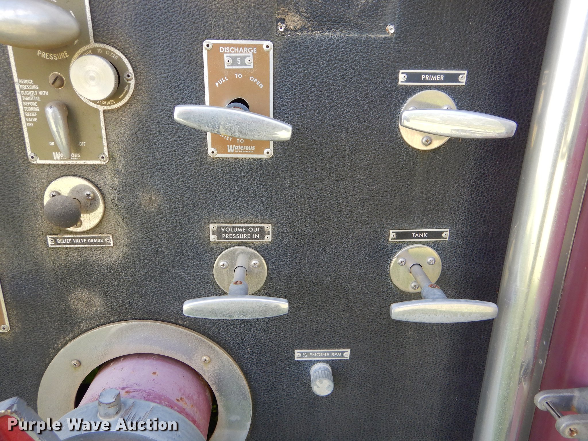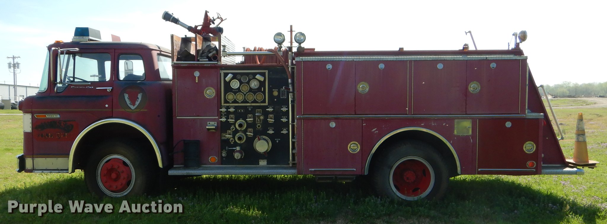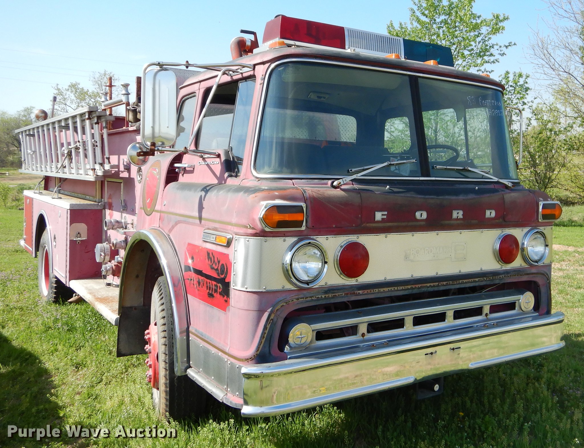 Purple Wave is selling a used Fire Truck or Emergency Vehicle in Oklahoma. This item is a 1983 Ford 800 fire truck with the following: 36,534 miles on odometer, 7.0L V8 gas engine, Five speed manual transmission, Single axle, Heat, Suspension seat, Emergency lights and sirens, Whelen PA/siren controls, PTO, Pump, Waterous WB fire apparatus, Water gun, Hose, Three section extension ladder, 9.00-20 tires, Decals have been removed, Unknown operating condition