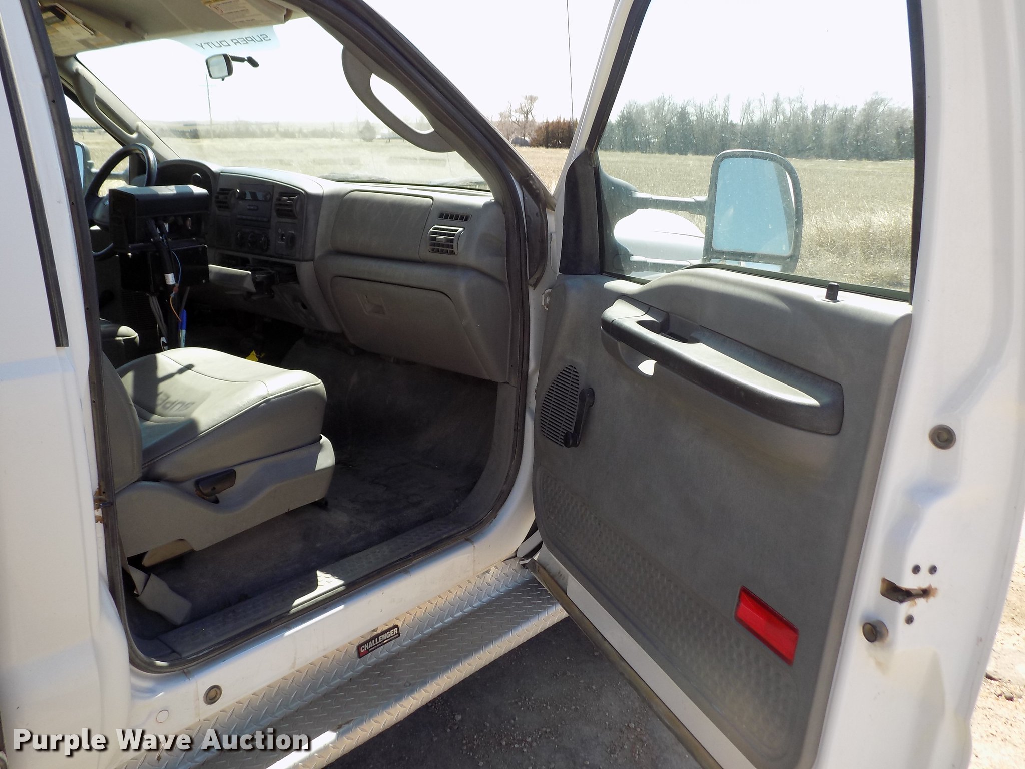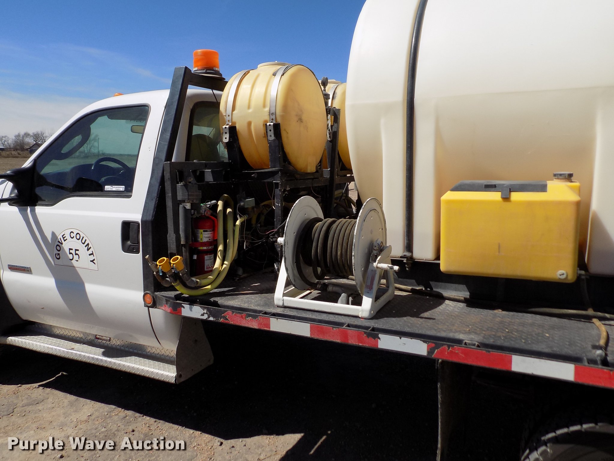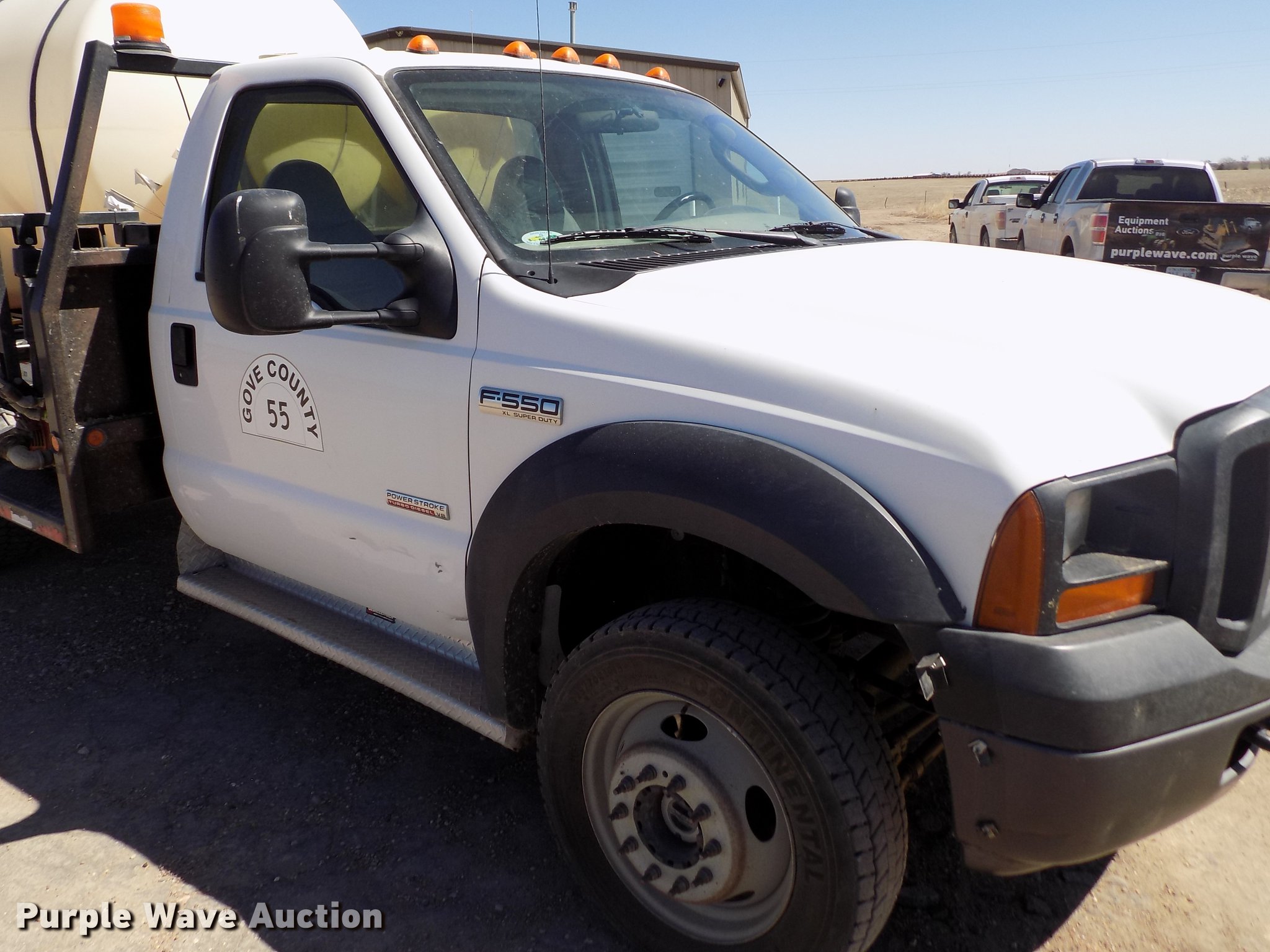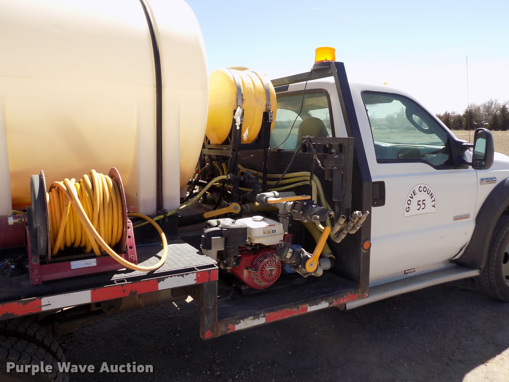 Purple Wave is selling a used Flat Bed Truck in Kansas. This item is a 2006 Ford F550 Super Duty XL flatbed truck with the following: 84,230 miles on odometer, 6.0L V8 OHV 32V turbo diesel engine, Automatic transmission, Four wheel drive, Single axle, AC and heat, AM/FM, Auxiliary controls, Front tow hooks, 12.5'L x 8'2"W flatbed, Steel floor, Stake pockets, Sprayer, Raven SCS450NVM controller, 1,000 gallon solution tank, (2) 20 gallon auxiliary tanks, Honda GX240 8.0 gas engine, In-cab controls, Adjustable dual side spray, Manual hose reel, Electric hose reel, (2) hand spray guns, Emergency wash station, Single fuel tank, Receiver hitch, Trailer wiring, Spring suspension, Hydraulic brakes, 225/70R19.5 tires, ABS light on