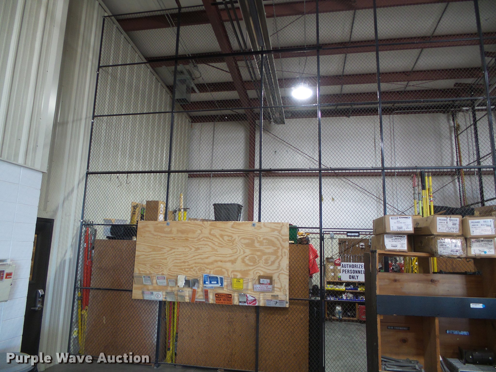 Purple Wave is selling a used Shelving and Storage in Kansas. This item is a Equipment storage rack with the following: Two sided steel cage, Lockable door