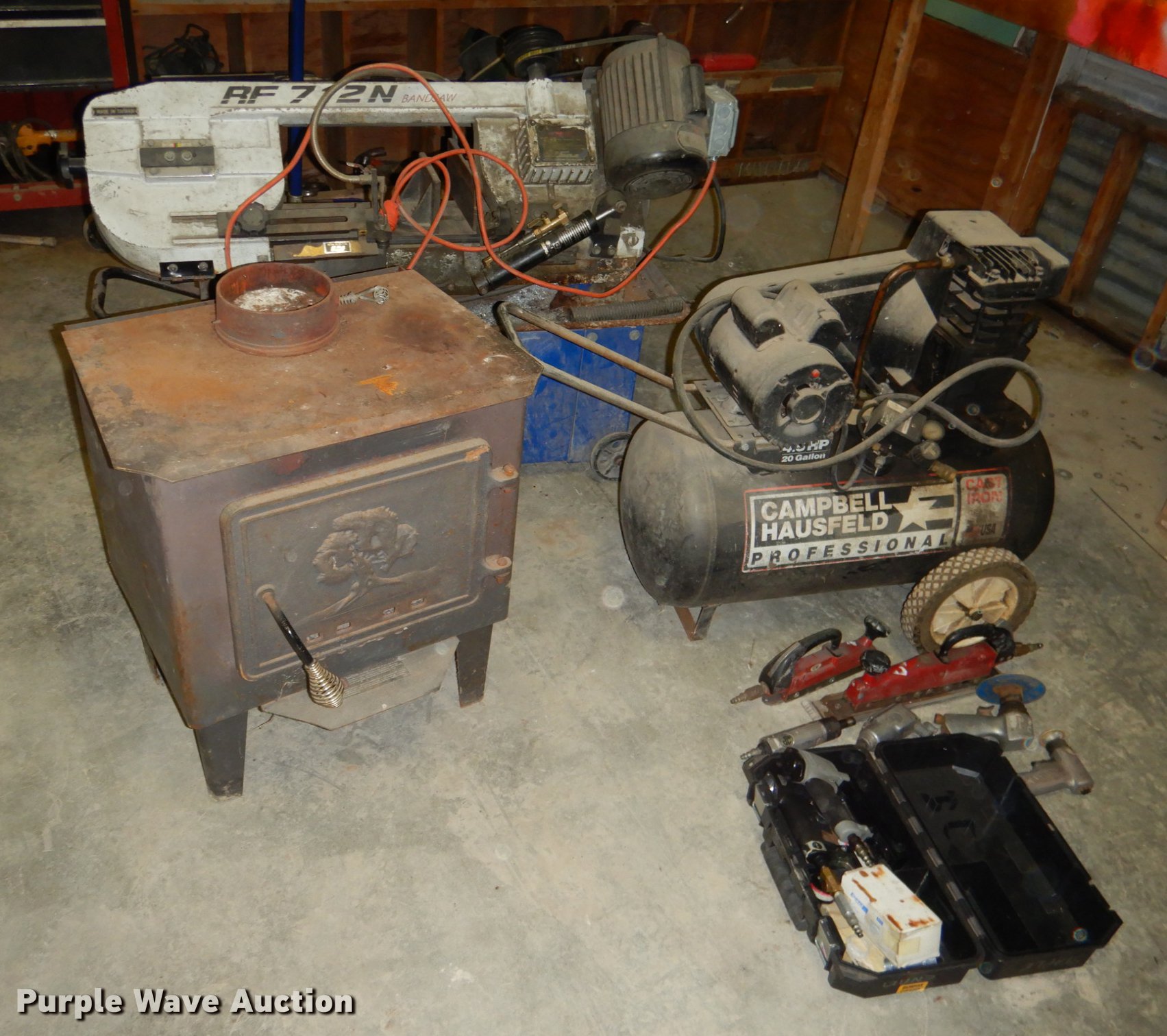 Purple Wave is selling a used Tools in Oklahoma. This item is a Tools with the following: RF712N bandsaw, Campbell Hausfield bandsaw, Air stapler, Wood stove, Air files, Bluepoint grinder